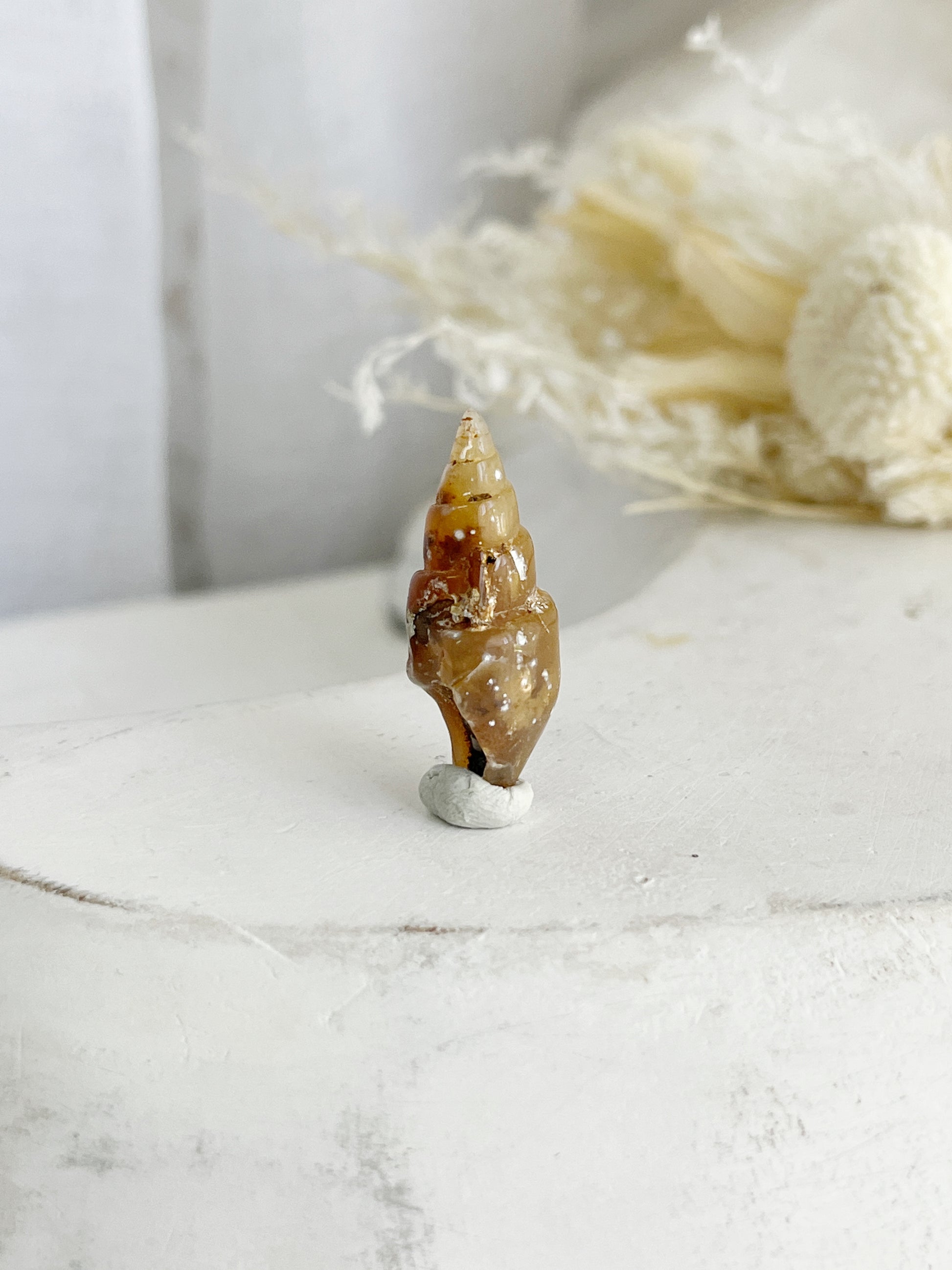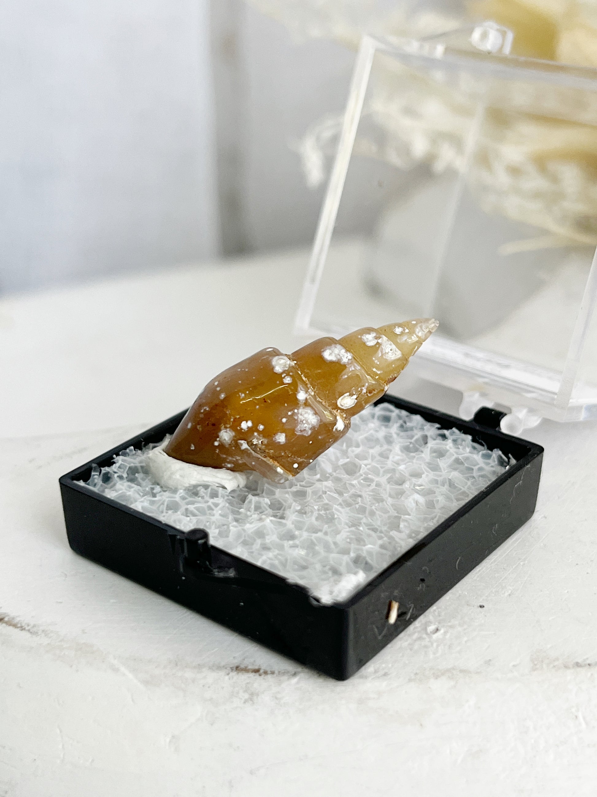 An Agate replace shell Is a fossil that, over a period of time, has been replaced with chalcedony. This happens through a process known as permineralization in which mineral rich groundwater seeps in and replaces the organic tissues with silica, forming a crystal cast or when a fossil has hollow spaces, that have been filled with chalcedony rather than just the organic material being replaced. This is common in shells where the soft parts decay leaving a cavity inside of the shell. The entire process can take over 10 million years.