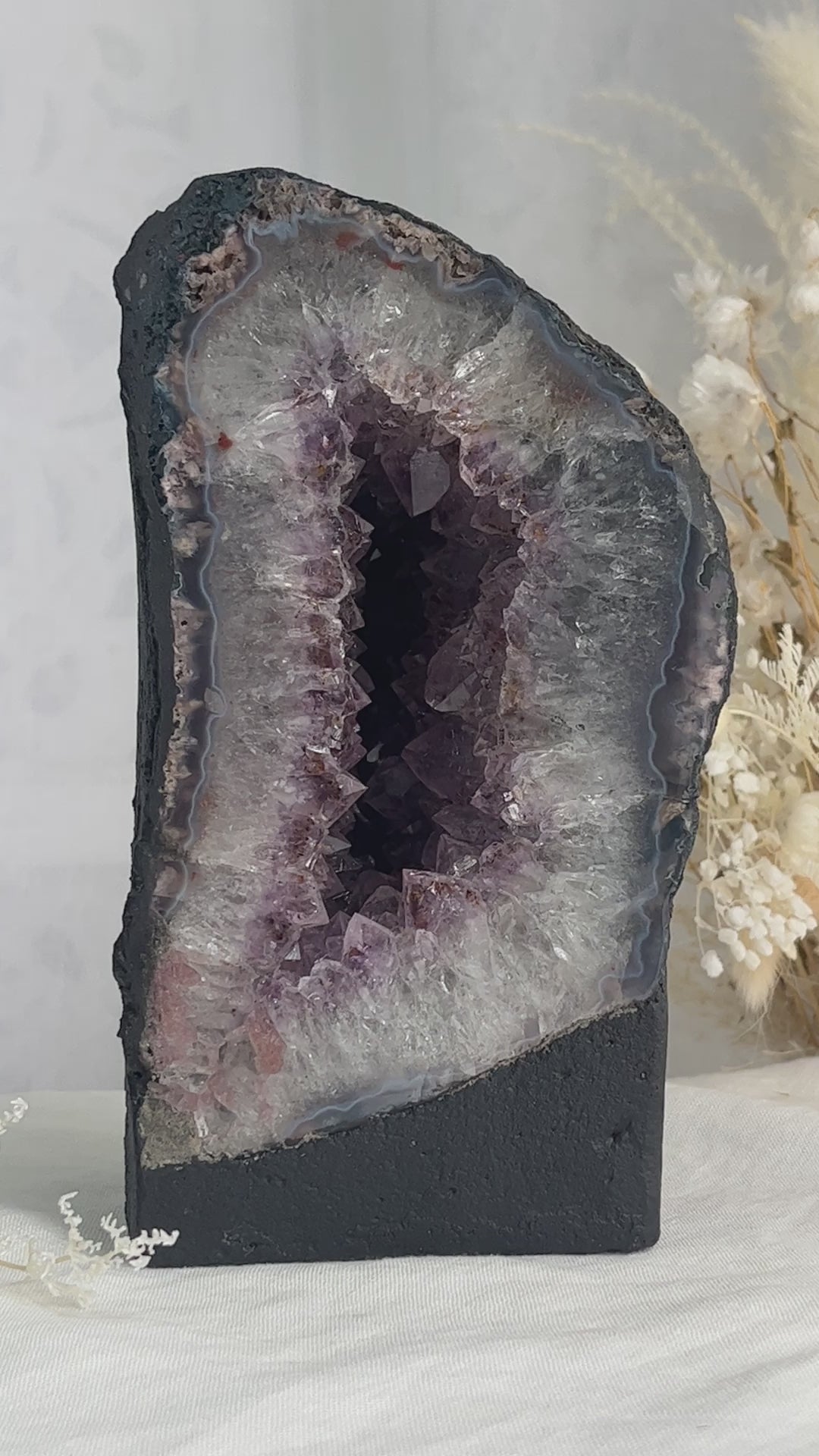 Amethyst emanates a gentle soothing vibration that assists to calm the mind, body + nerves. Fostering feelings of relaxation and tranquillity, It supports you in times of stress, anxiety + depression, and assists with deep peaceful sleep. By stimulating the Third Eye + Crown chakras, it enhances spiritual awareness and development, psychic + intuitive abilities and deepens meditative states. As a highly protective stone, Amethyst shields from negative energy. It encourages purification, trust, balance + stability, offering support in overcoming addictions.