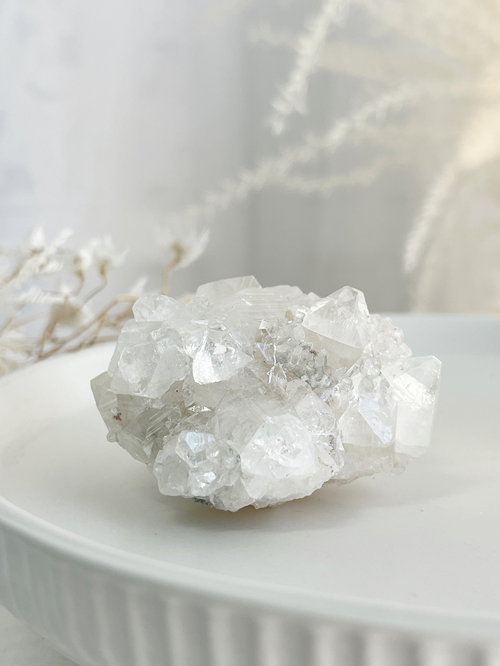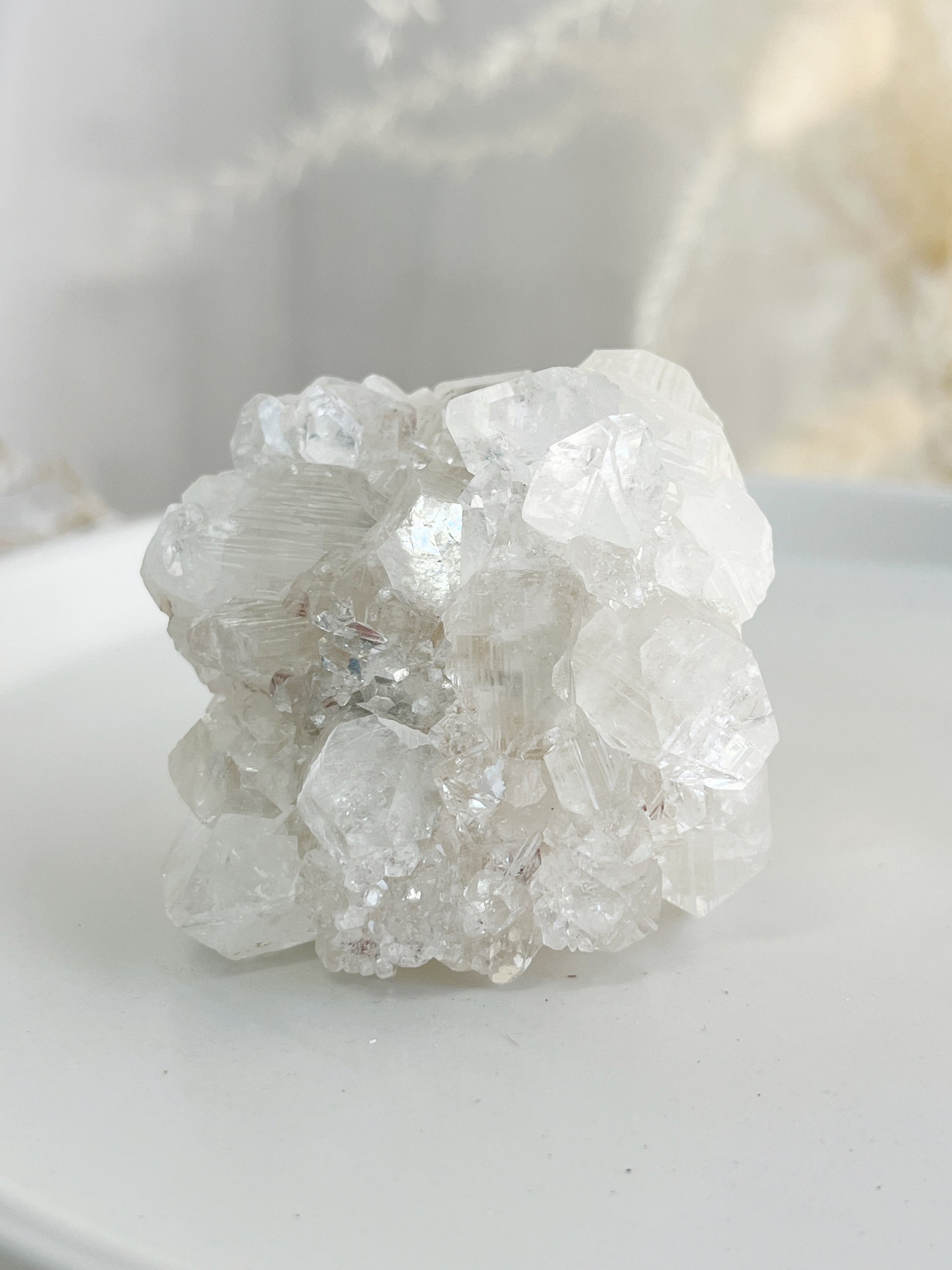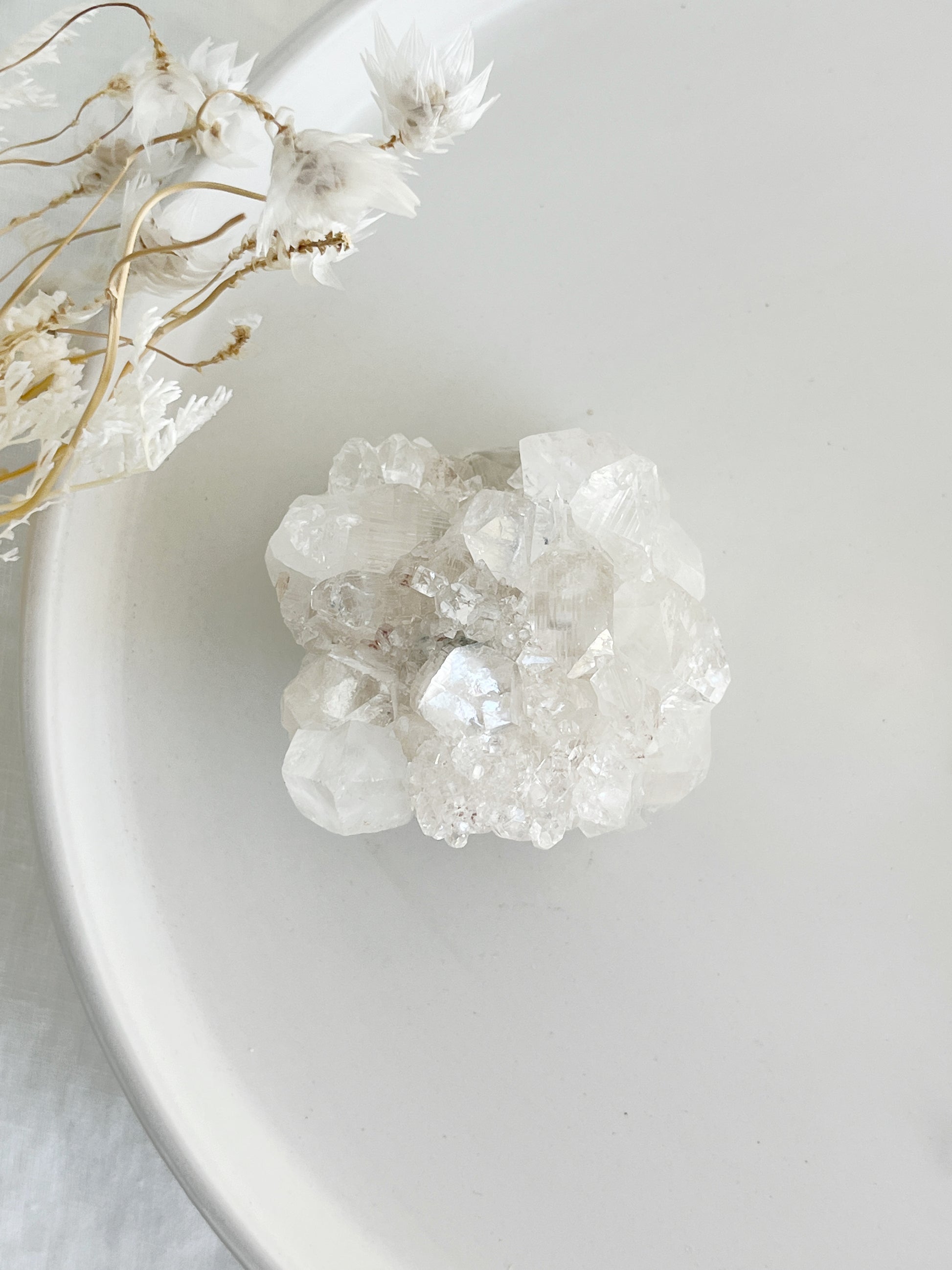 Apophyllite is a high vibrational stone that helps one attune to higher dimensions' + frequencies, enhancing your intuition, awareness + consciousness. Re-balancing the Aura, it assists with cleansing the body and mind of negativity + emotional trauma, especially from childhood. It supports in relieving stress + anxiety and guides us to be our true inner self. It encourages introspection, stimulating the release of negative behavior + patterns. Apophyllite amplifies the energy of other crystals + cleanses them and their surrounds while filling the area with high vibrational light energy.