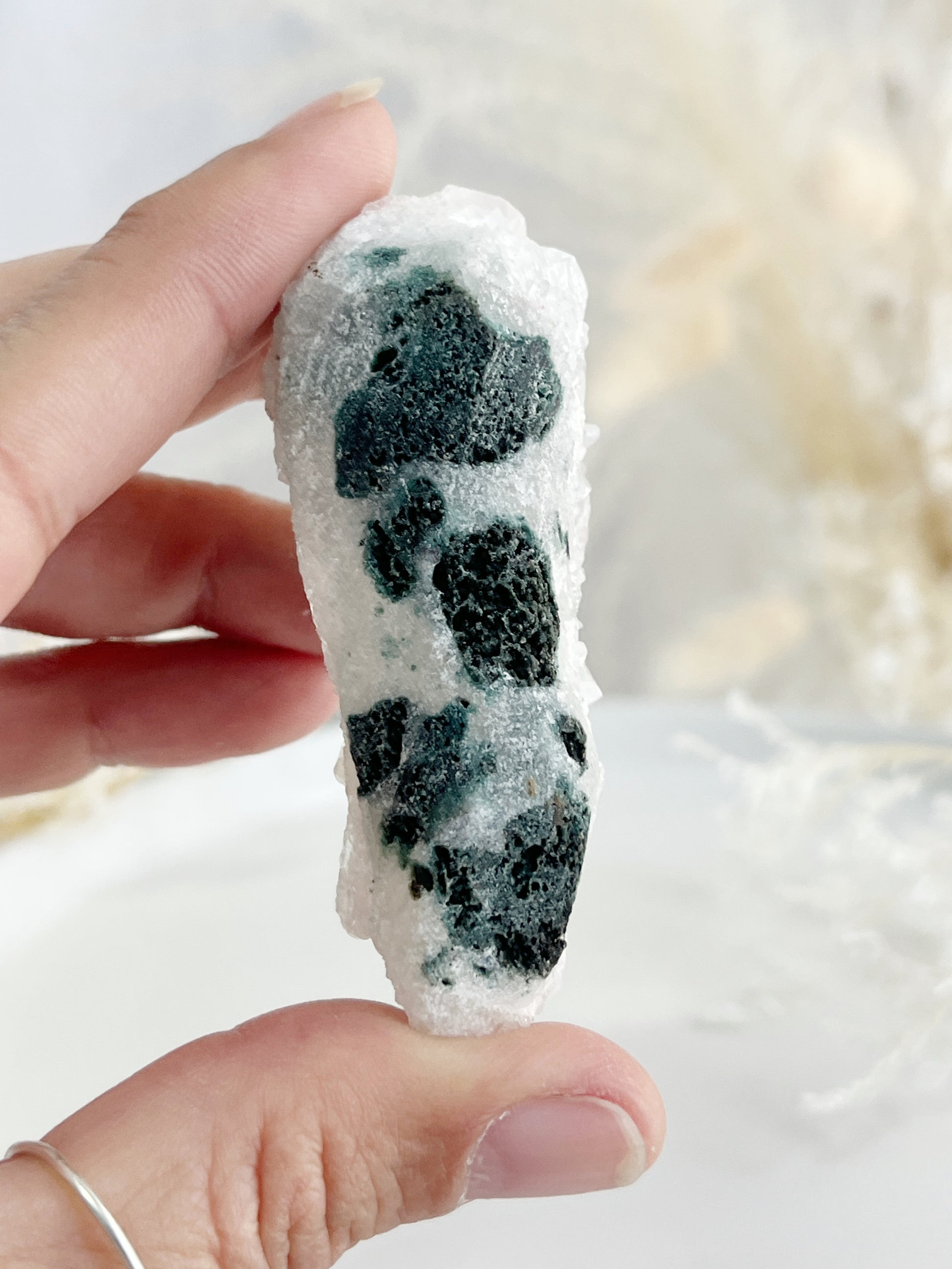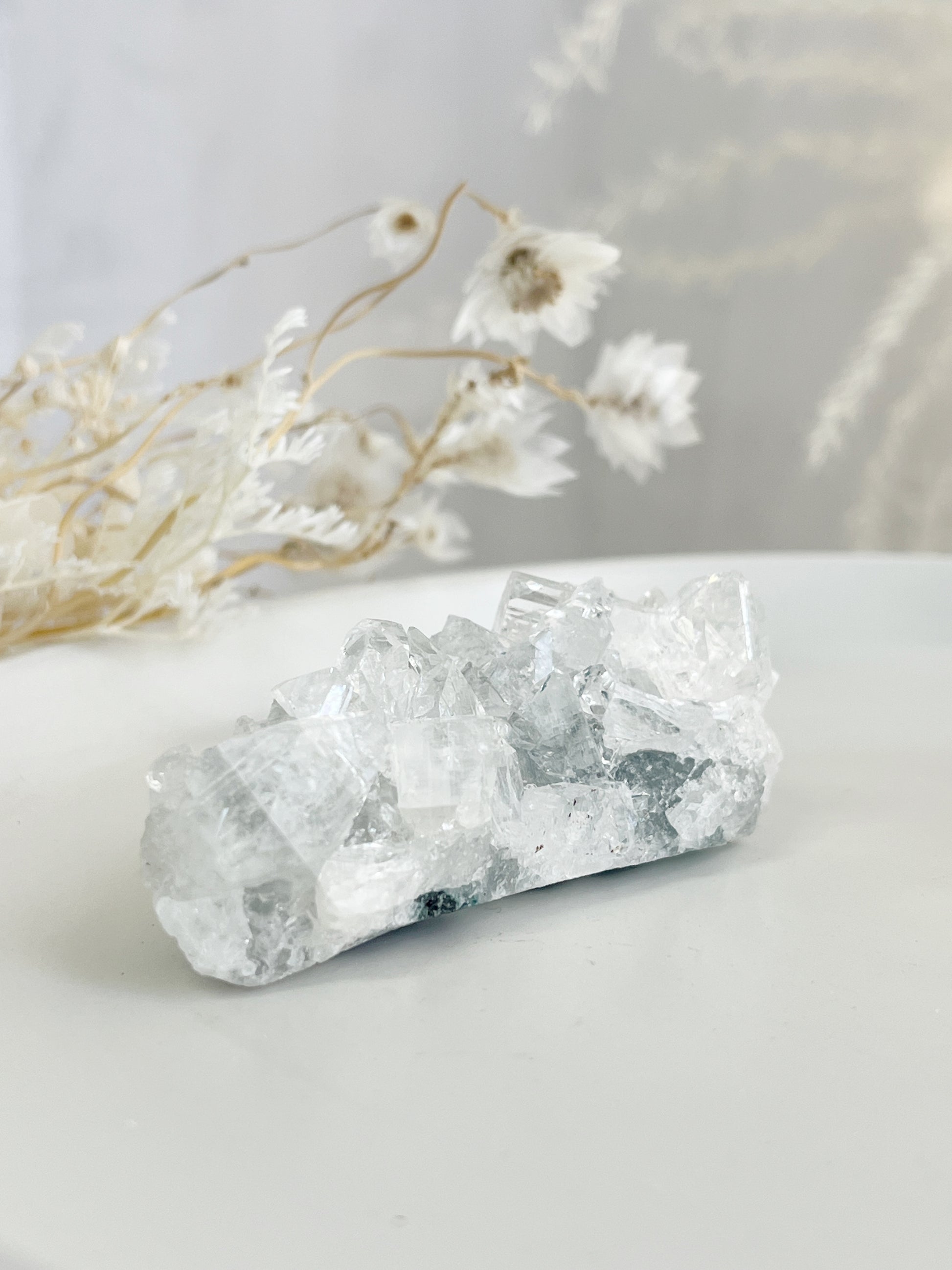 Apophyllite is a high vibrational stone that helps one attune to higher dimensions' + frequencies, enhancing your intuition, awareness + consciousness. Re-balancing the Aura, it assists with cleansing the body and mind of negativity + emotional trauma, especially from childhood. It supports in relieving stress + anxiety and guides us to be our true inner self. It encourages introspection, stimulating the release of negative behavior + patterns. Apophyllite amplifies the energy of other crystals + cleanses them and their surrounds while filling the area with high vibrational light energy.