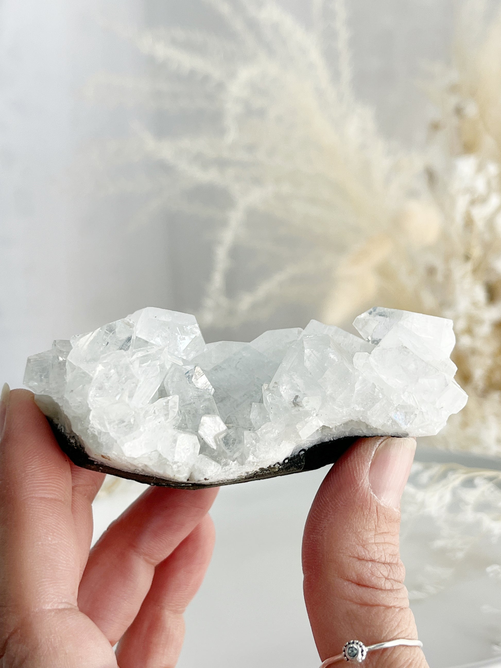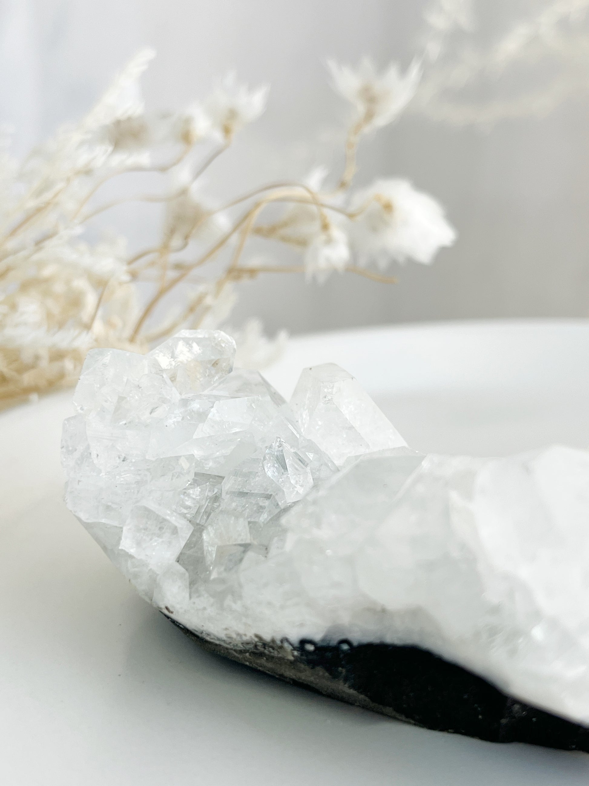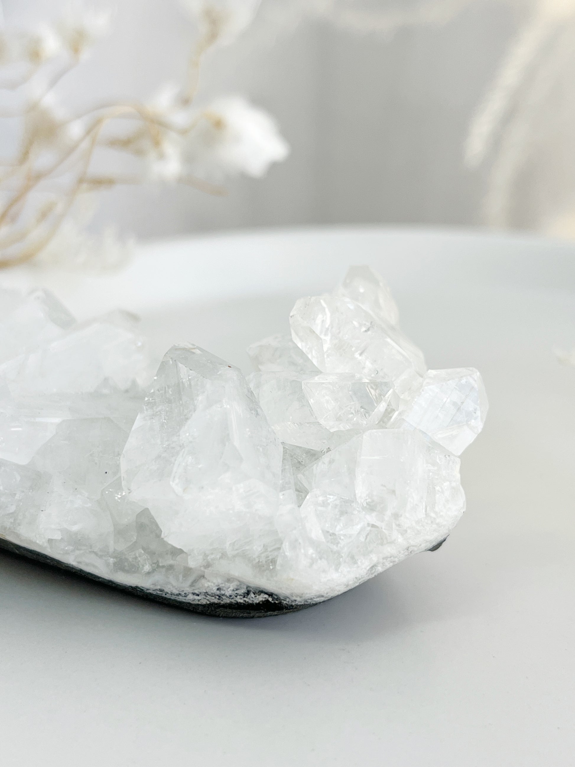 Apophyllite is a high vibrational stone that helps one attune to higher dimensions' + frequencies, enhancing your intuition, awareness + consciousness. Re-balancing the Aura, it assists with cleansing the body and mind of negativity + emotional trauma, especially from childhood. It supports in relieving stress + anxiety and guides us to be our true inner self. It encourages introspection, stimulating the release of negative behavior + patterns. Apophyllite amplifies the energy of other crystals + cleanses them and their surrounds while filling the area with high vibrational light energy.