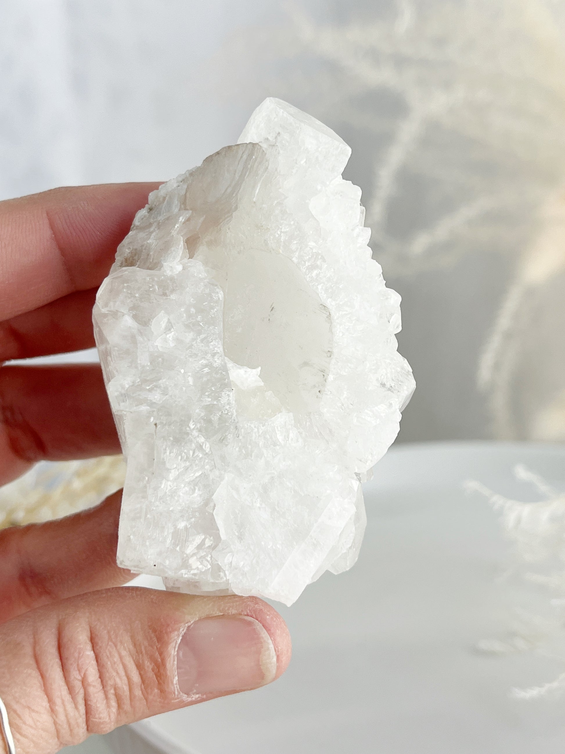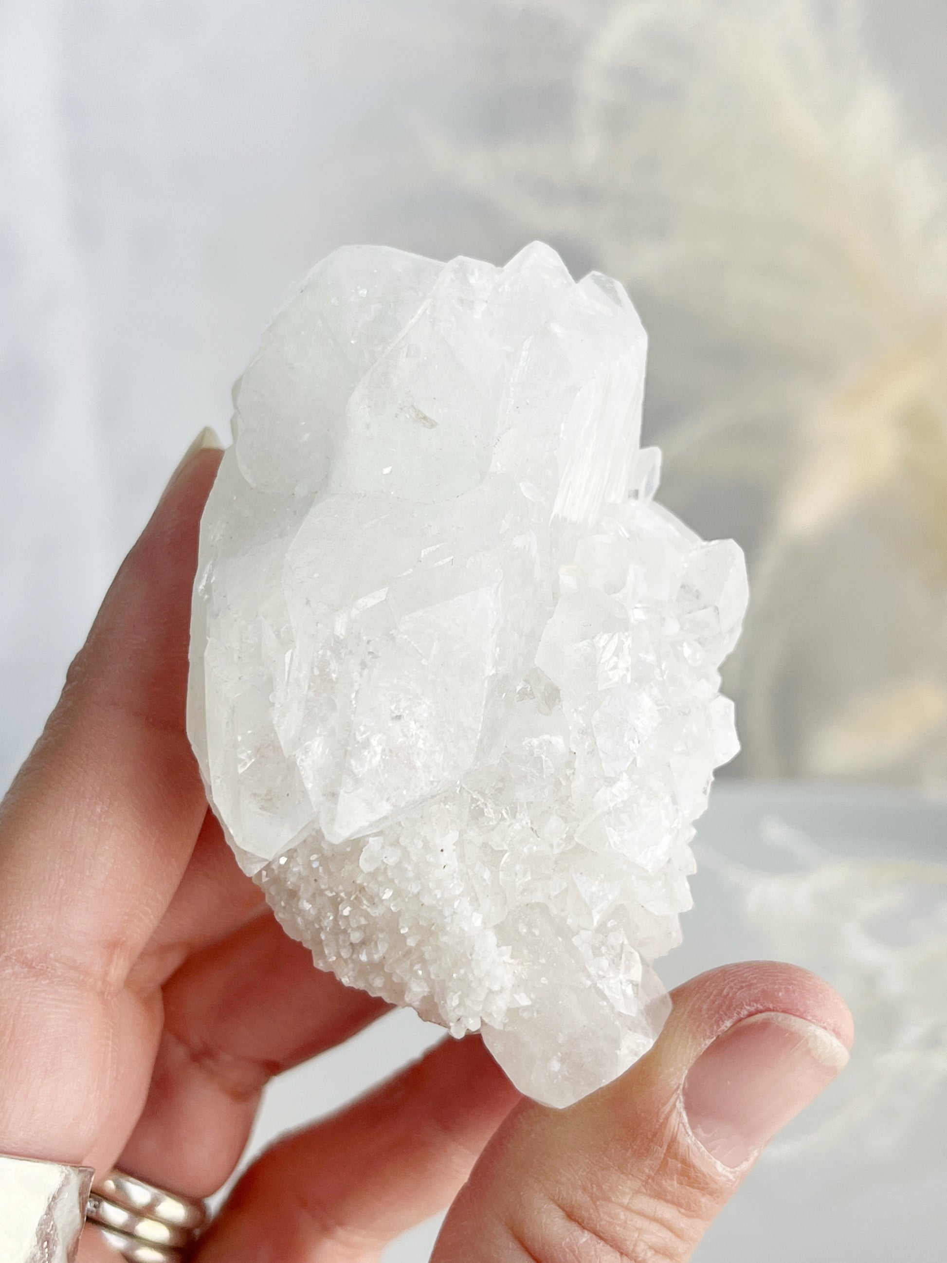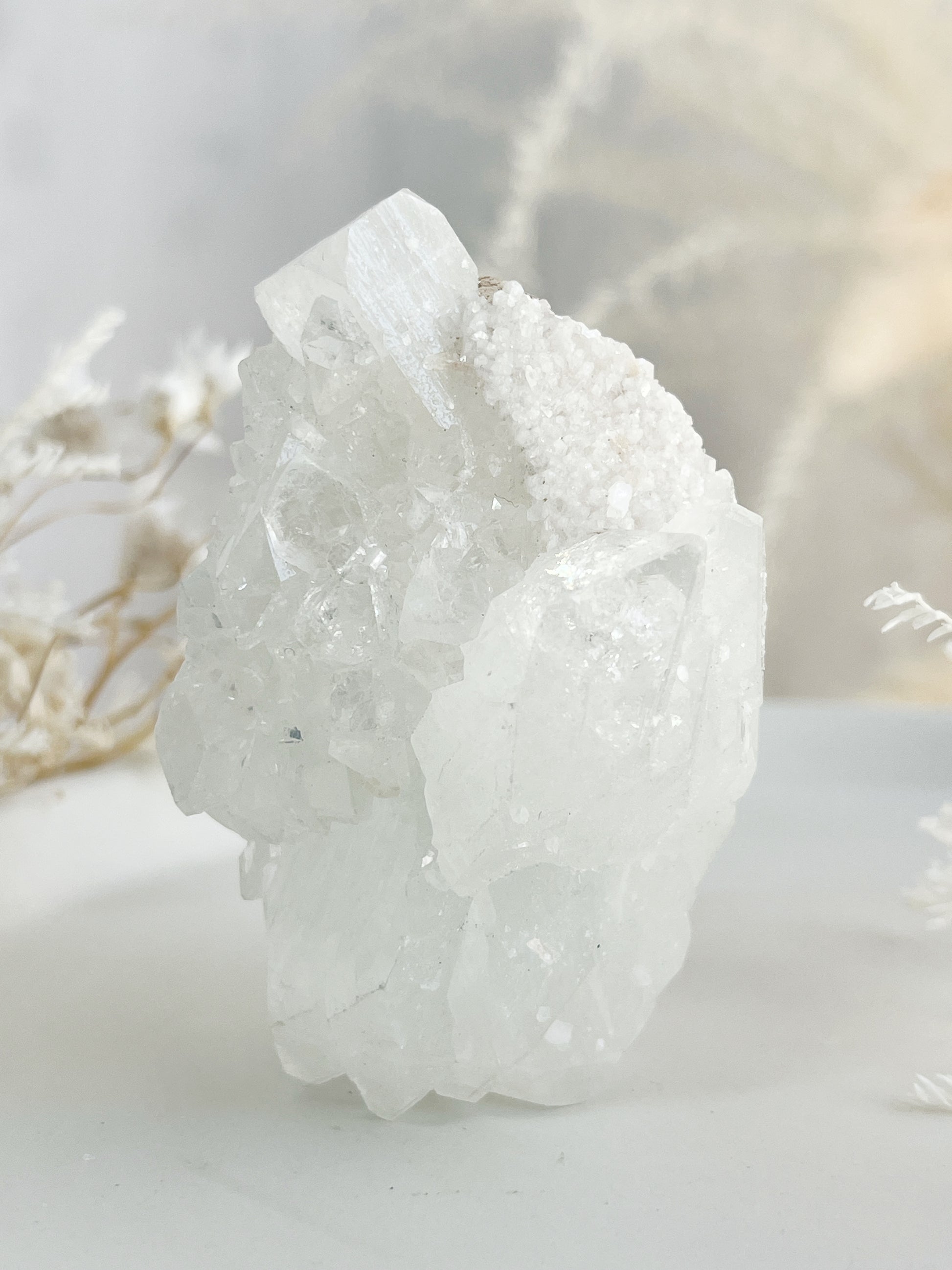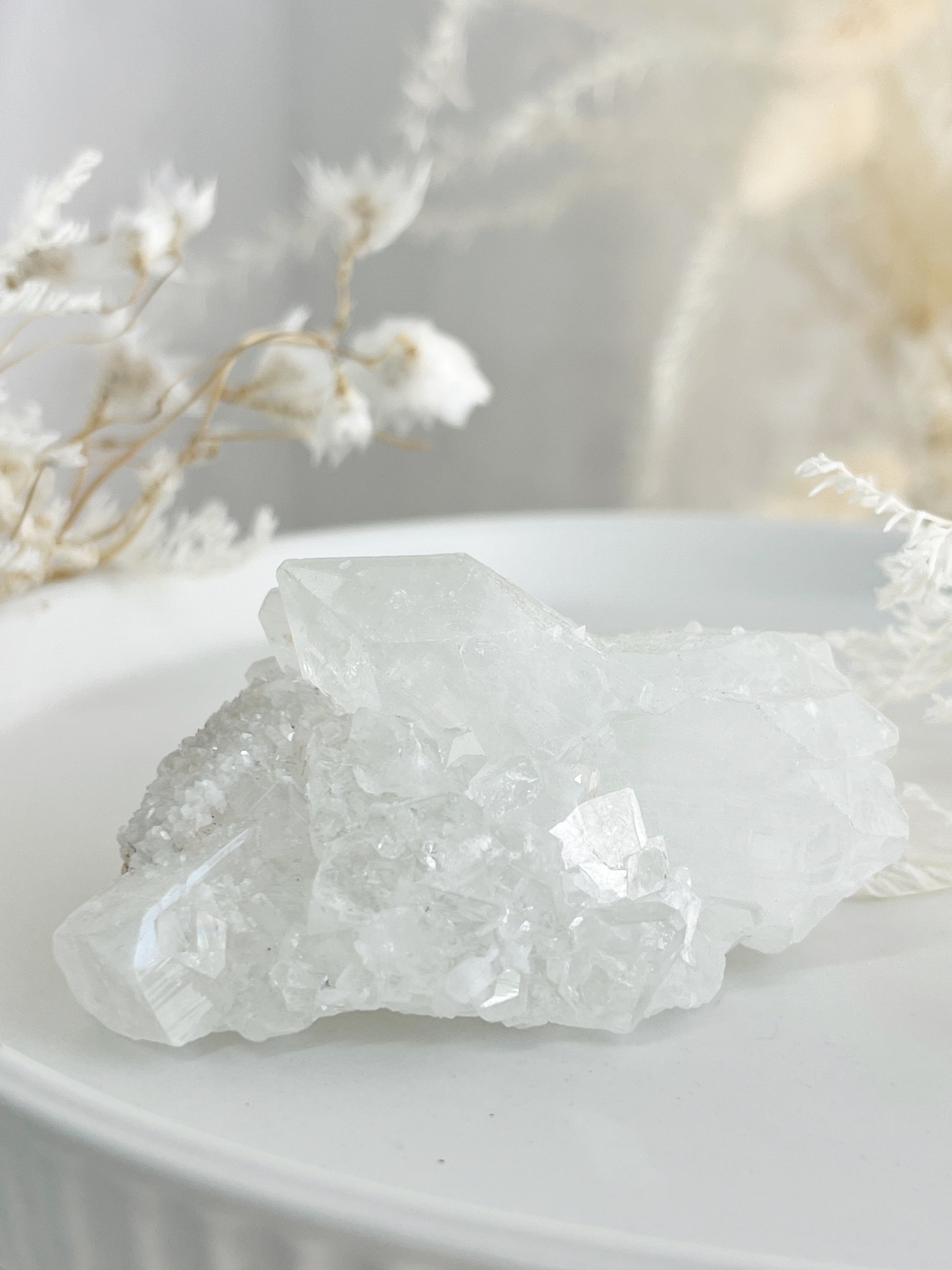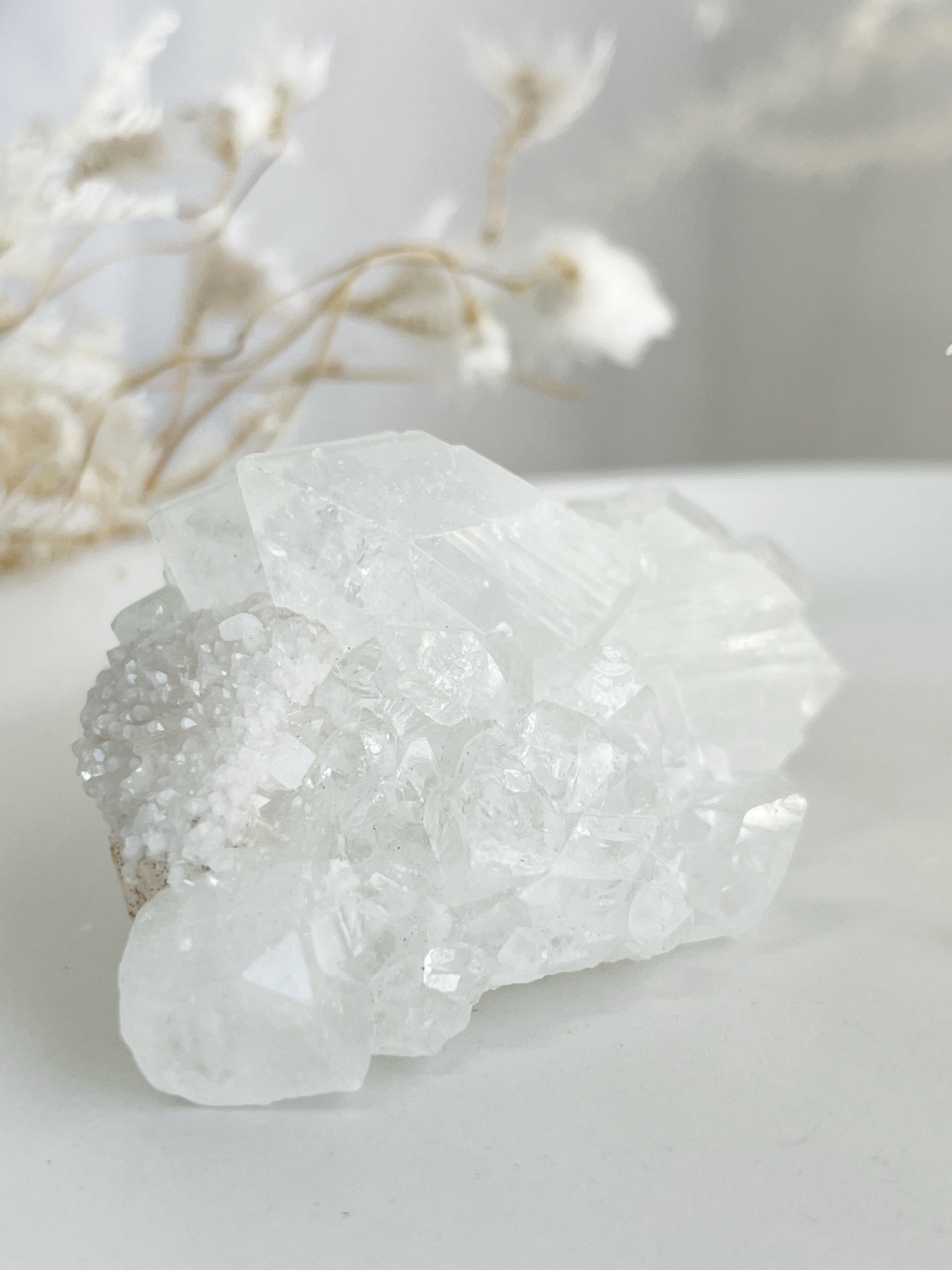 Apophyllite is a high vibrational stone that helps one attune to higher dimensions' + frequencies, enhancing your intuition, awareness + consciousness. Re-balancing the Aura, it assists with cleansing the body and mind of negativity + emotional trauma, especially from childhood. It supports in relieving stress + anxiety and guides us to be our true inner self. It encourages introspection, stimulating the release of negative behavior + patterns. Apophyllite amplifies the energy of other crystals + cleanses them and their surrounds while filling the area with high vibrational light energy.