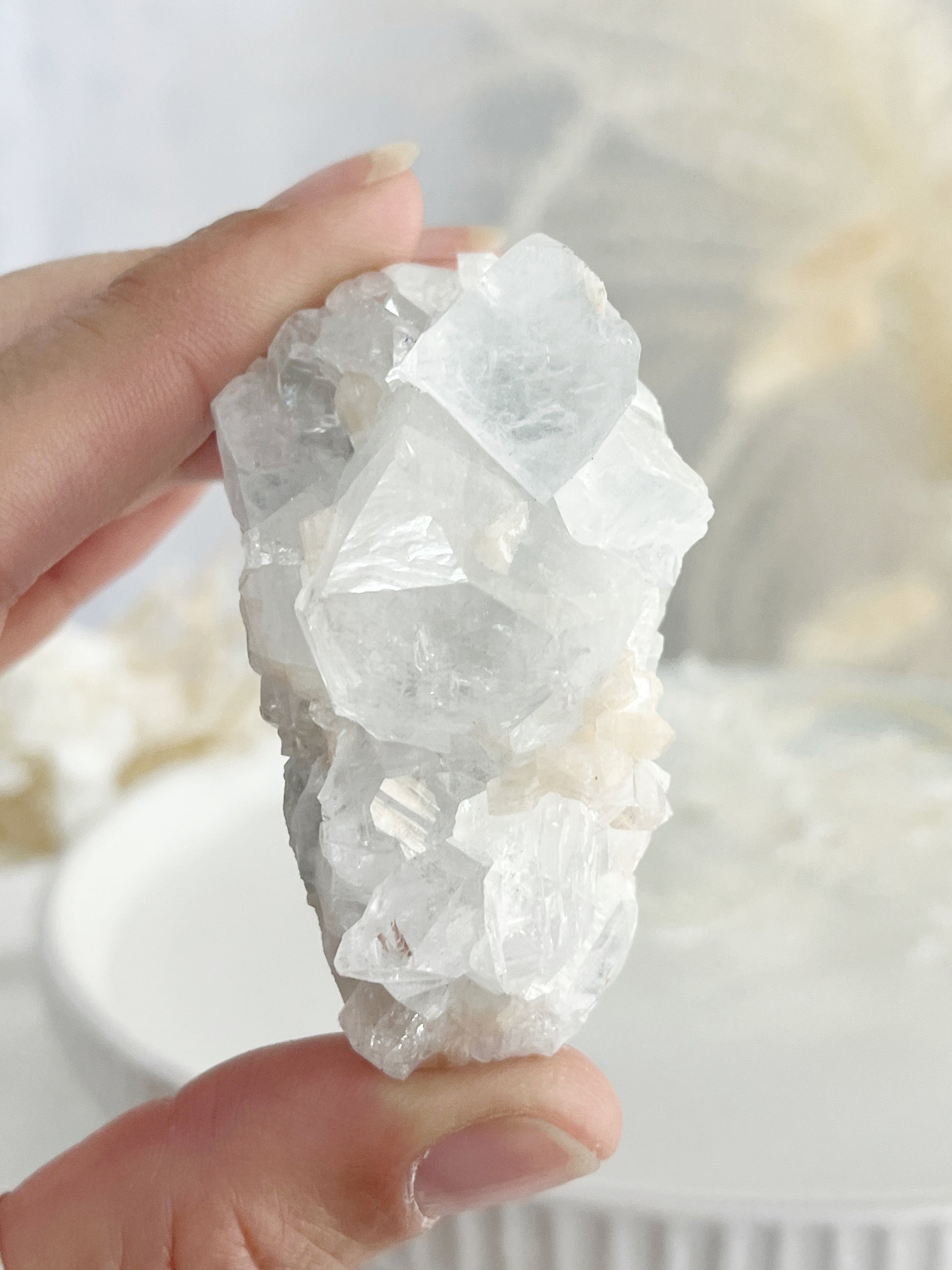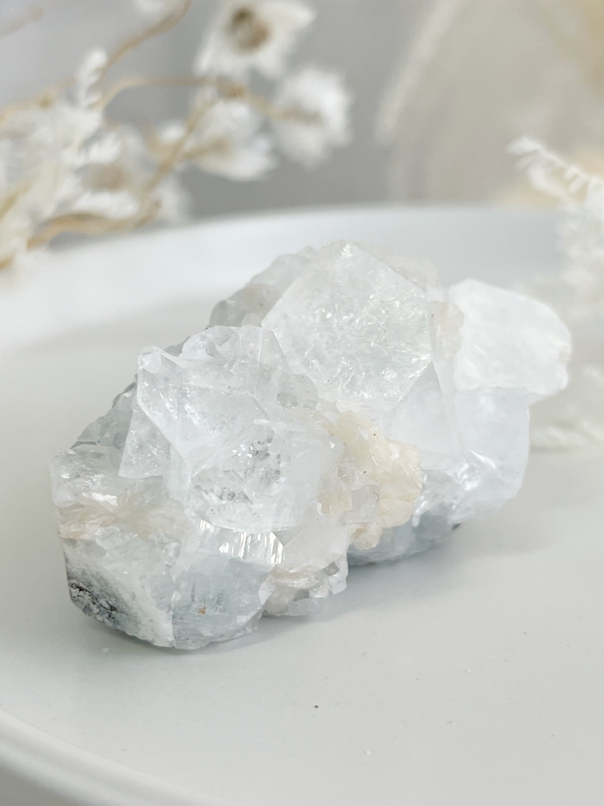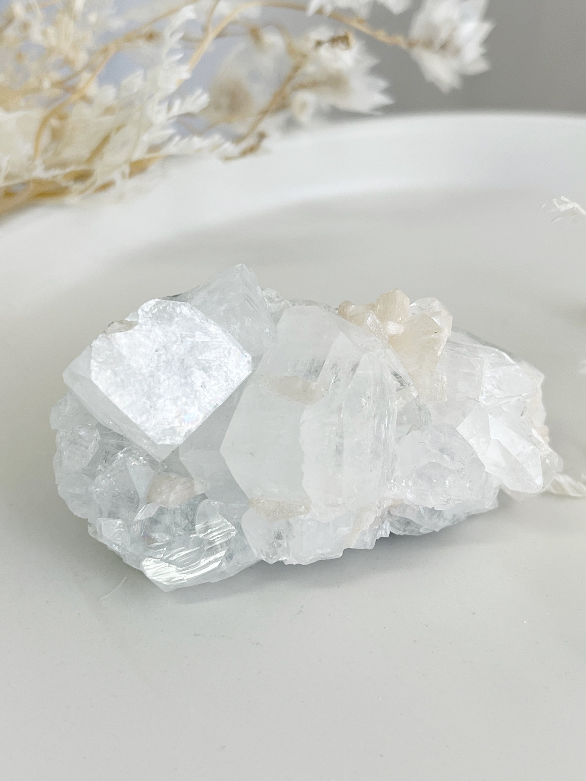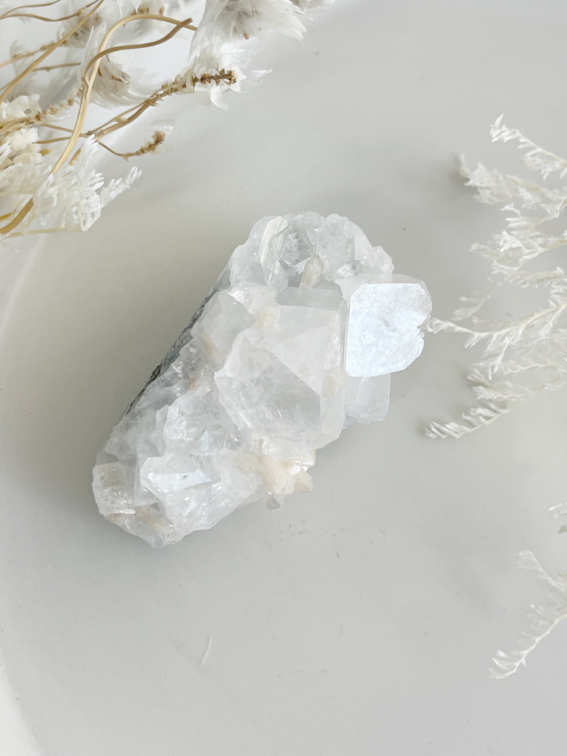 Apophyllite is a high vibrational stone that helps one attune to higher dimensions' + frequencies, enhancing your intuition, awareness + consciousness. Re-balancing the Aura, it assists with cleansing the body and mind of negativity + emotional trauma, especially from childhood. It supports in relieving stress + anxiety and guides us to be our true inner self. It encourages introspection, stimulating the release of negative behavior + patterns. Apophyllite amplifies the energy of other crystals + cleanses them and their surrounds while filling the area with high vibrational light energy.