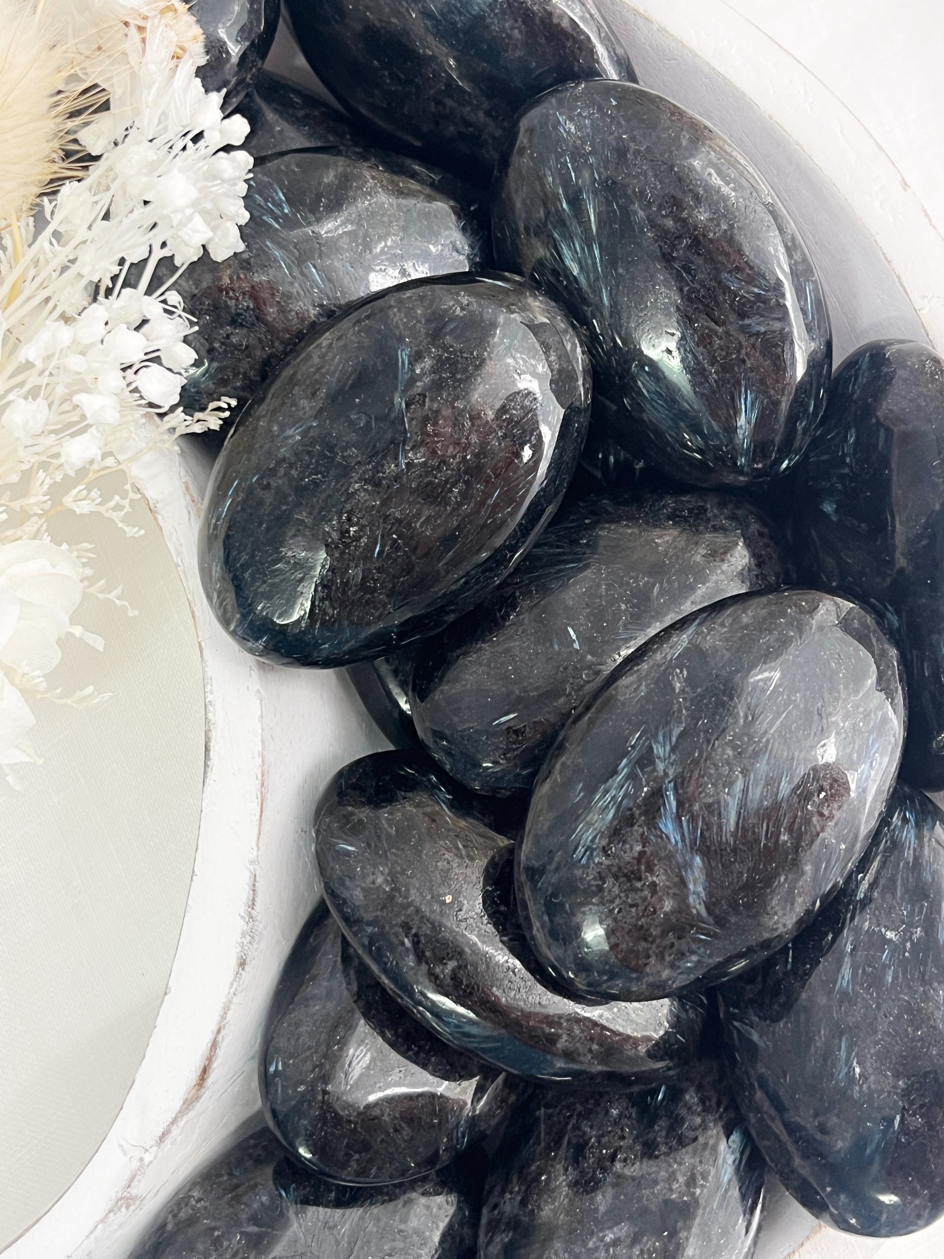 Included is one Arfvedsonite palmstone, intuitively chosen by us. As stone is unique, each may vary in size, shape + colour.