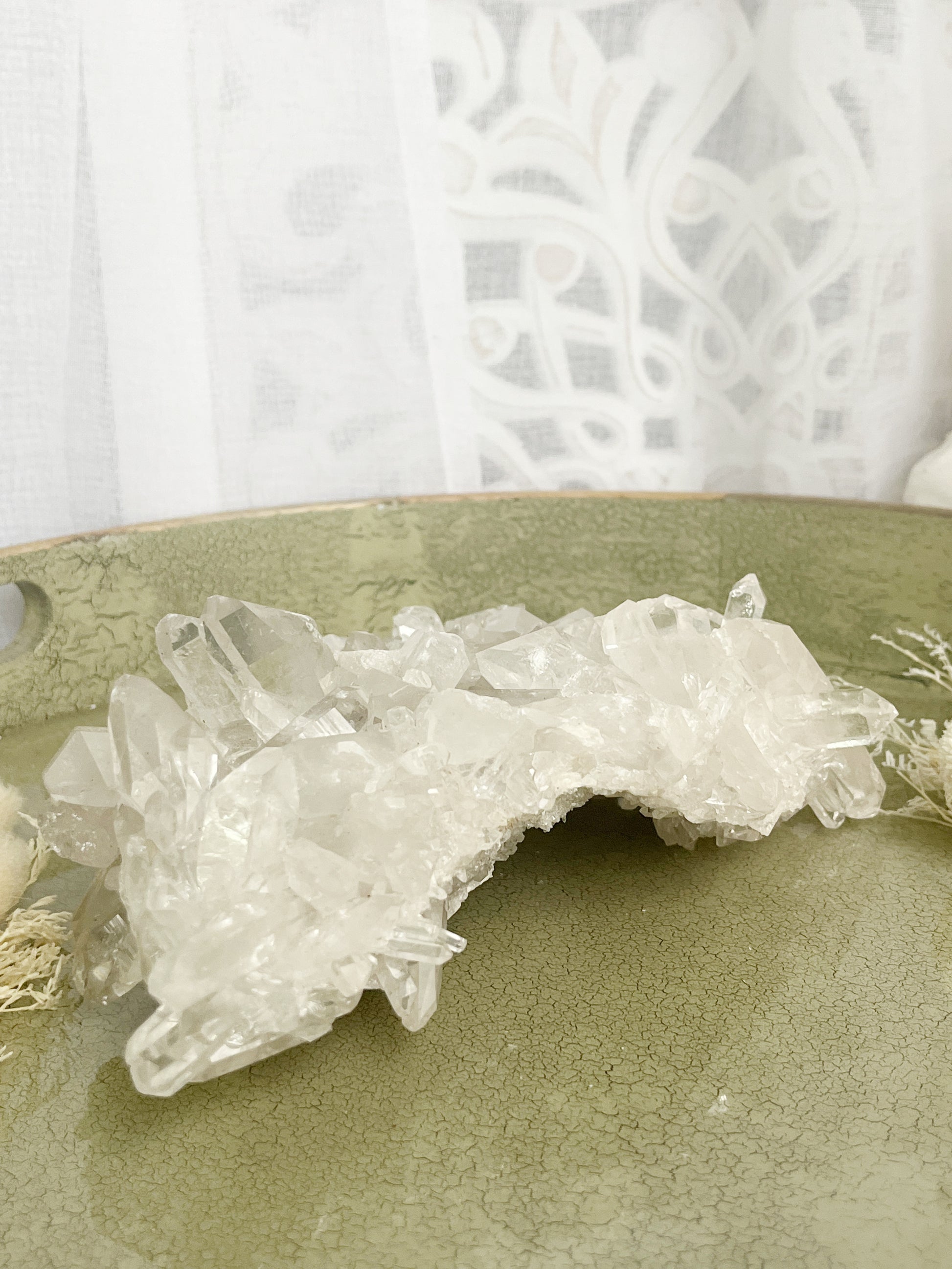 Clear Quartz is a high vibrational stone that will amplify the energy around it including that of other crystals. It radiates positive energy into the surrounding area lifting it to a higher, lighter vibration. Clear Quartz assists in opening up the mind while clearing negativity and blockages, bringing clarity on all levels. It supports you in expanding your auric field and consciousness and is a valuable tool to enhance + develop psychic or intuitive abilities. It opens up clear communication with your guides + higher realms. It is a highly + easily programmable stone to assist with any intention. Guide to program Quartz HERE.