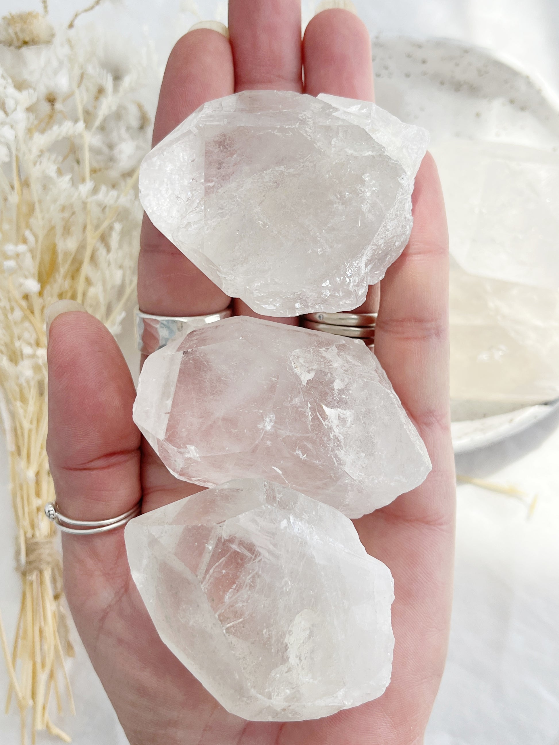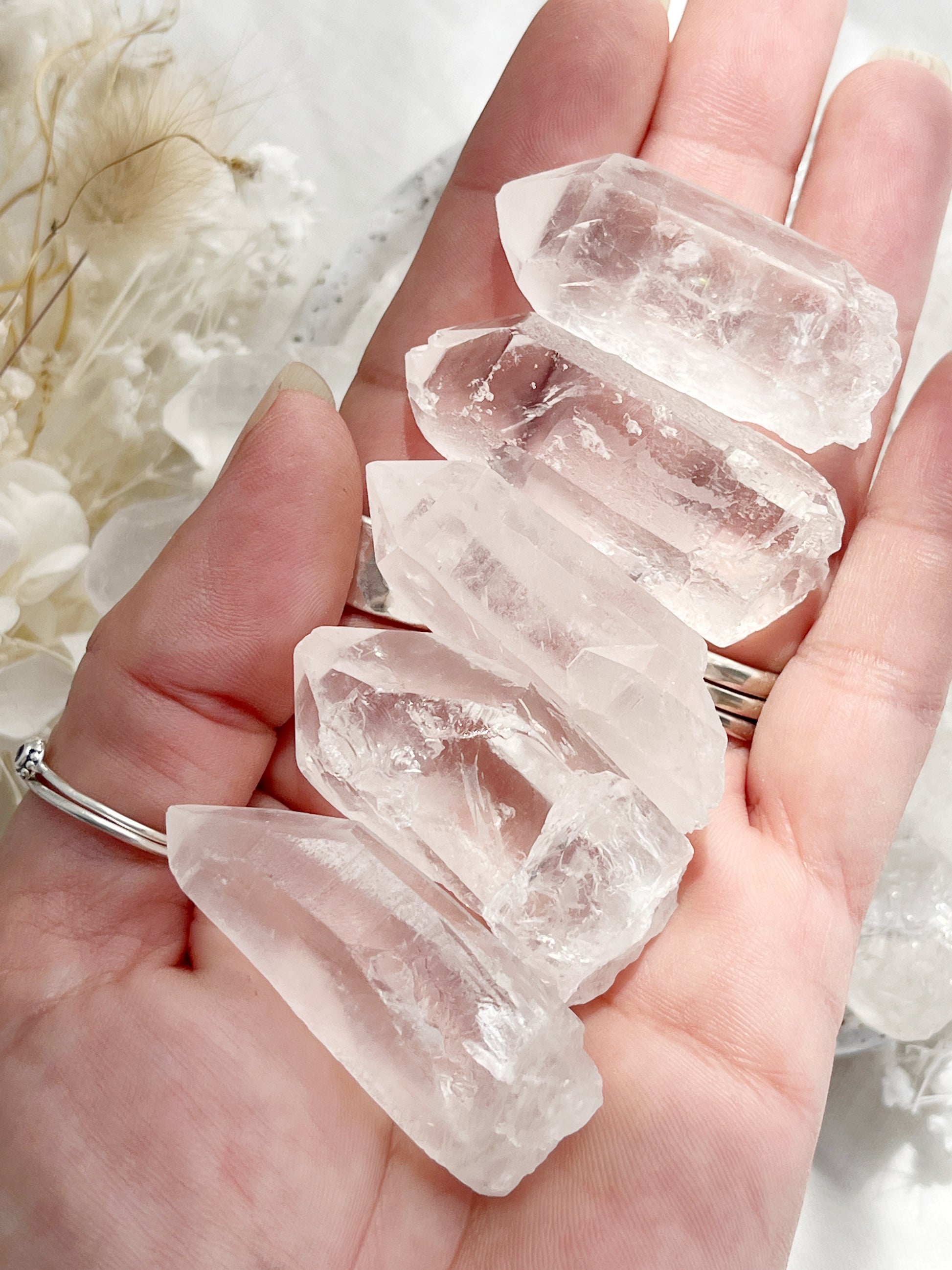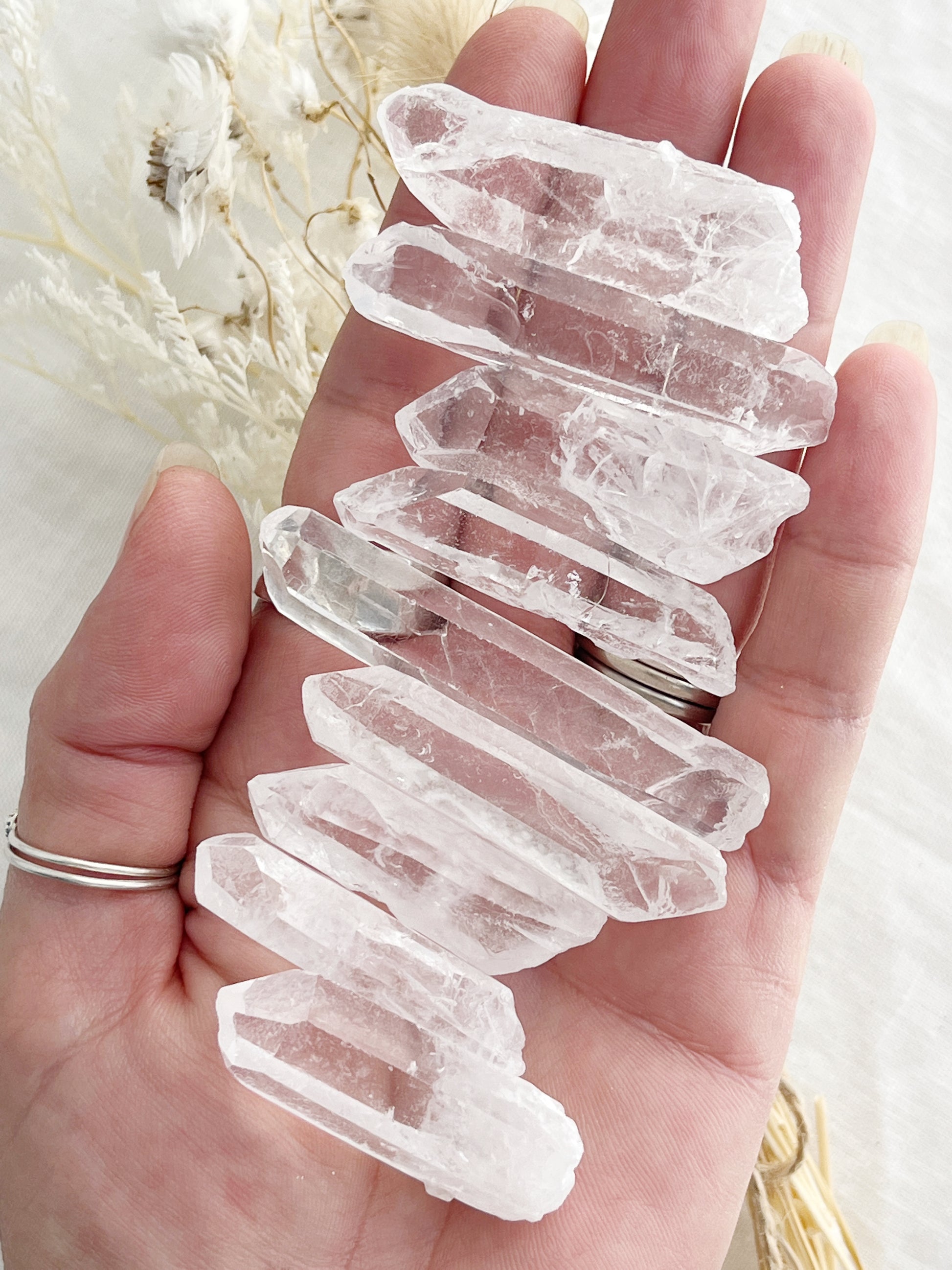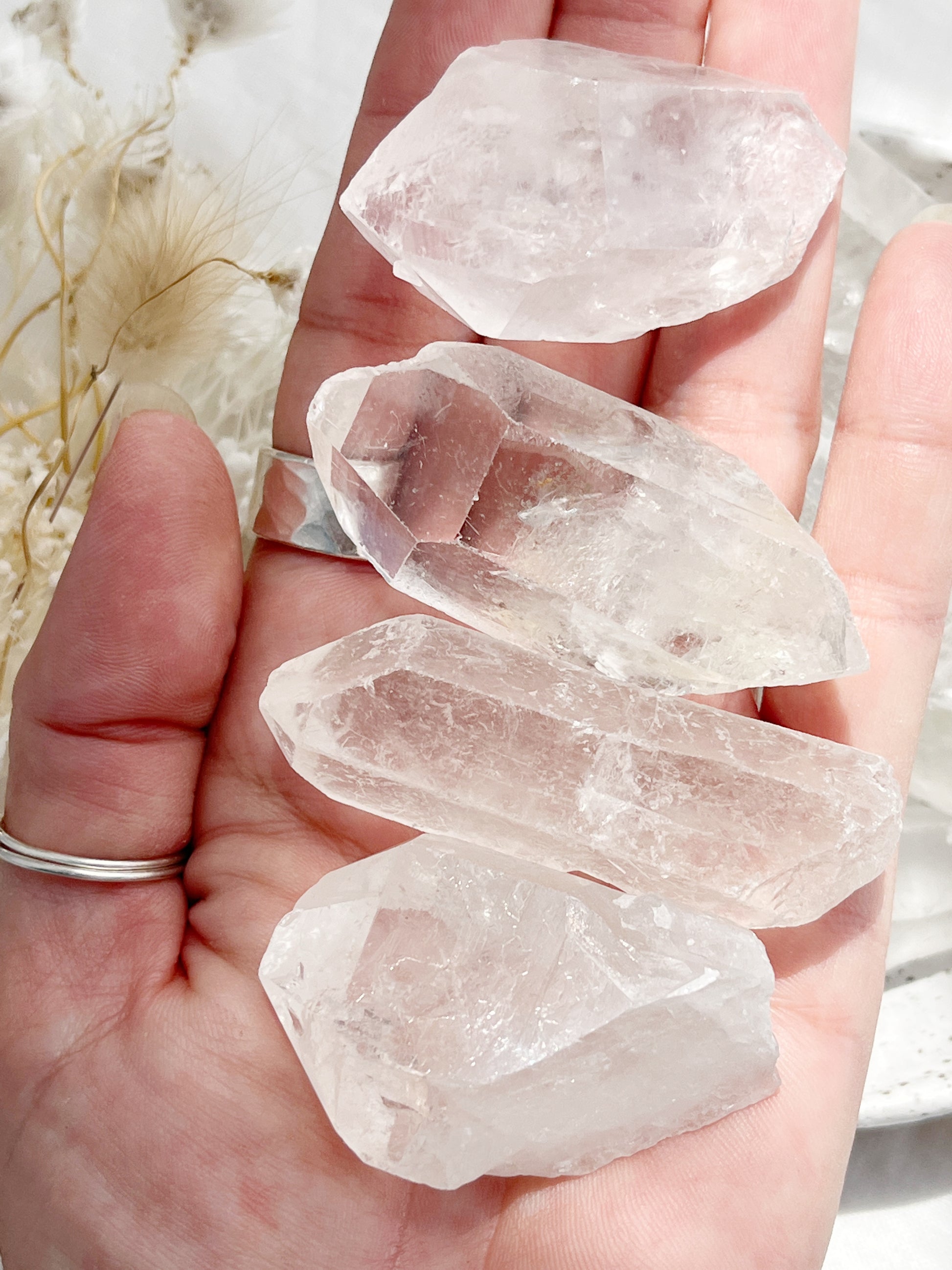 Clear Quartz is a high vibrational stone that will amplify the energy around it including that of other crystals. It radiates positive energy into the surrounding area lifting it to a higher, lighter vibration. Clear Quartz assists in opening up the mind while clearing negativity and blockages, bringing clarity on all levels. It supports you in expanding your auric field and consciousness and is a valuable tool to enhance + develop psychic or intuitive abilities. It opens up clear communication with your guides + higher realms. It is a highly + easily programmable stone to assist with any intention. Guide to program Quartz HERE.