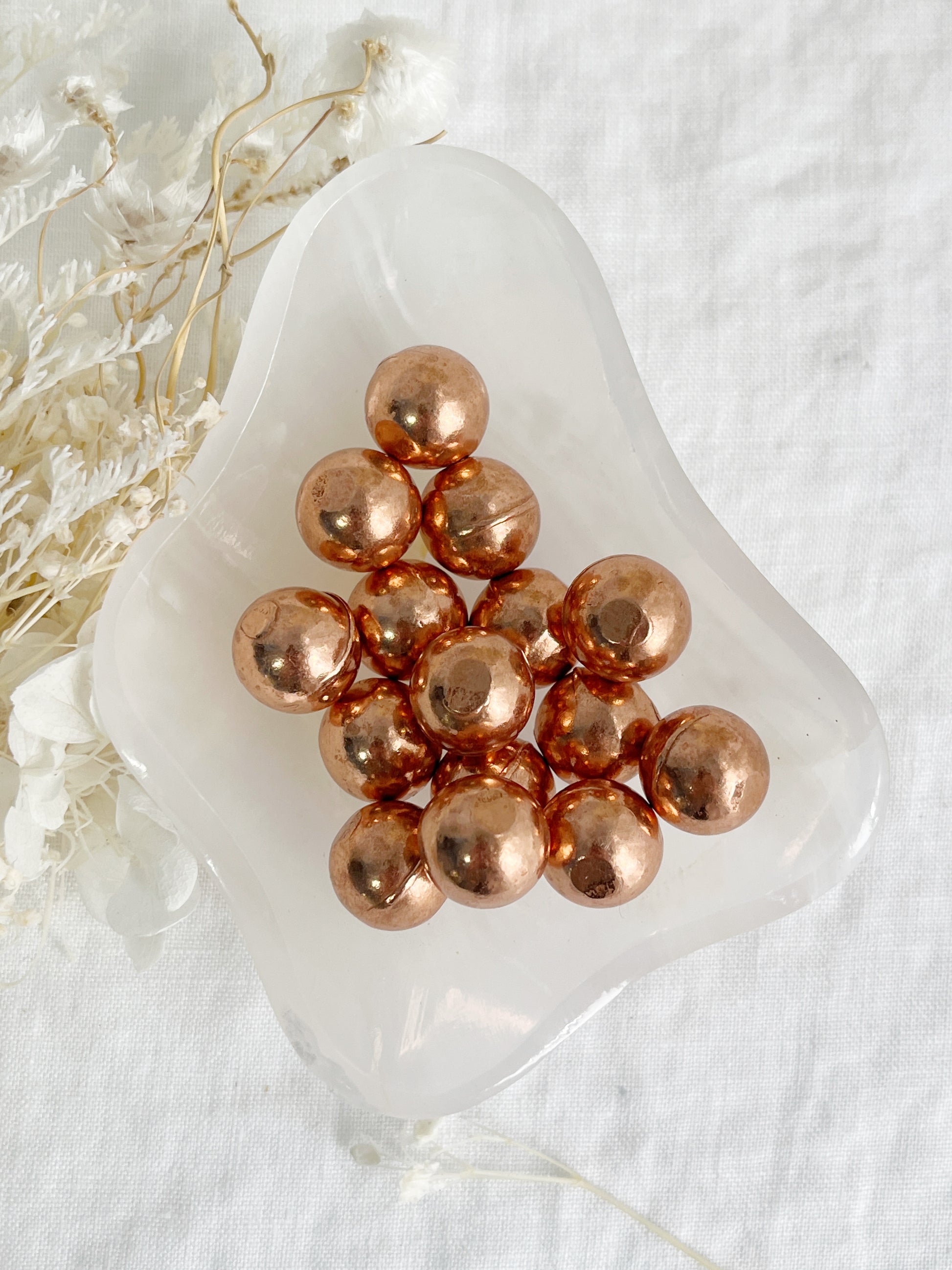 Copper is an ancient metal of channelling energy. It is a conduit that grounds and transfers vibrational frequency from the spiritual to the physical. It assists in activating one’s cellular knowledge, clearing negative energy, and instilling positivity + mental clarity. Bringing balance and strength to the body systems, it not only assists in harmonising and healing the physical body but also the Auric field, while assisting with improving blood and oxygen circulation and flow. Copper is said to also be useful in fertility as it balances the reproductive system.