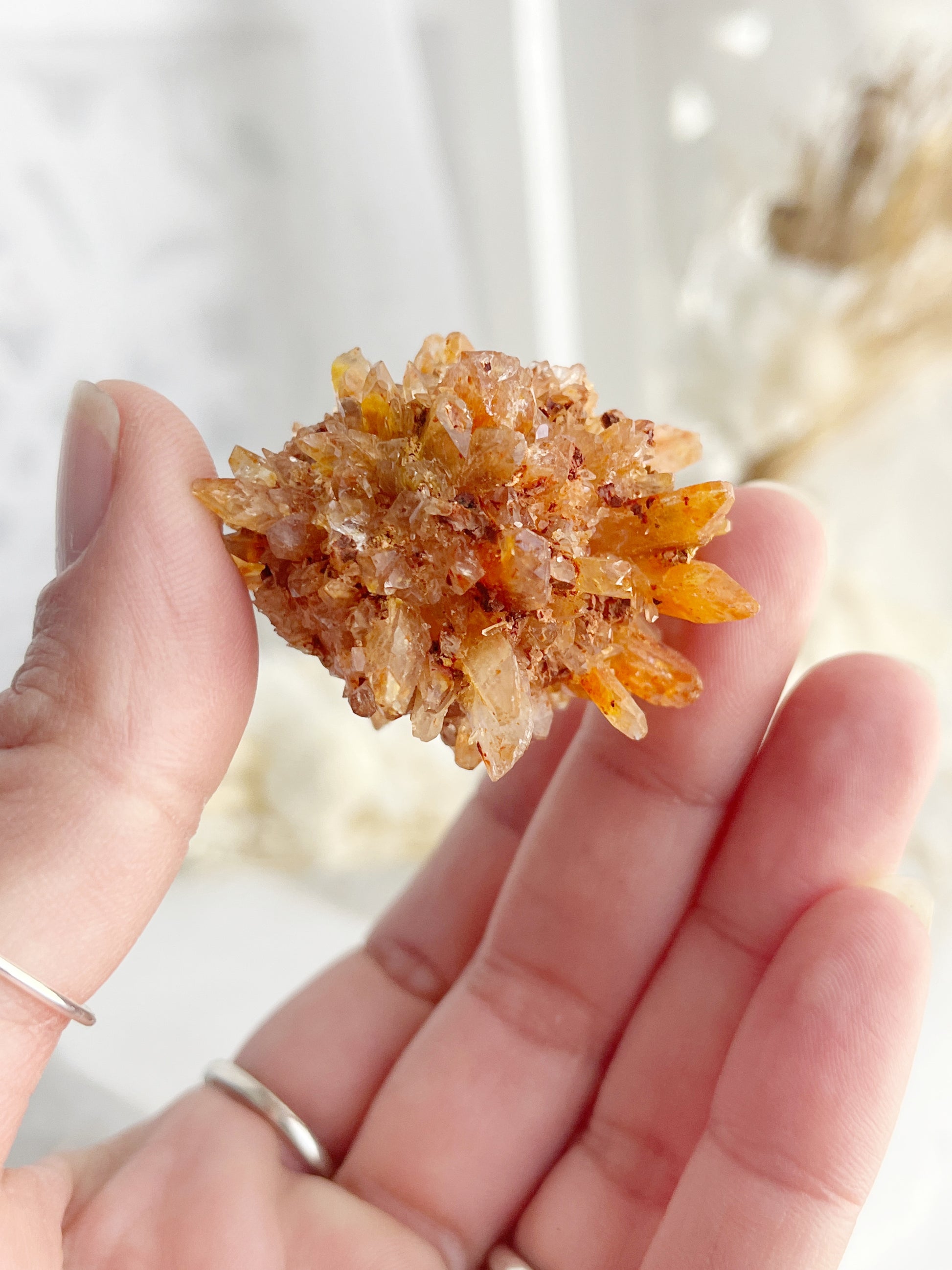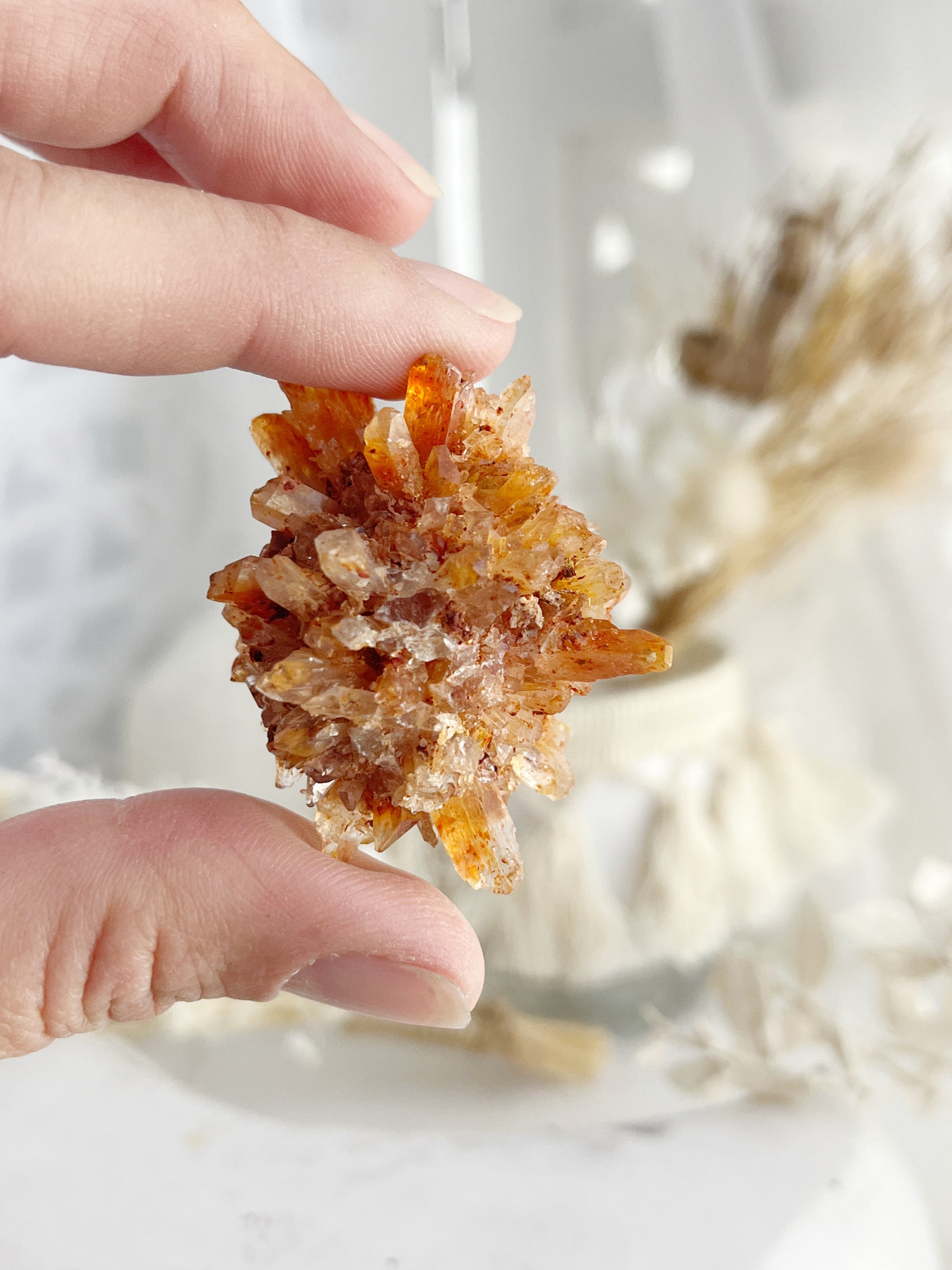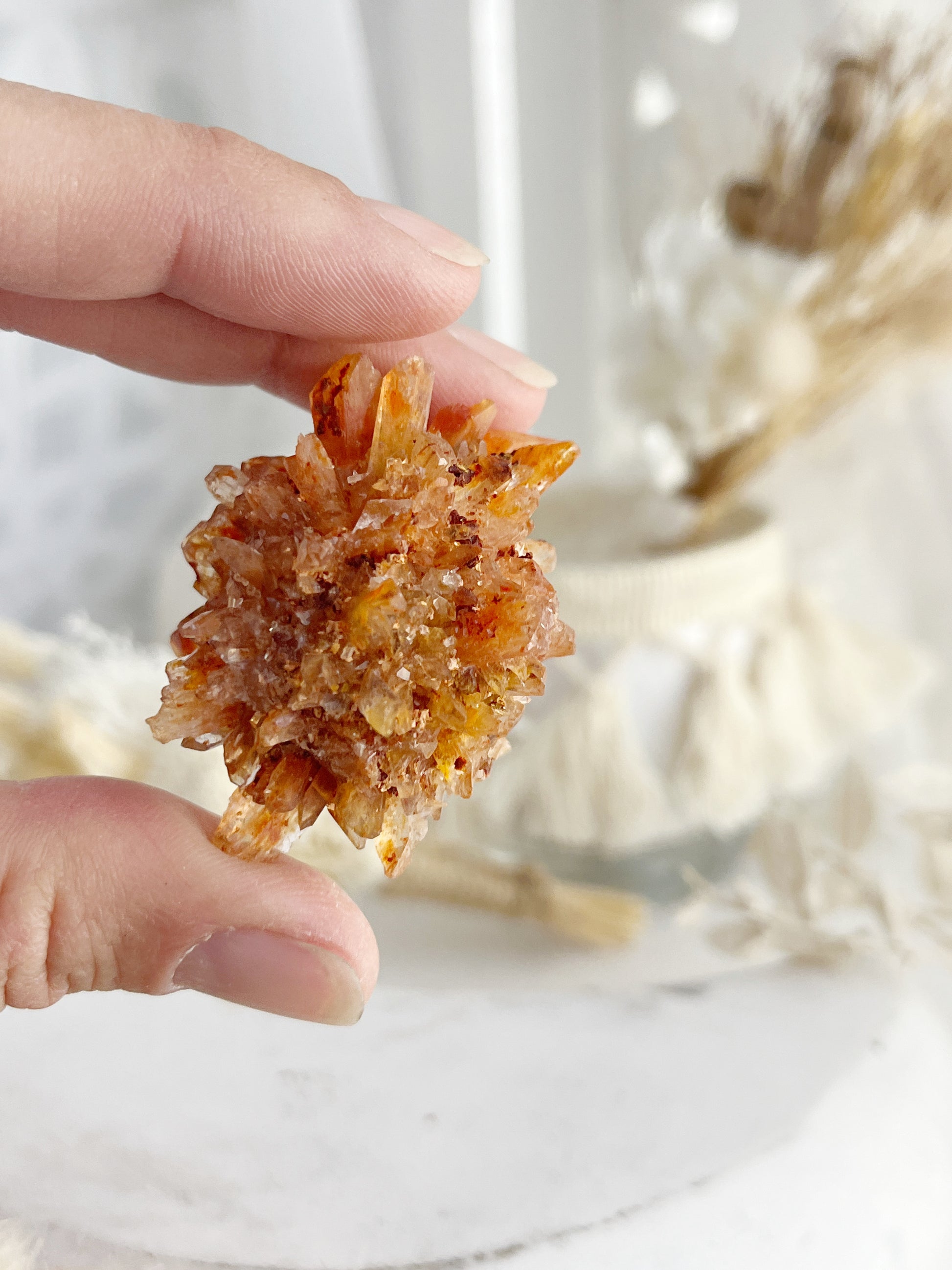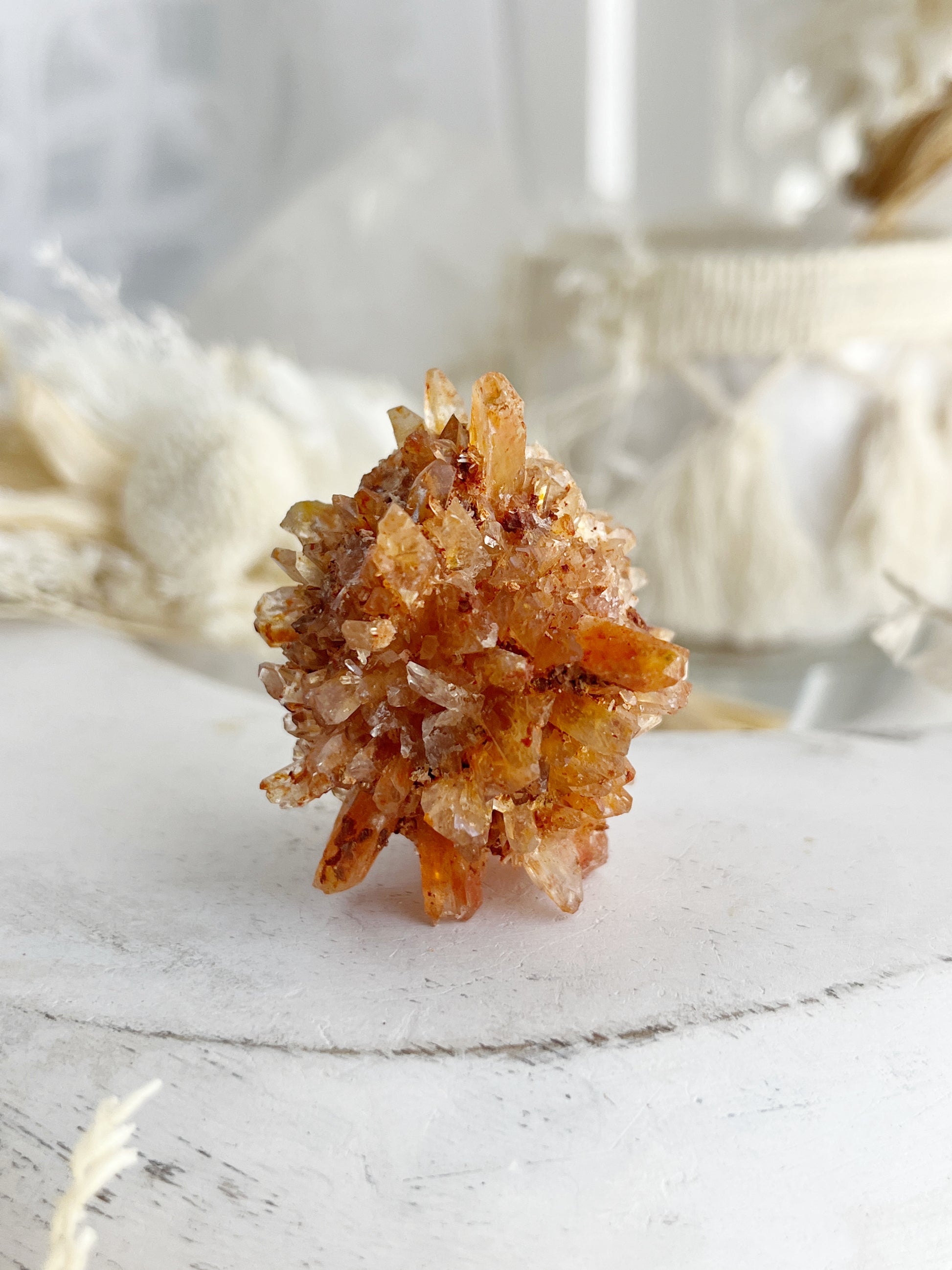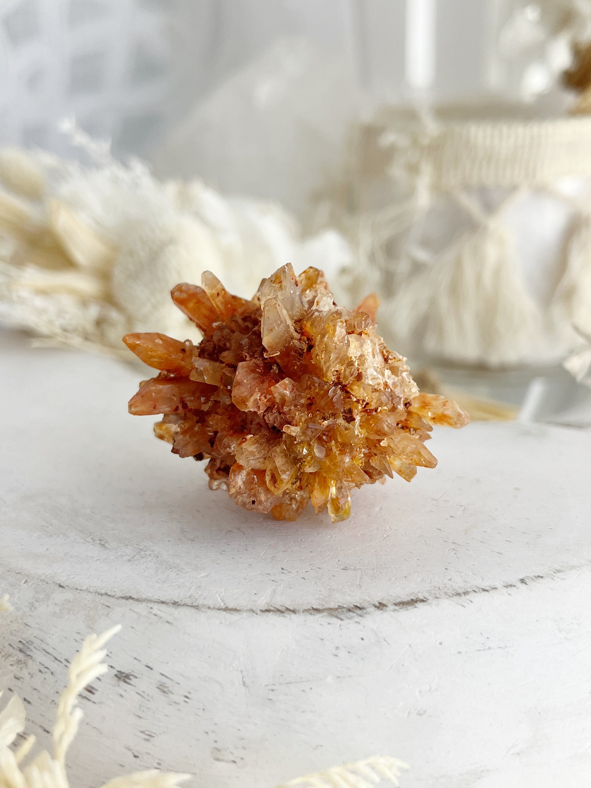 Creedite stimulates the upper chakras, fostering the gentle yet powerful expansion of awareness and consciousness. It assists in decoding and interpreting information from the Akashic records, record keeper Crystals, divination tools and Spirit Guides. As a stone of Light, it radiates energy in all directions to clear, cleanse and refresh energetic blocks and the Aura, while raising the overall base frequency of your energetic field. When used for meditation, it assists with reaching a clear meditative state, amplifying your connection to higher realms and your guides. Orange Creedite is also said to inspire creative vision and assist with finding inner peace, harmony and joy.