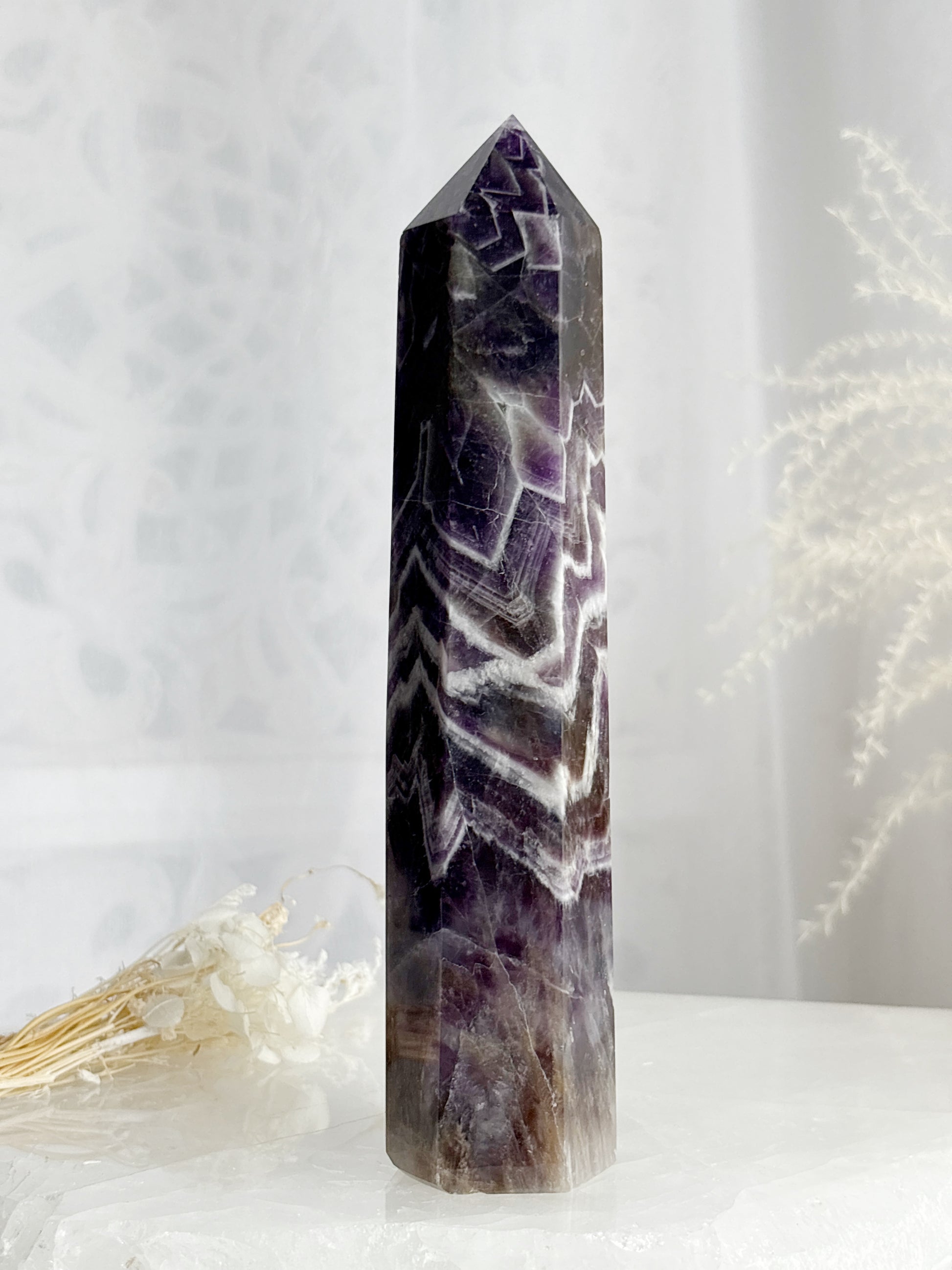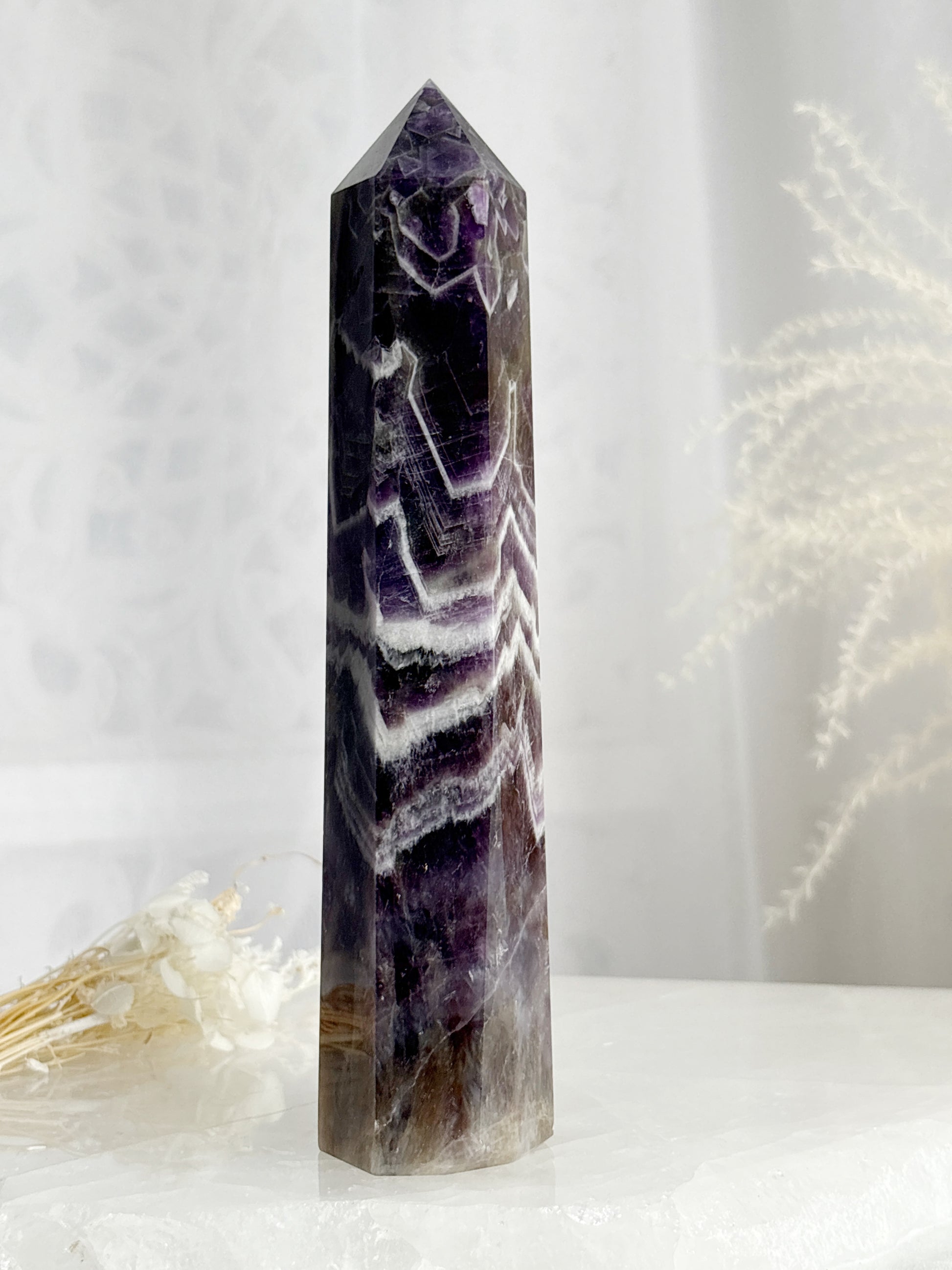 Dream Amethyst (aka Chevron Amethyst) holds the properties of Amethyst but due to the addition of Quartz it is considered an amplified highly protective & spiritual stone. Placing an eteric bubble around its user, it deflects all negative energy. It deepens, strengthens and enhances meditative states, connection to the higher realms, psychic and intuitive abilities, lucid dreaming & vision recall.