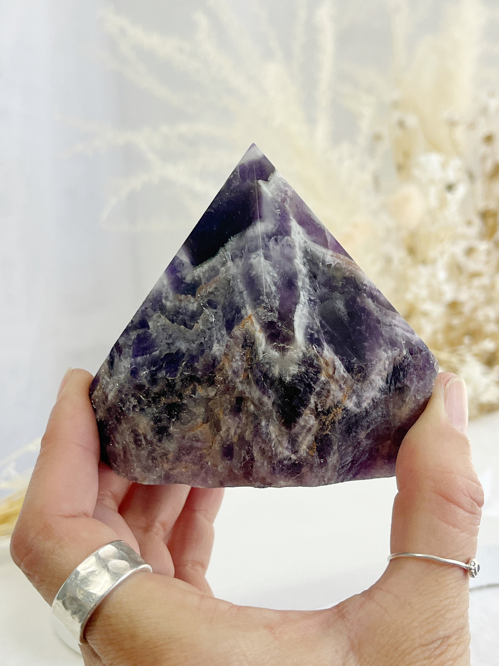 Dream Amethyst (aka Chevron Amethyst) holds the properties of Amethyst but due to the addition of Quartz it is considered an amplified highly protective & spiritual stone. Placing an eteric bubble around its user, it deflects all negative energy. It deepens, strengthens and enhances meditative states, connection to the higher realms, psychic and intuitive abilities, lucid dreaming & vision recall.