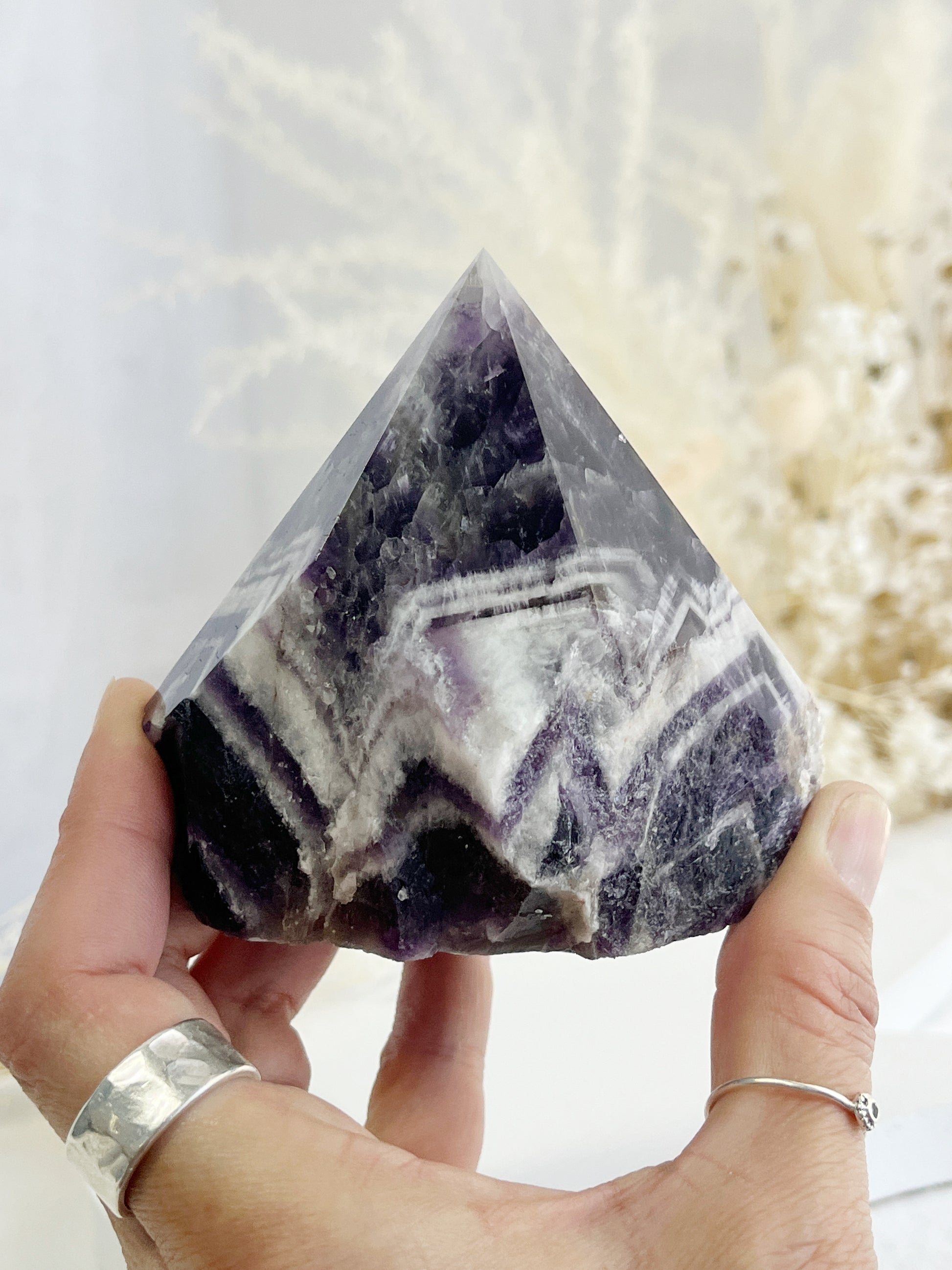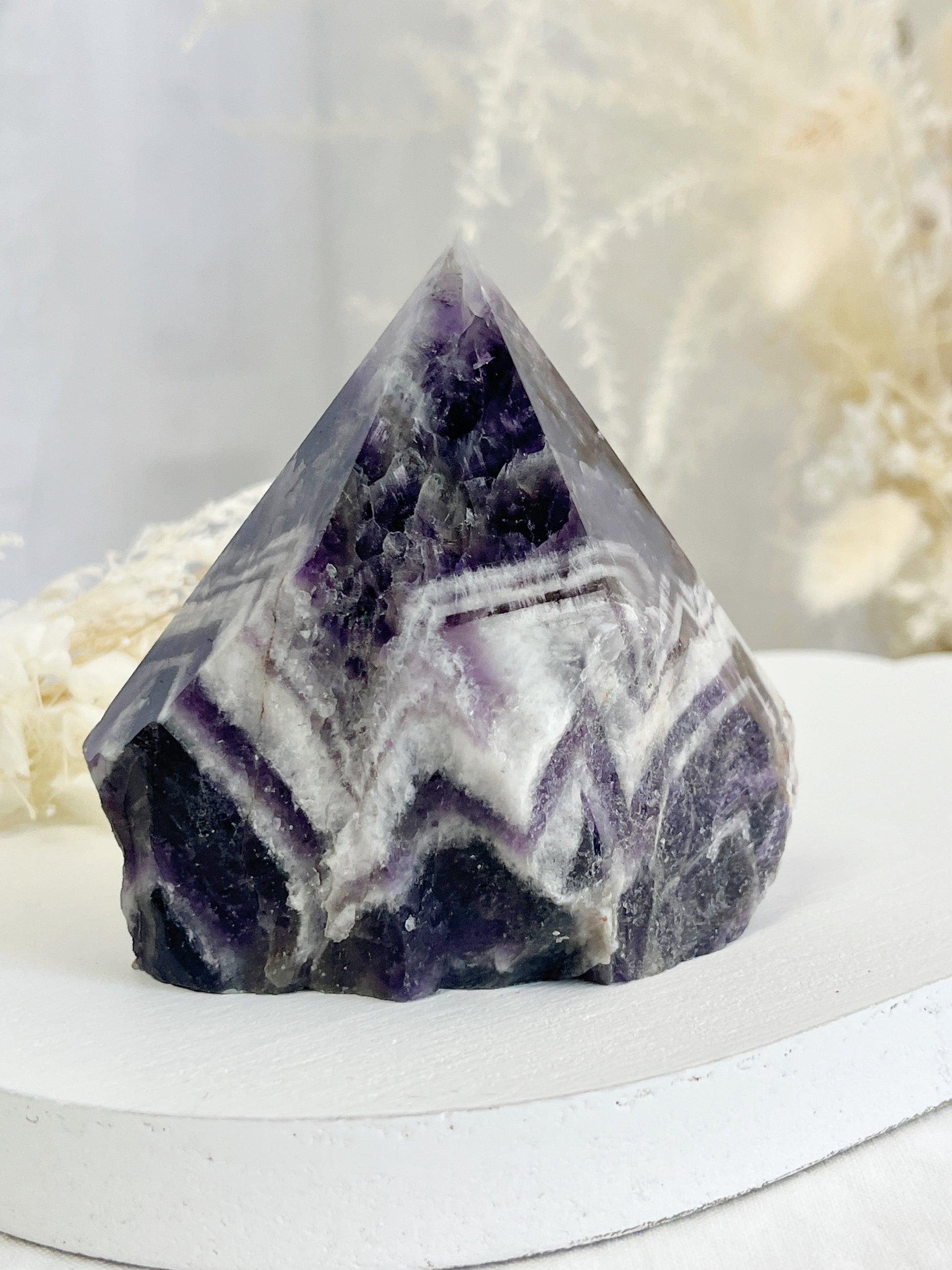 Dream Amethyst (aka Chevron Amethyst) holds the properties of Amethyst but due to the addition of Quartz it is considered an amplified highly protective & spiritual stone. Placing an eteric bubble around its user, it deflects all negative energy. It deepens, strengthens and enhances meditative states, connection to the higher realms, psychic and intuitive abilities, lucid dreaming & vision recall.