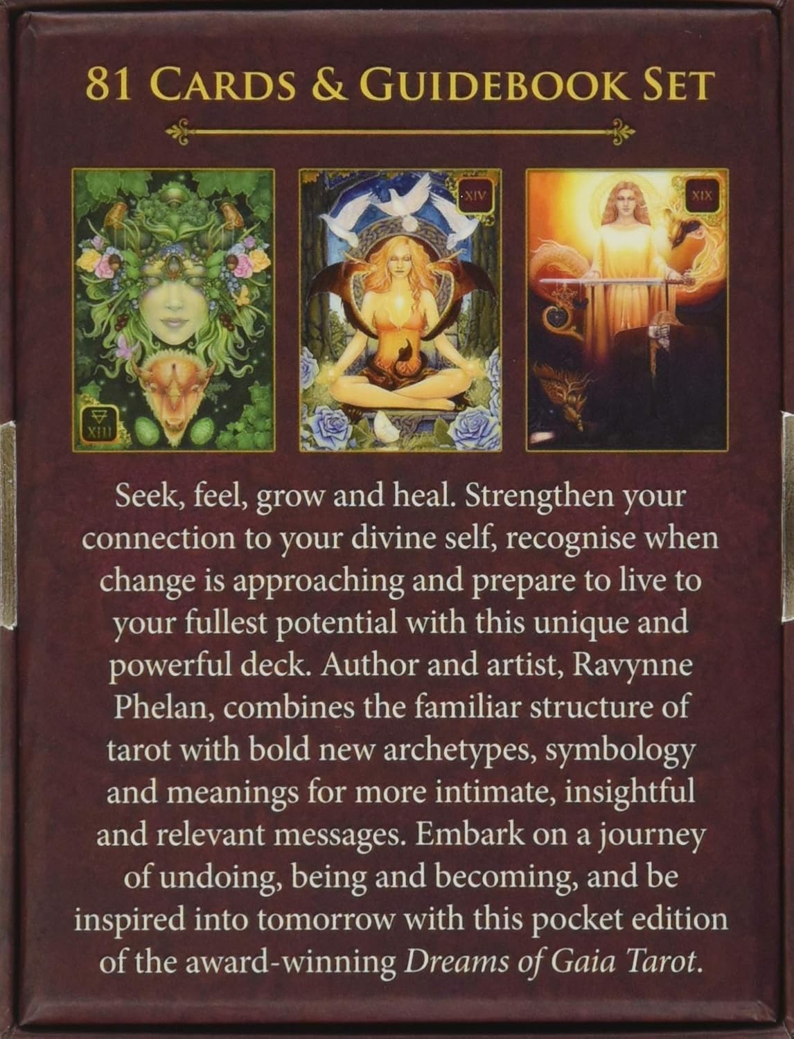 Seek, feel, grow, and heal. Strengthen your connection to your divine self, recognise when change is approaching, and prepare to live to your fullest potential with this unique and powerful deck. Author and artist Ravynne Phelan combines the familiar structure of tarot with bold new archetypes, symbology, and meanings for more intimate, insightful, and relevant messages. Embark on a journey of undoing, being, and becoming with this pocket edition of the award-winning Dreams of Gaia Tarot.