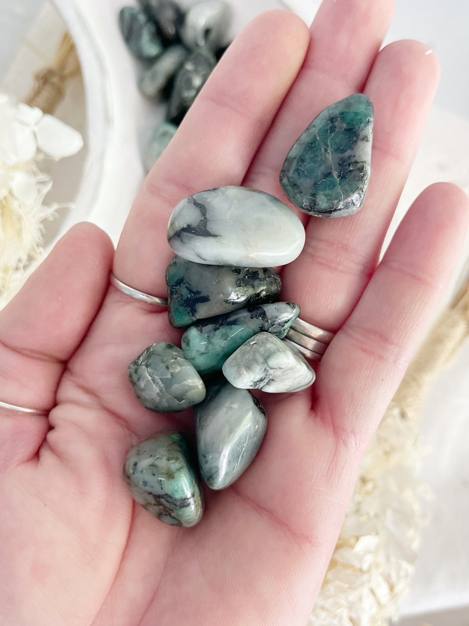 Included is one Emerald Tumble intuitively chosen by us. As stone is unique, size, shape and colour will vary