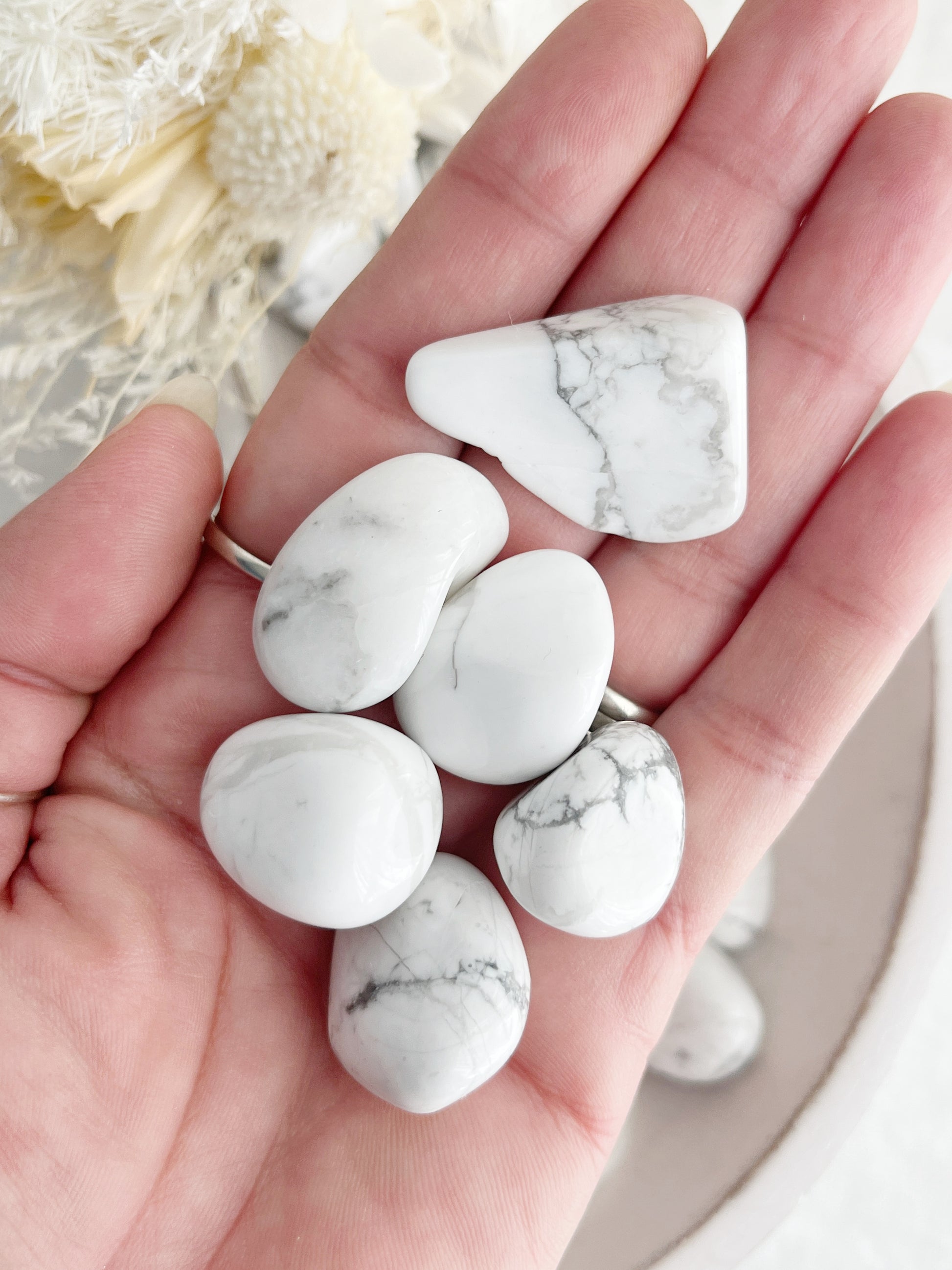 Included is one Howlite Tumble intuitively chosen by us. As stone is naturally unique, each may vary in size, shape + colour.