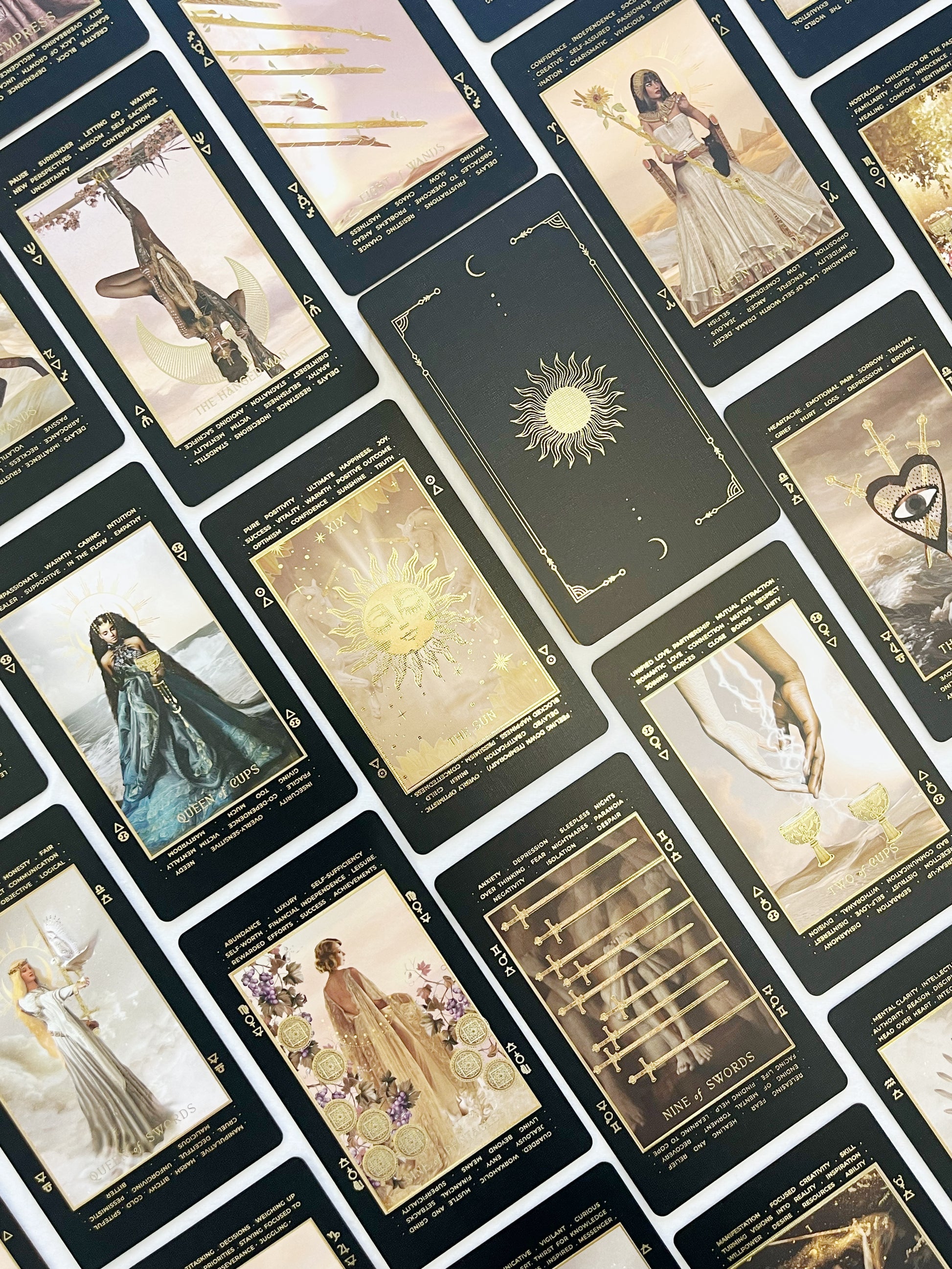 Important: All Keywords are in gold foil. This deck is not recommended for those who may have visual difficulties. They are intentionally gold foiled and low-contrast to provide elusive prompts as they reflect the light, rather than bold text displaying all words in an easy-to-read format. This was intentionally crafted to assist and help with growing and developing intuition.