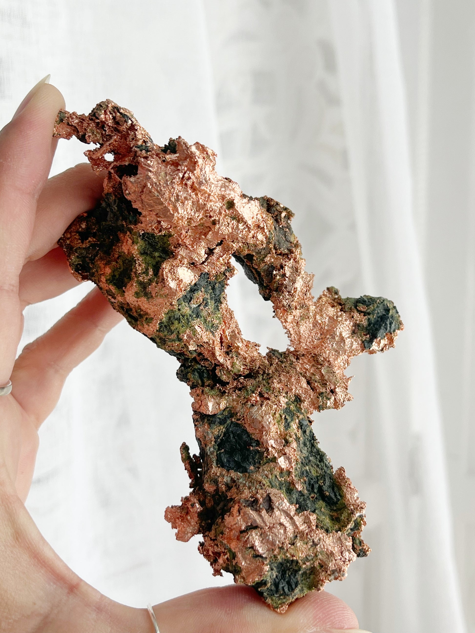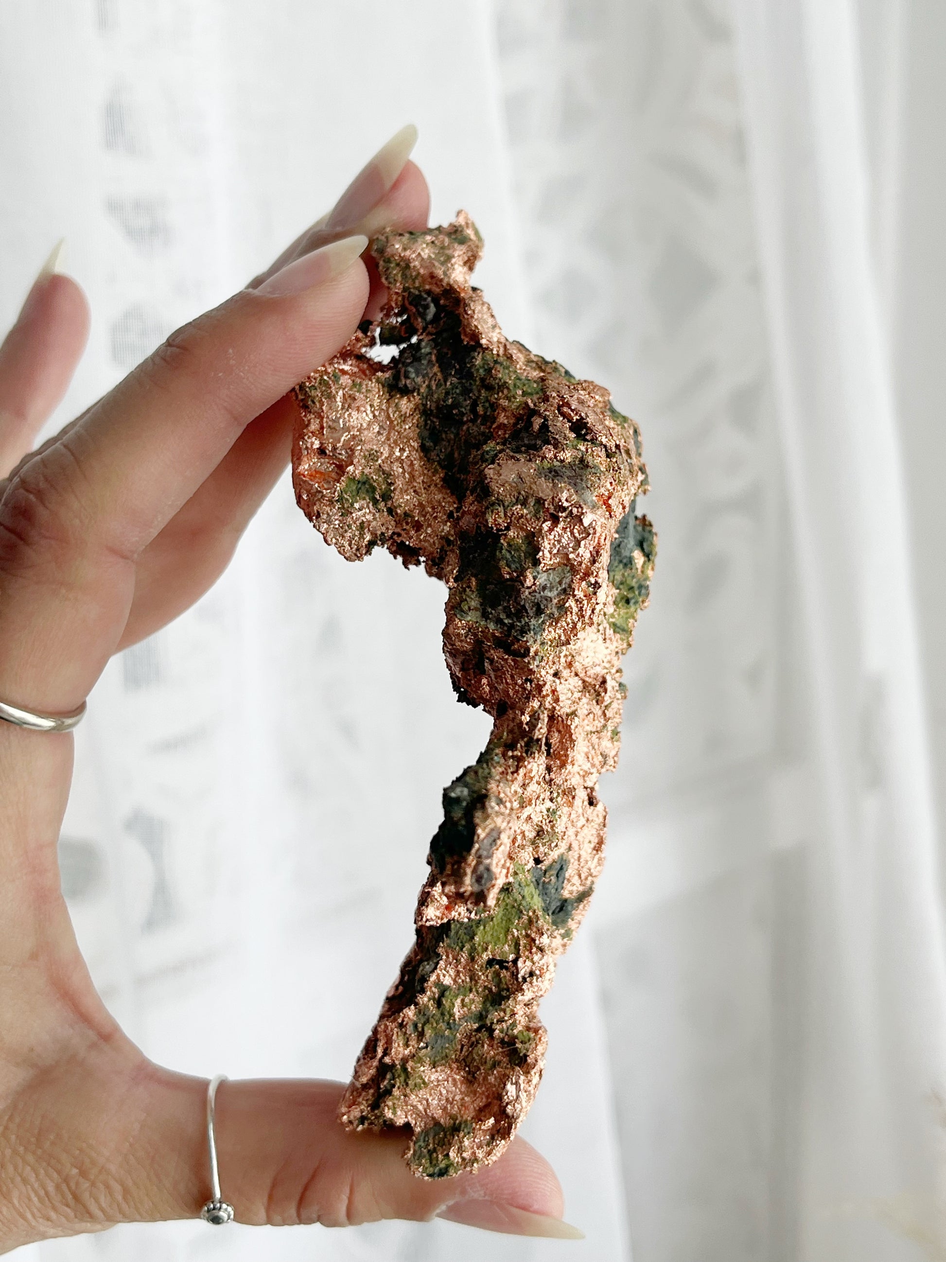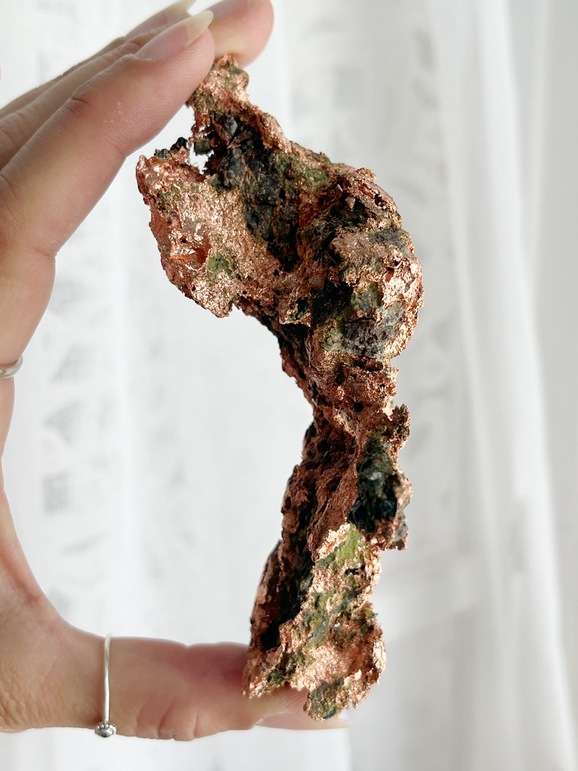Copper is an ancient metal of channelling energy. It is a conduit that grounds and transfers vibrational frequency from the spiritual to the physical. It assists in activating one’s cellular knowledge, clearing negative energy, and instilling positivity + mental clarity. Bringing balance and strength to the body systems, it not only assists in harmonising and healing the physical body but also the Auric field, while assisting with improving blood and oxygen circulation and flow. Copper is said to also be useful in fertility as it balances the reproductive system.