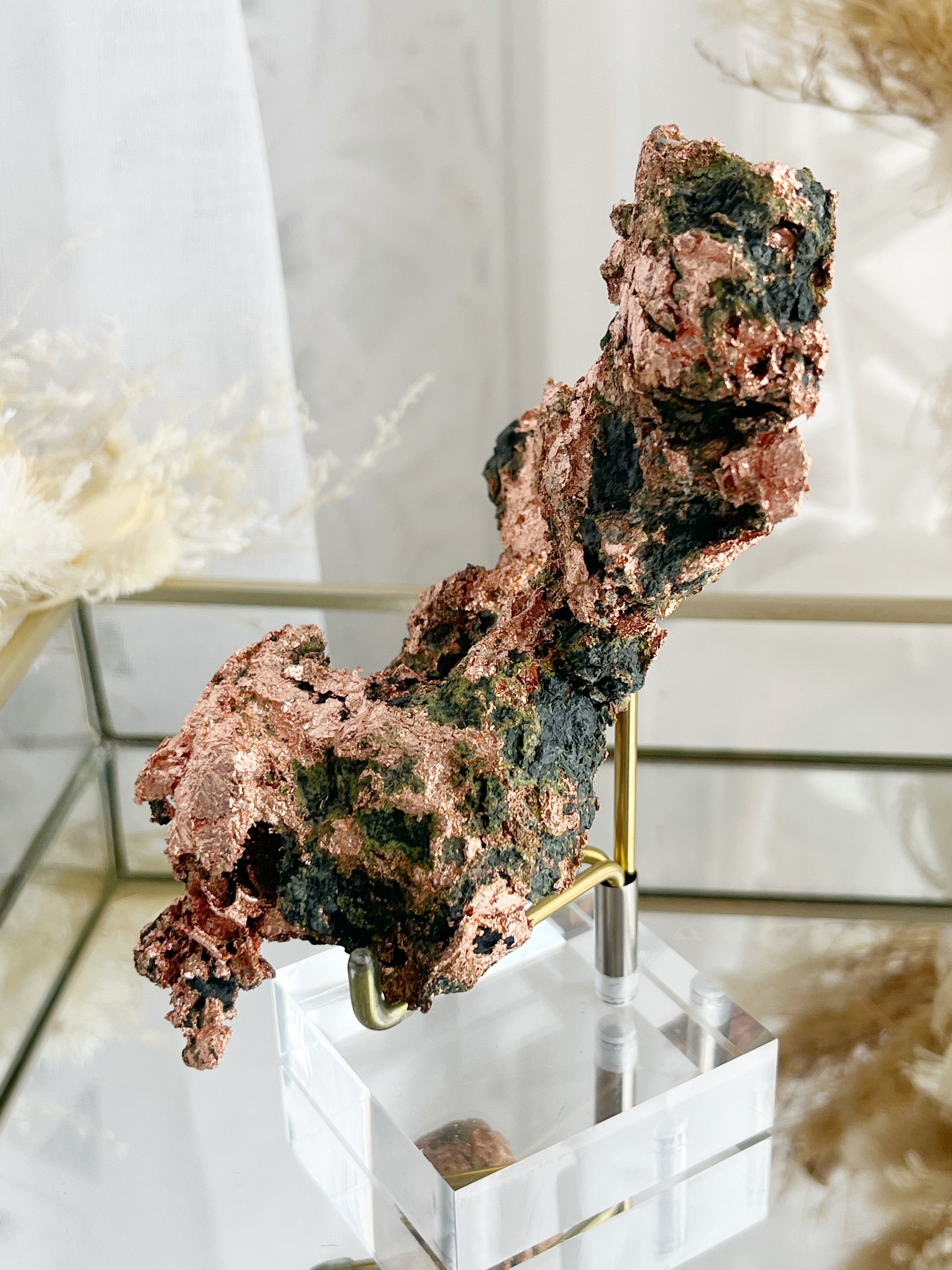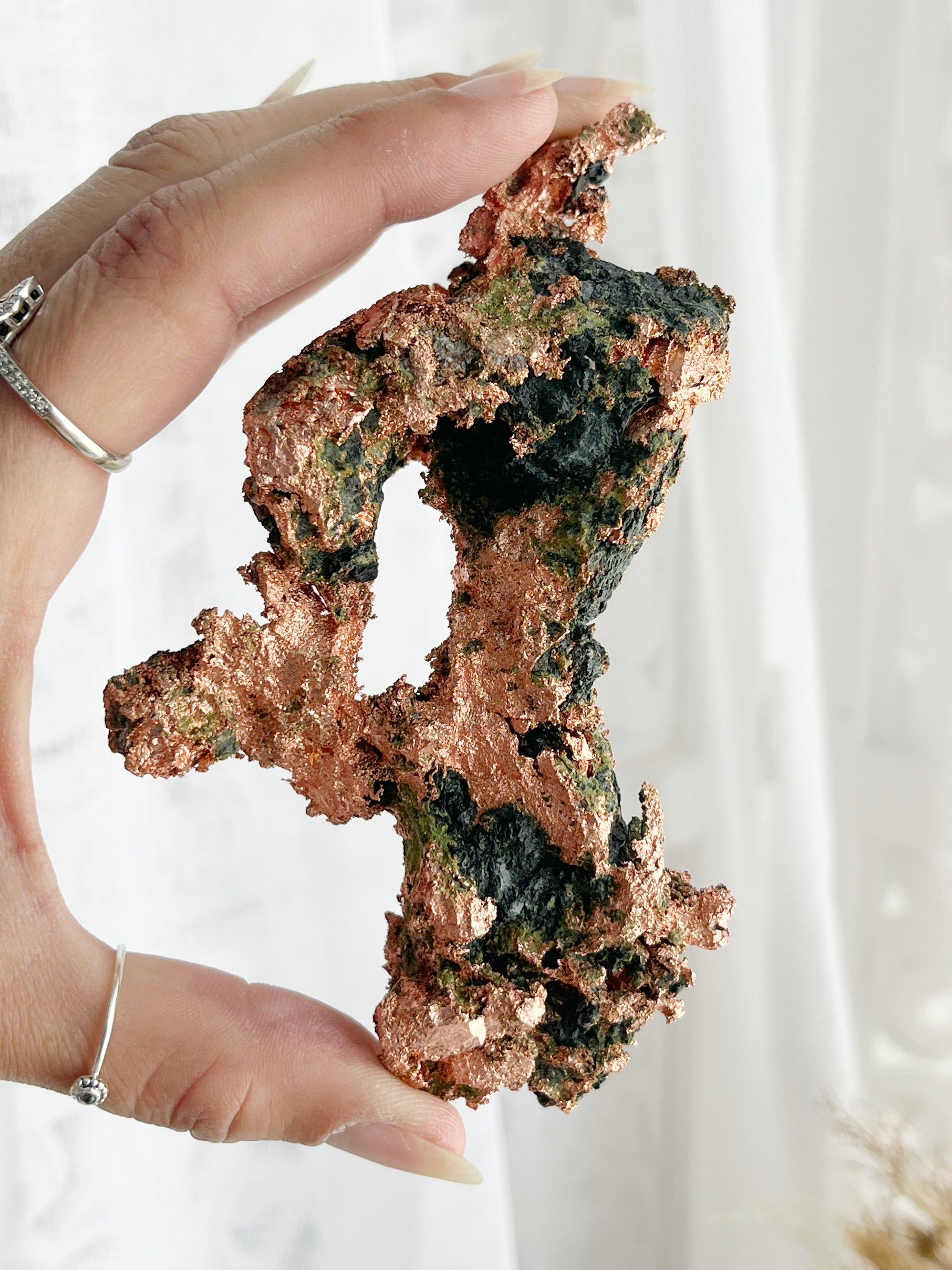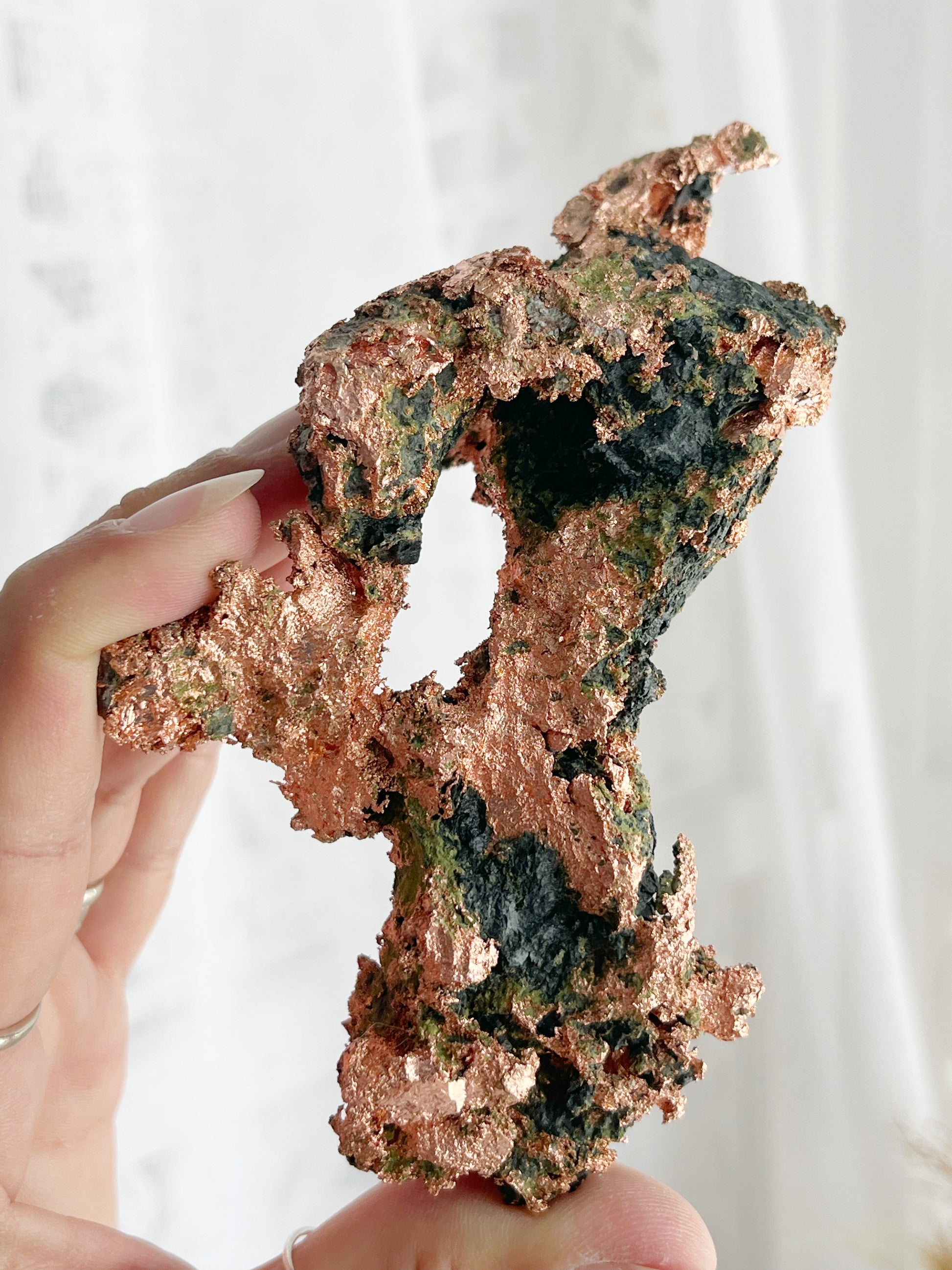 Copper is an ancient metal of channelling energy. It is a conduit that grounds and transfers vibrational frequency from the spiritual to the physical. It assists in activating one’s cellular knowledge, clearing negative energy, and instilling positivity + mental clarity. Bringing balance and strength to the body systems, it not only assists in harmonising and healing the physical body but also the Auric field, while assisting with improving blood and oxygen circulation and flow. Copper is said to also be useful in fertility as it balances the reproductive system.
