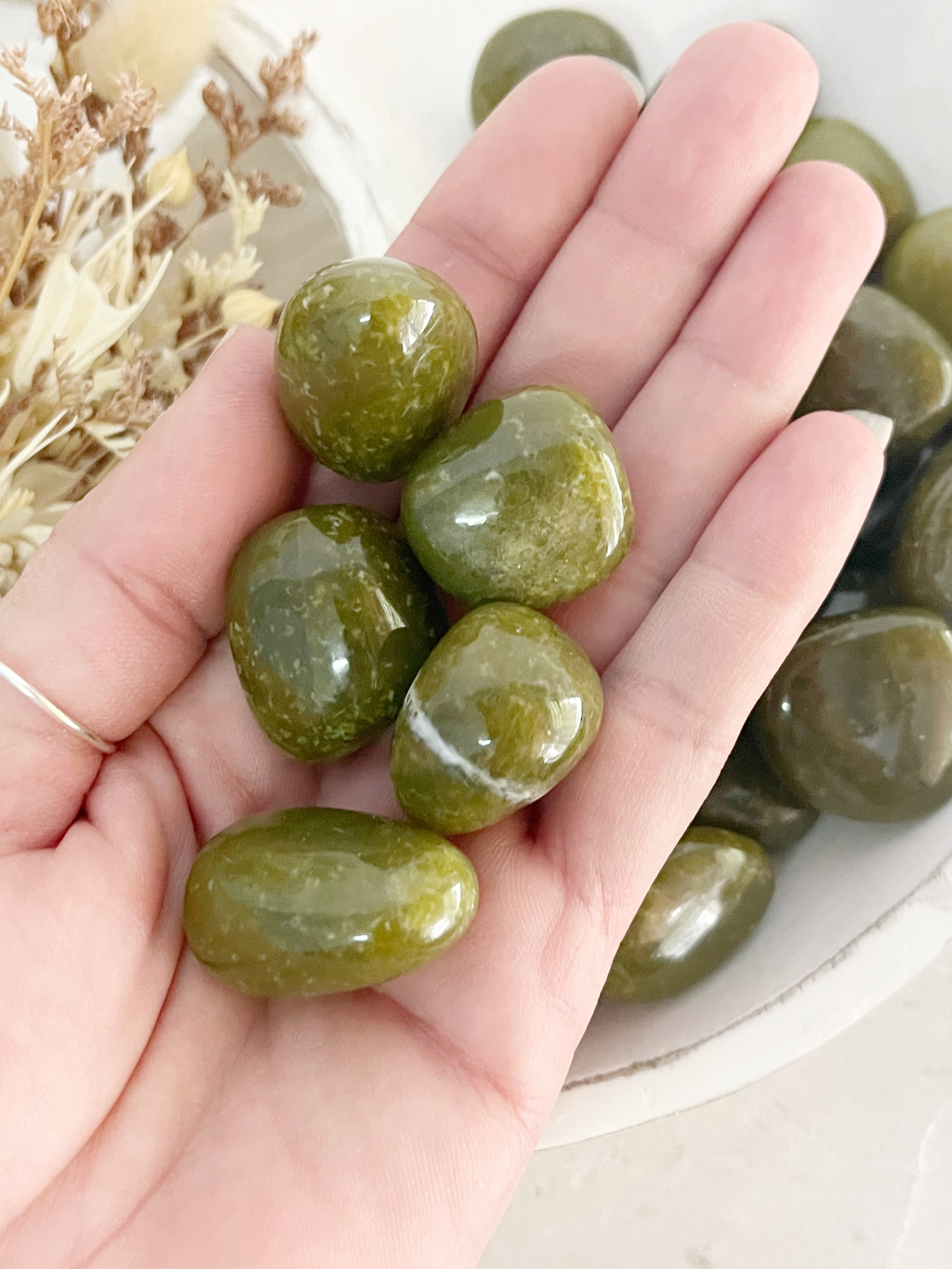 Included is one Olivian Jade tumble stone intuitively chosen by us.