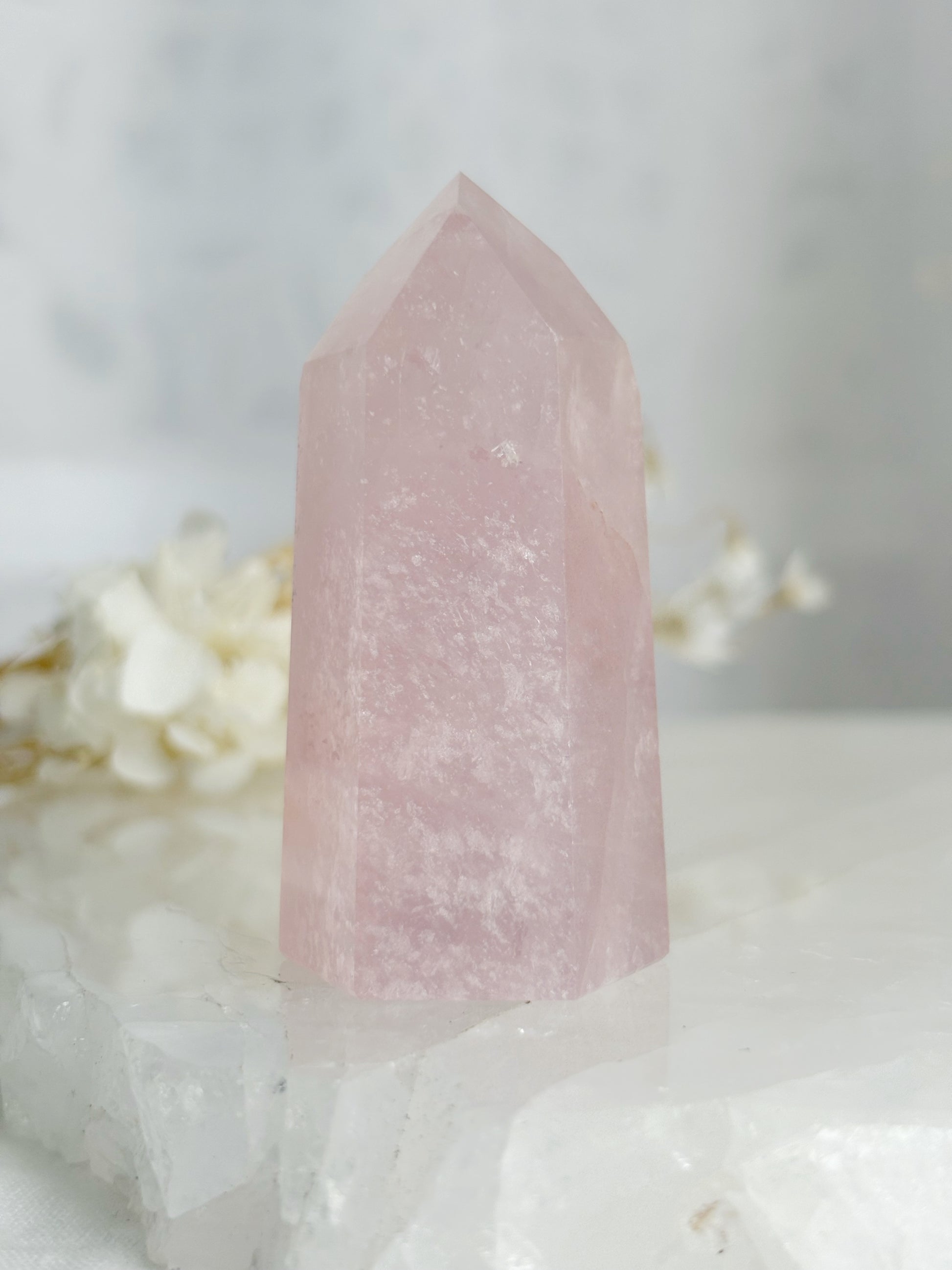 Rose Quartz opens the heart to unconditional love, inspiring compassion and forgiveness. It awakens and fosters deep self-love, assisting to raise one's self-esteem & inner courage. By clearing & rejuvenating the heart chakra, it assists with deep emotional healing and helps one to understand their emotions. It dissolves past fears, encouraging one to give and recieve love freely. Rose Quartz emanates love and positive energy to its surrounds and bearer.