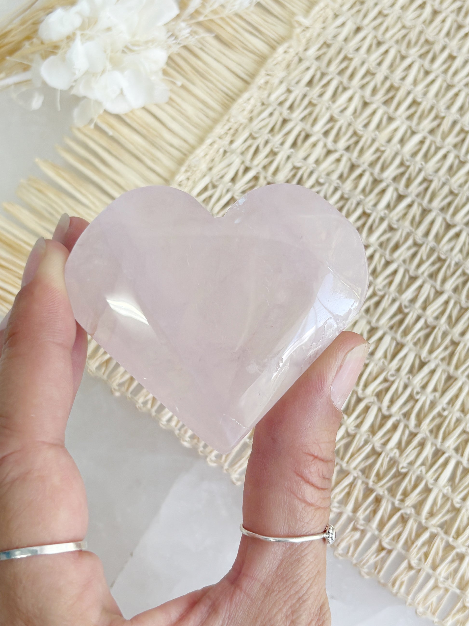 Rose Quartz opens the heart to unconditional love, inspiring compassion and forgiveness. It awakens and fosters deep self-love, assisting to raise one's self-esteem & inner courage. By clearing & rejuvenating the heart chakra, it assists with deep emotional healing and helps one to understand their emotions. It dissolves past fears, encouraging one to give and recieve love freely. Rose Quartz emanates love and positive energy to its surrounds and bearer.