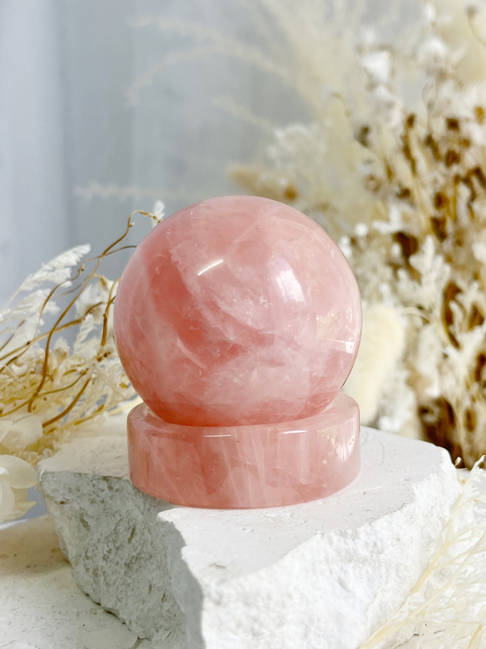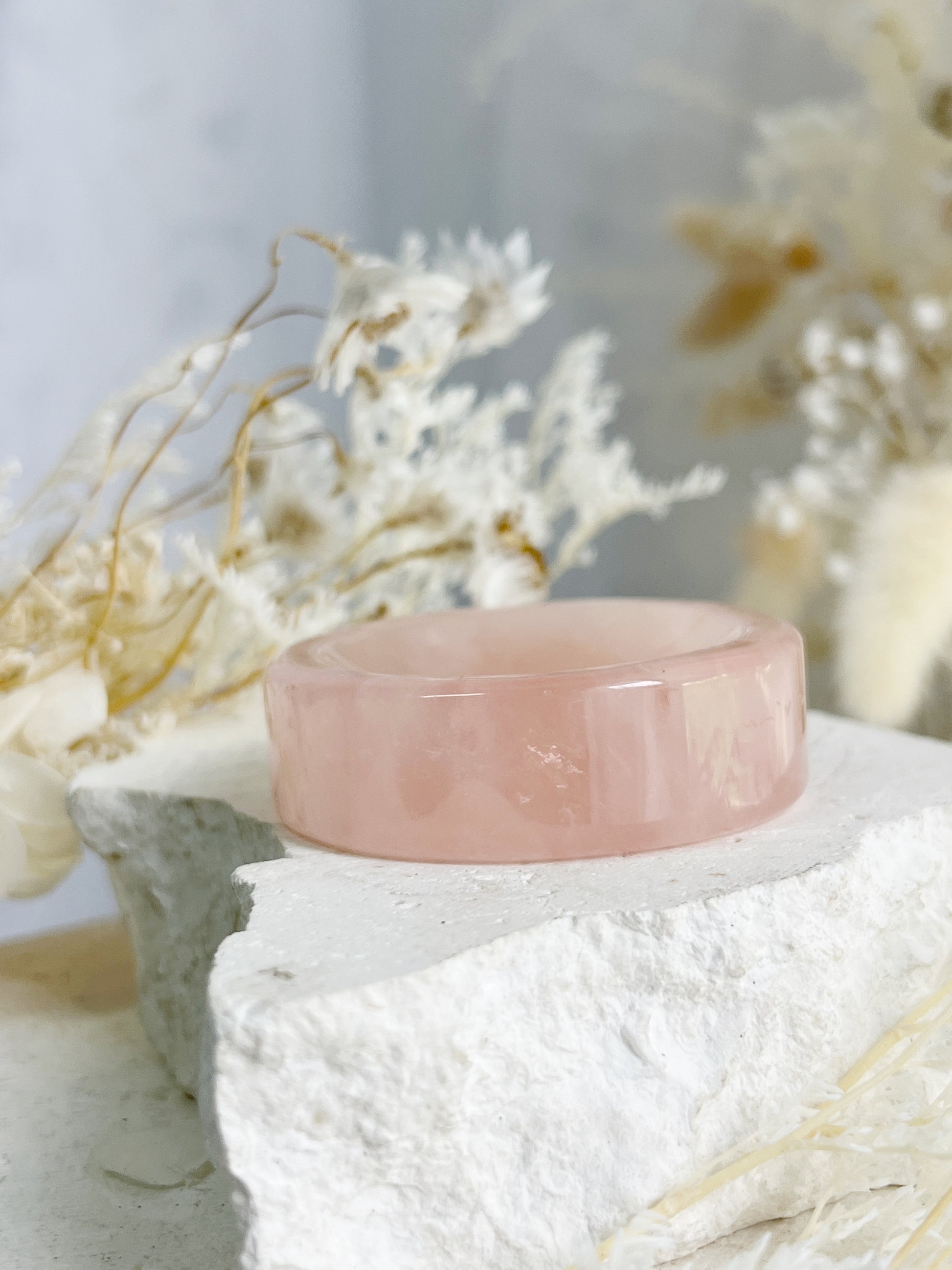 Rose Quartz opens the heart to unconditional love, inspiring compassion and forgiveness. It awakens and fosters deep self-love, assisting to raise one's self-esteem + inner courage. By clearing + rejuvenating the heart chakra, it assists with deep emotional healing + helps one to understand their emotions. It dissolves past fears, encouraging one to give and recieve love freely. Rose Quartz emanates love and positive energy to its surrounds and bearer.