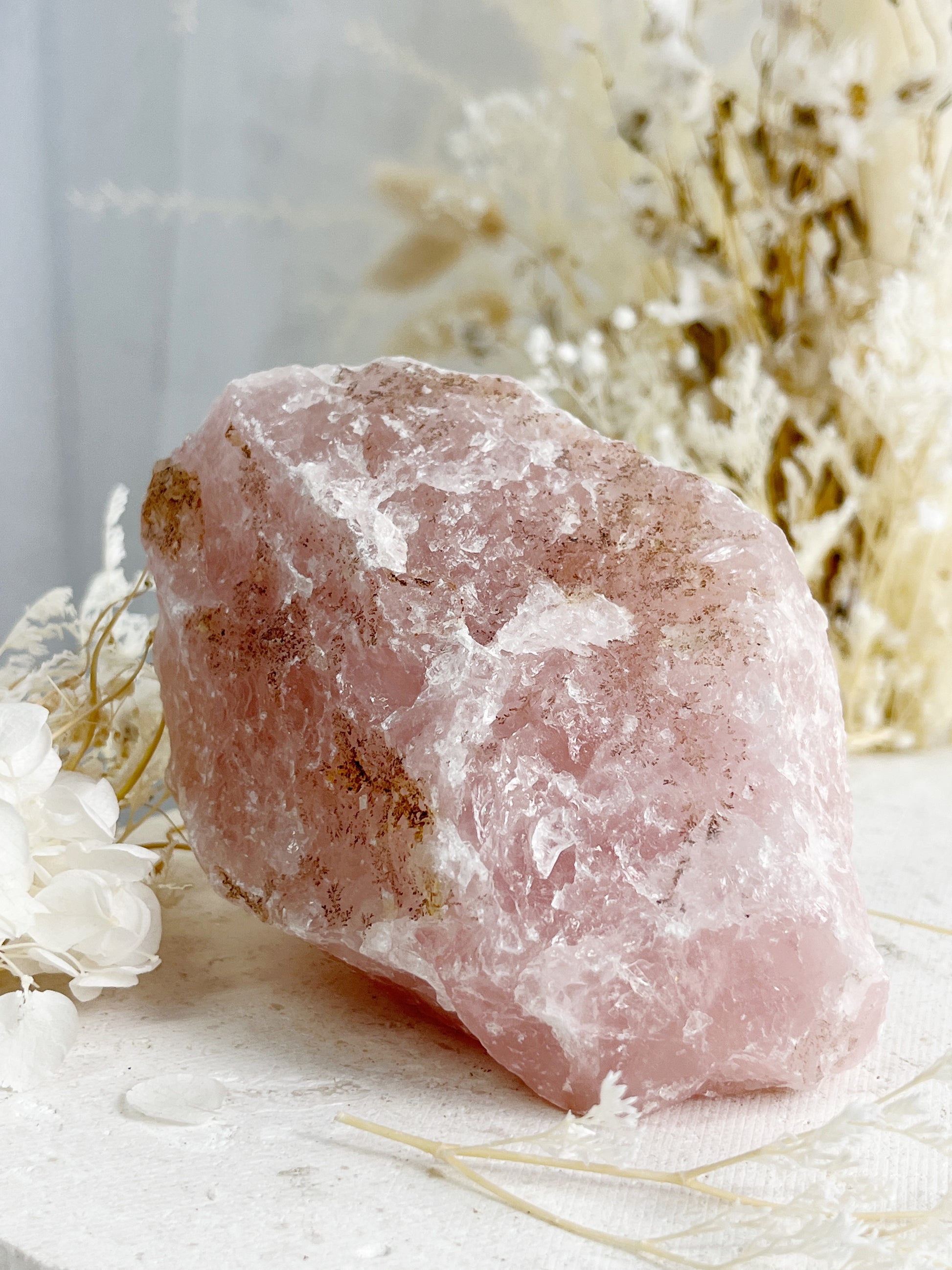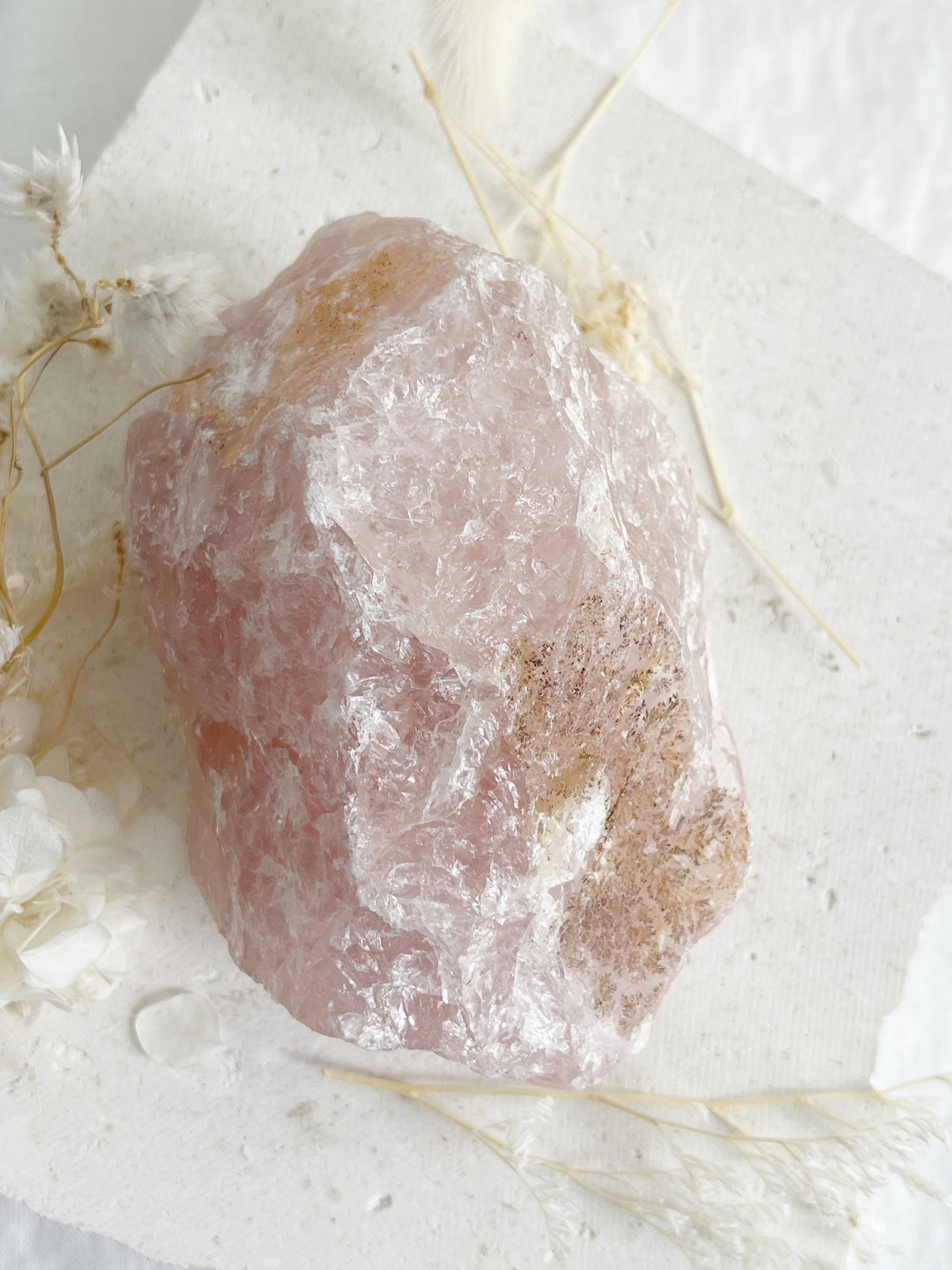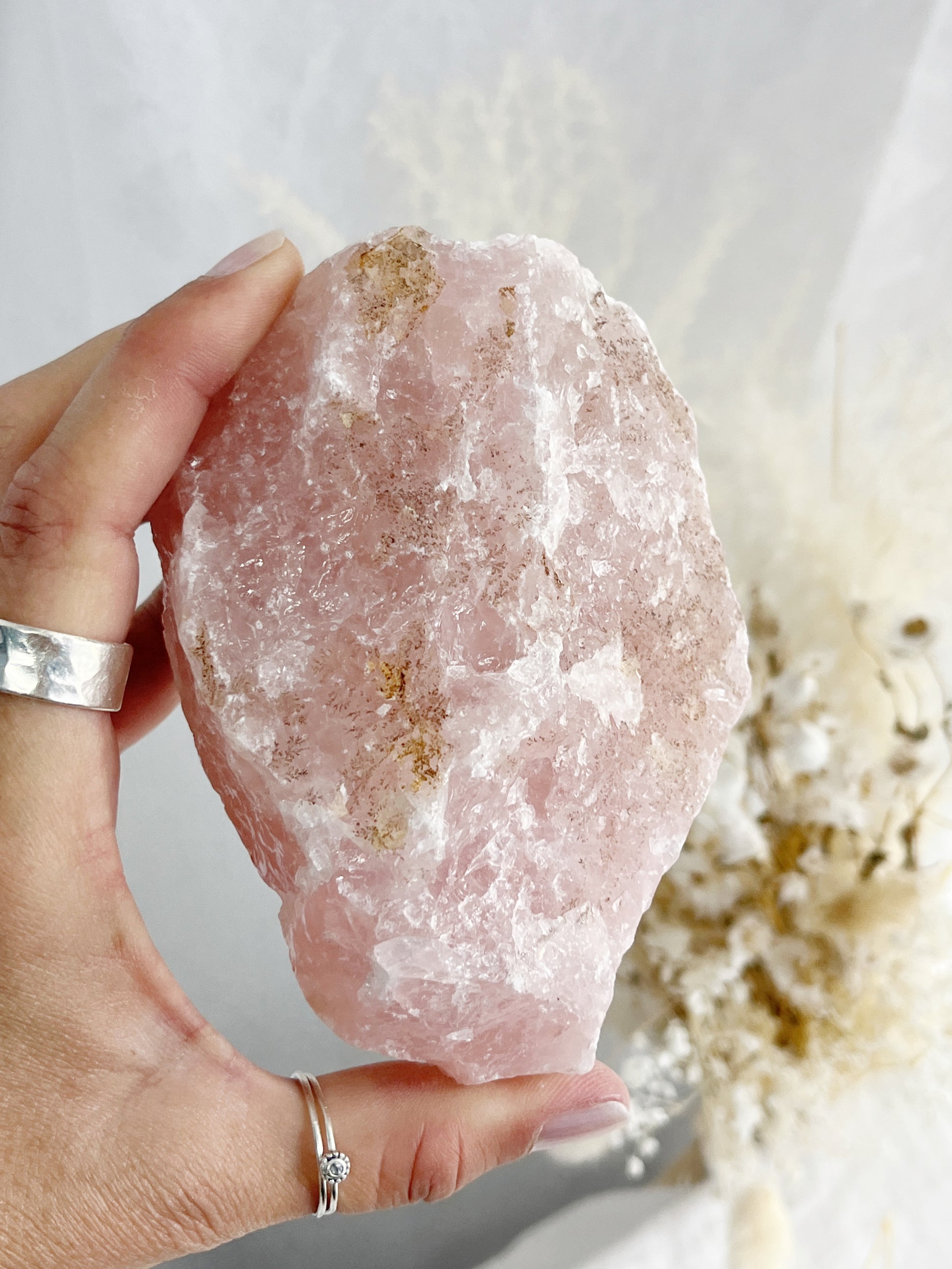 Rose Quartz opens the heart to unconditional love, inspiring compassion and forgiveness. It awakens and fosters deep self-love, assisting to raise one's self-esteem + inner courage. By clearing + rejuvenating the heart chakra, it assists with deep emotional healing + helps one to understand their emotions. It dissolves past fears, encouraging one to give and recieve love freely. Rose Quartz emanates love and positive energy to its surrounds and bearer.