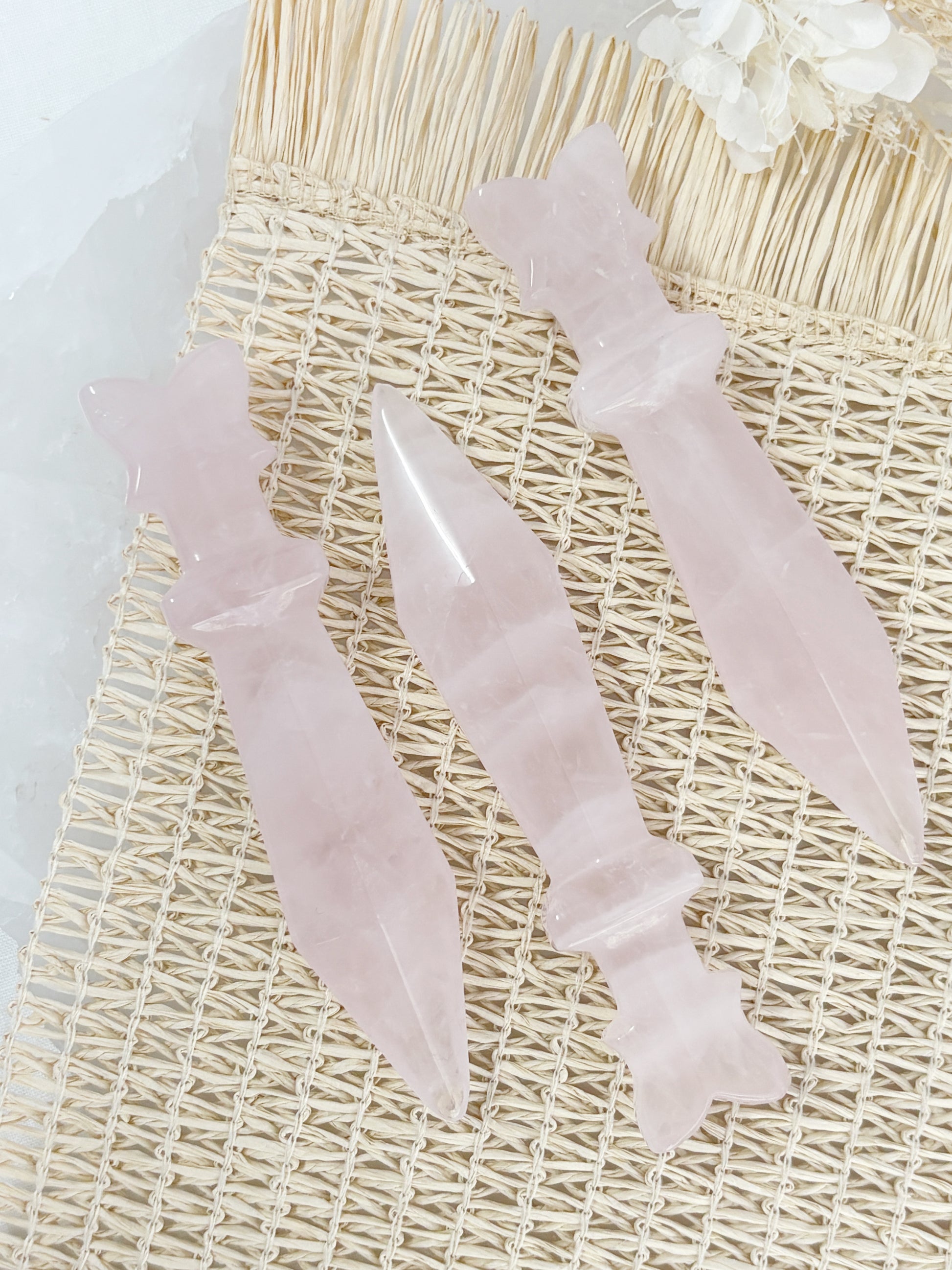 Included is one Rose Quartz Sword carving, intuitively chosen by us. As stone is naturally unique, each may vary in size, shape & colour.
