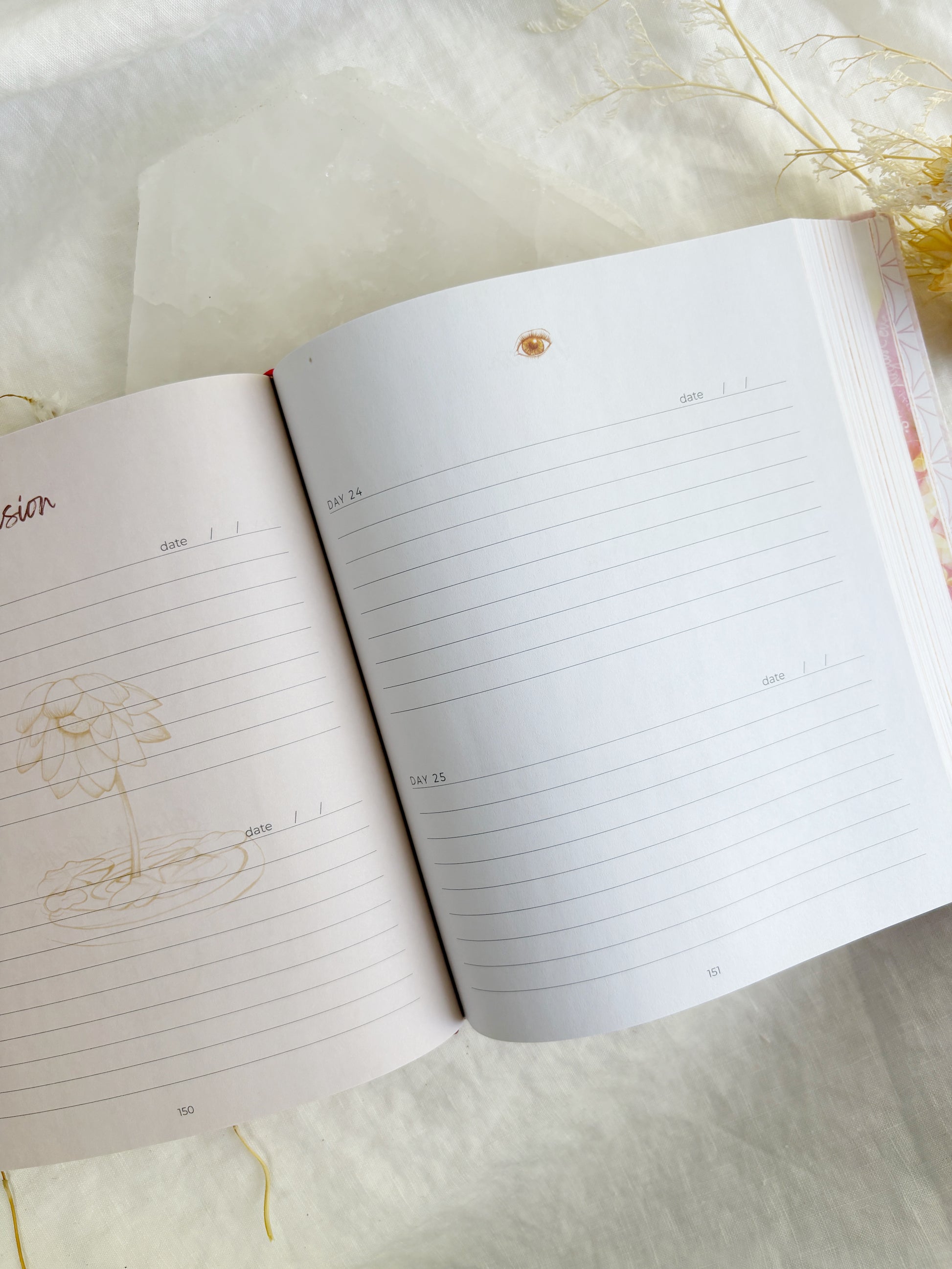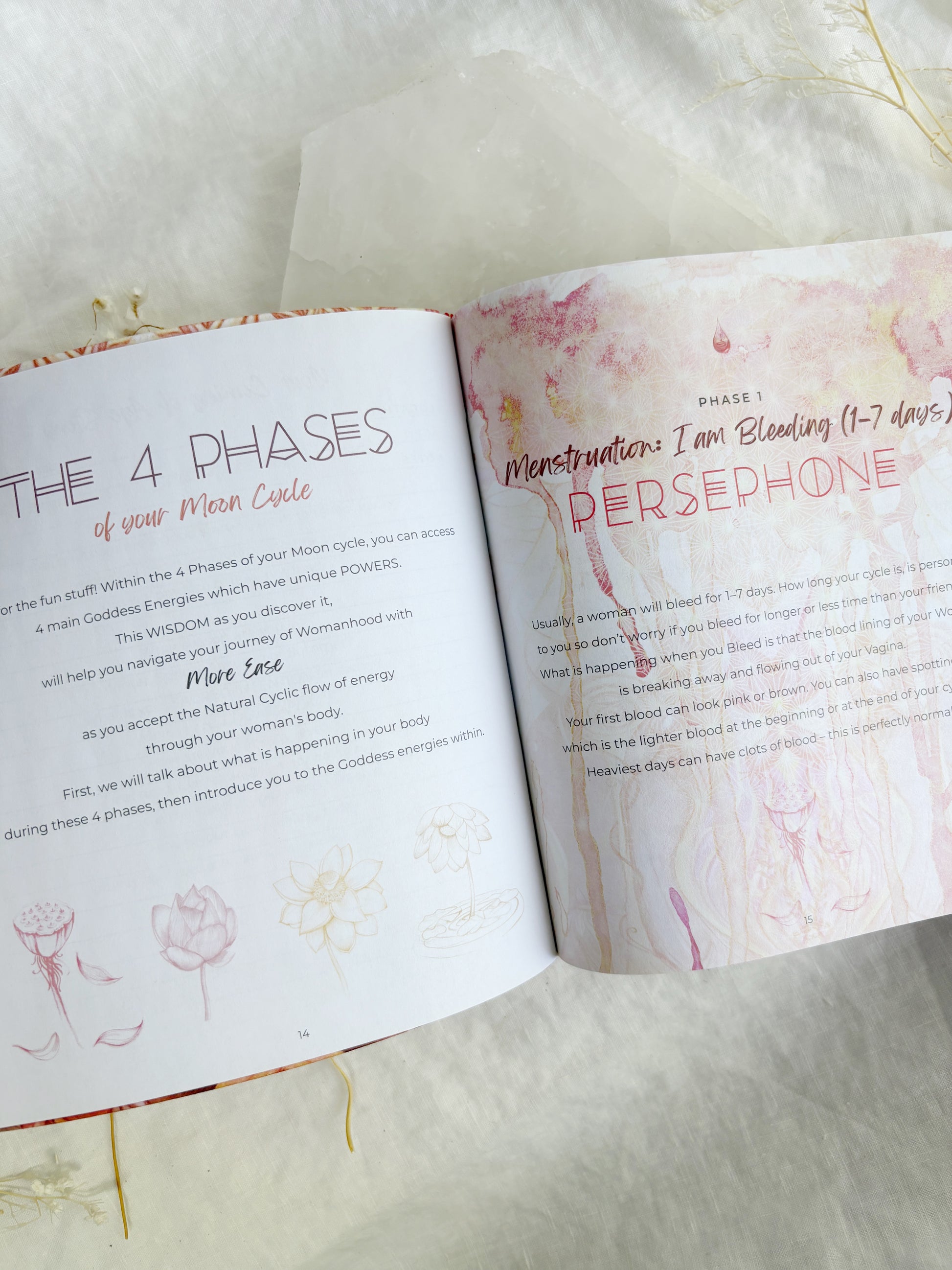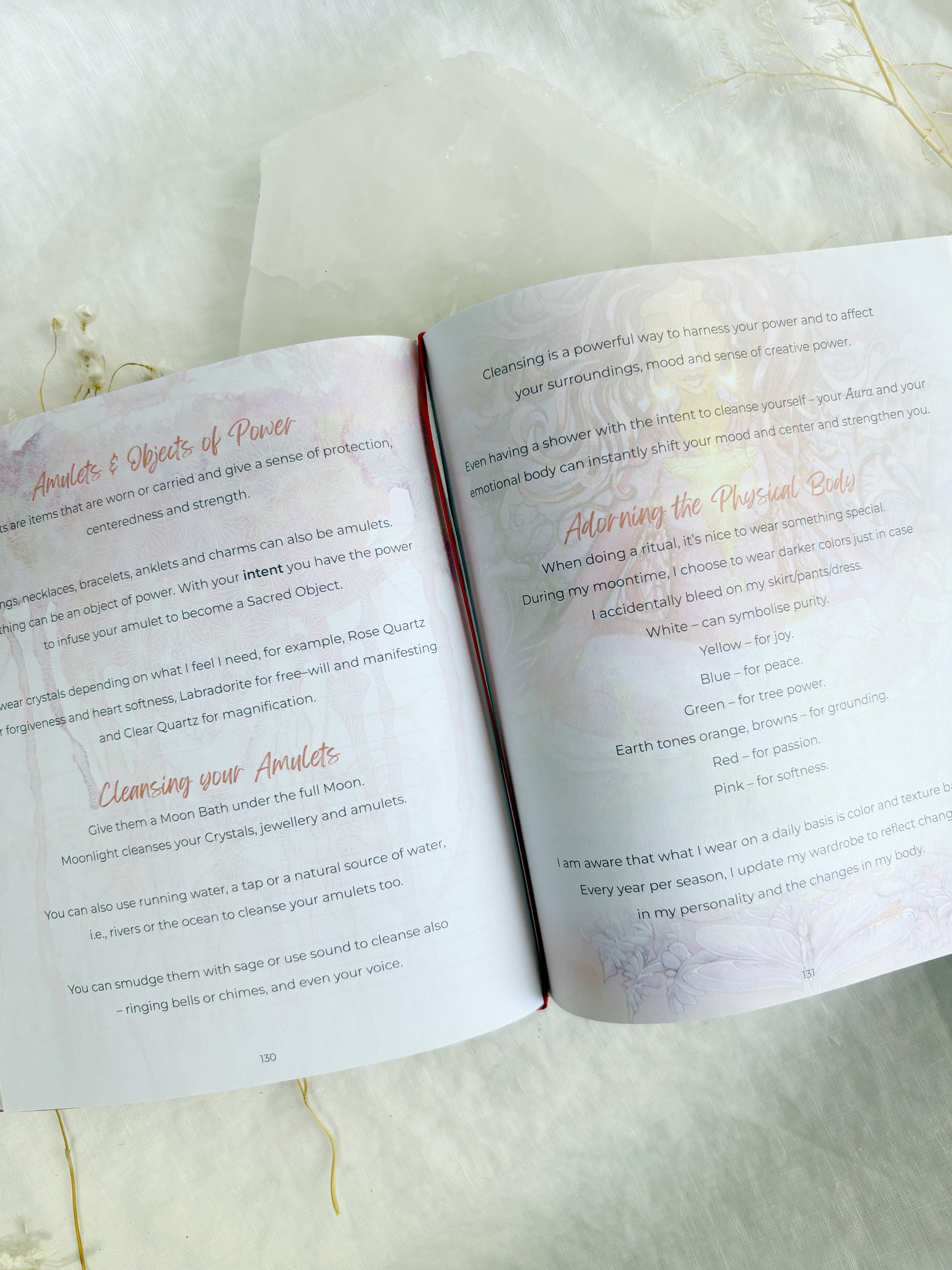 Discover your body wisdom, track and ritualise your moon cycle for women coming of age. Deepen your wisdom as you track each moon in your 13 moon cycle. Learn how to celebrate your womanhood with ceremony and self care rituals. Harness your power by connecting to nature and her rhythms. This Sacred Moon Journal is a sacred place to record your Awakenings as you connect to your body wisdom.