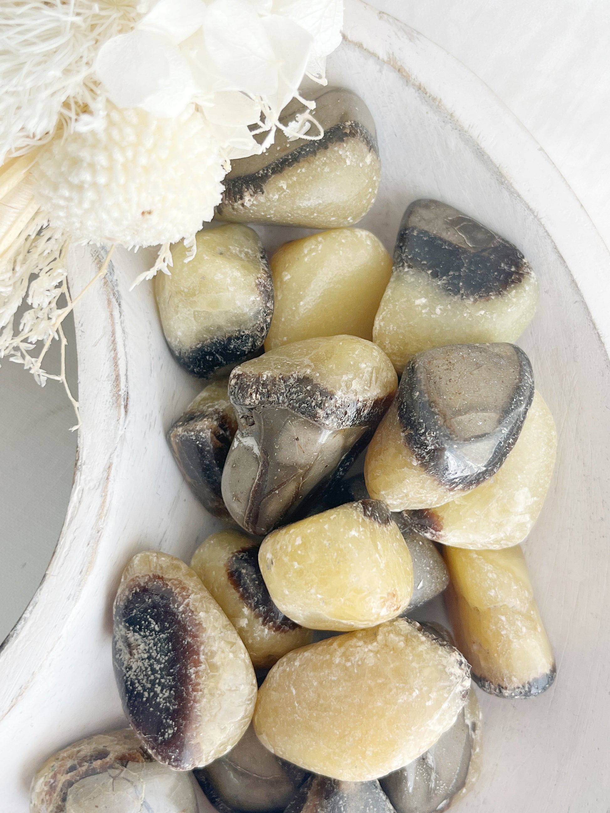 Septarian has an earthy, nurturing + grounding vibration. Connecting to your root chakra, it awakens one’s connection to mother nature, deeply grounding and inspiring us to nurture ourselves and others. It enhances the flow of life force energy through your entire being, encouraging the body to heal from the inside out. Septarian is great support during drastic life changes, shielding the aura from negativity and balancing the emotional body. When used in meditation or sleep, it can bring a deeper understanding to your dreams + visions, as well as past and present lives.