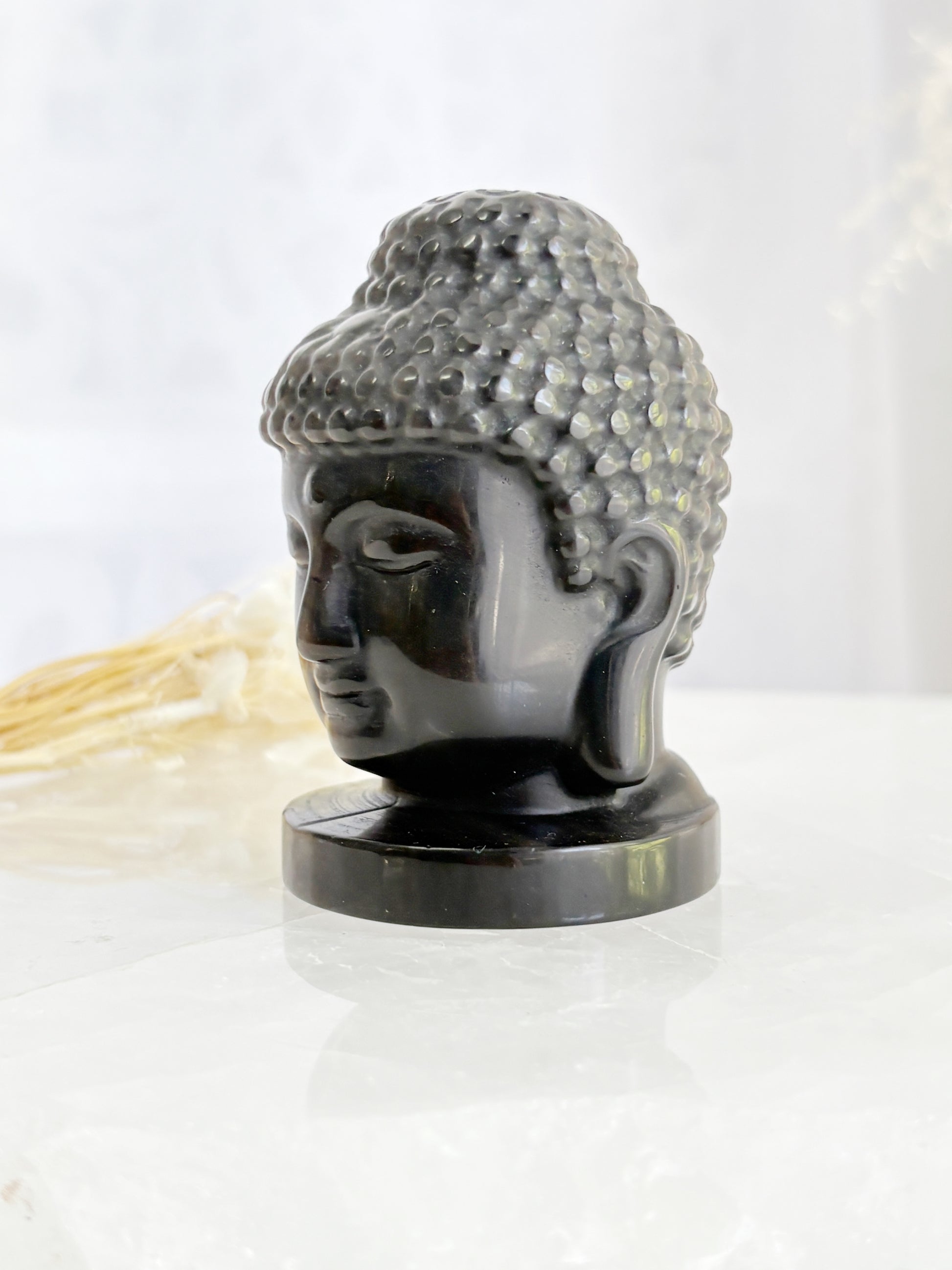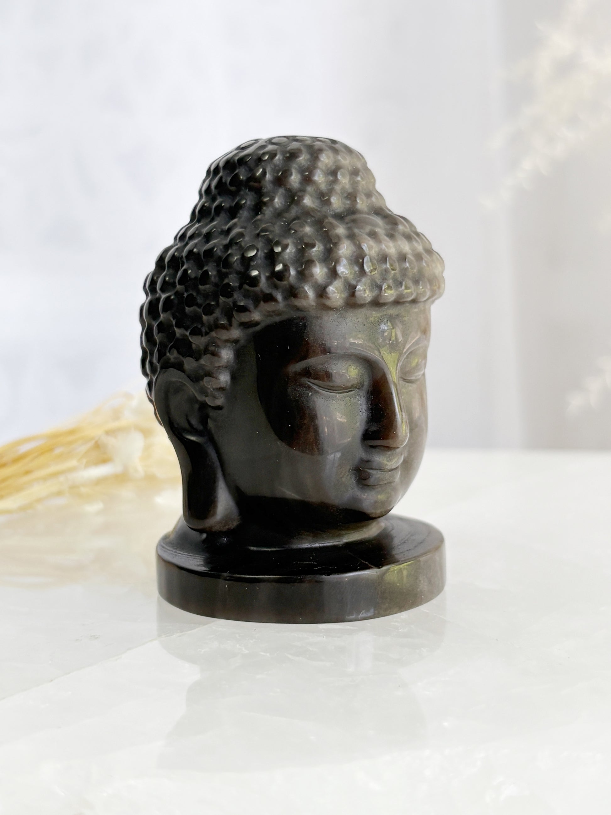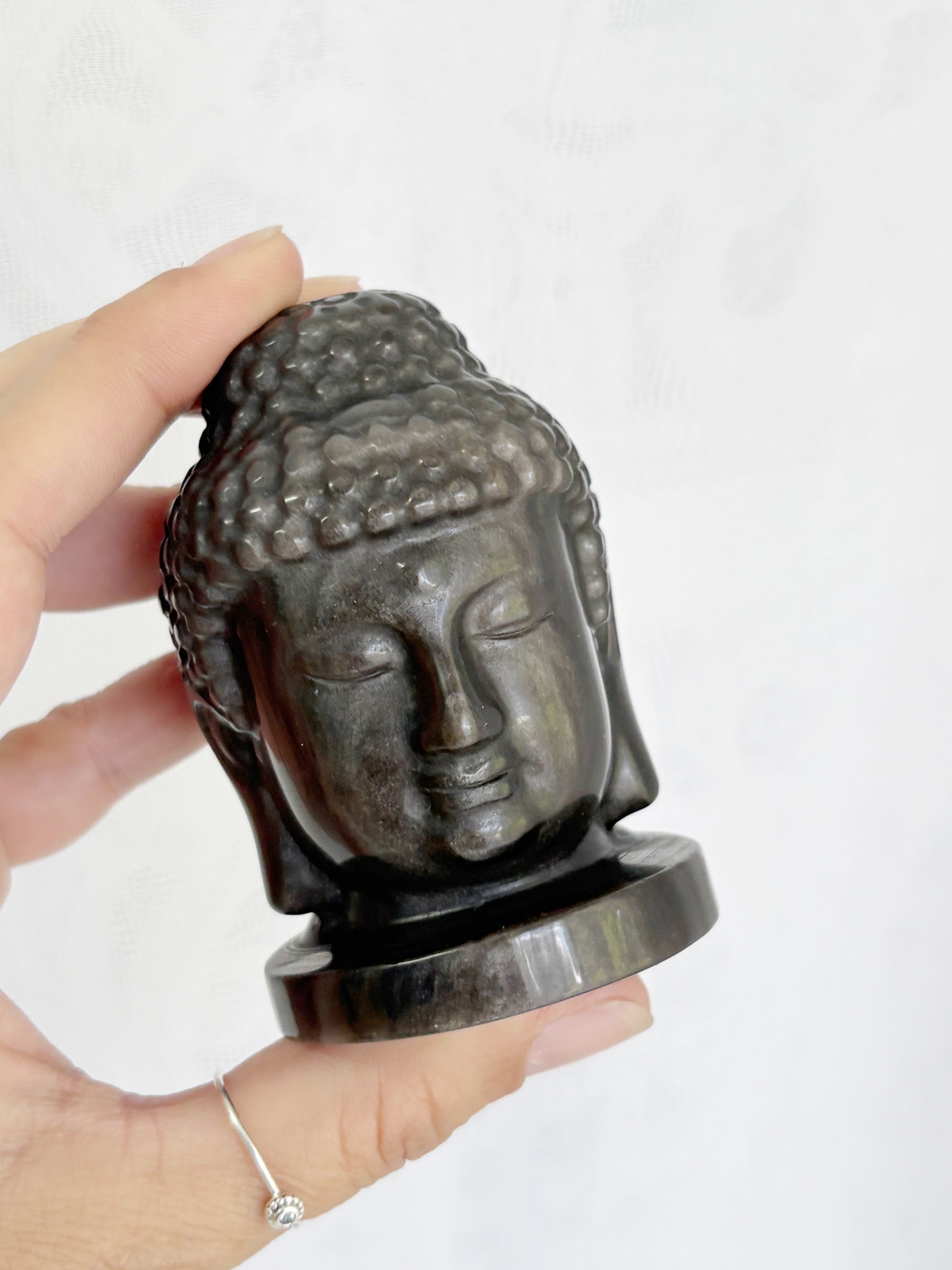 SILVER SHEEN OBSIDIAN BUDDHA HEAD