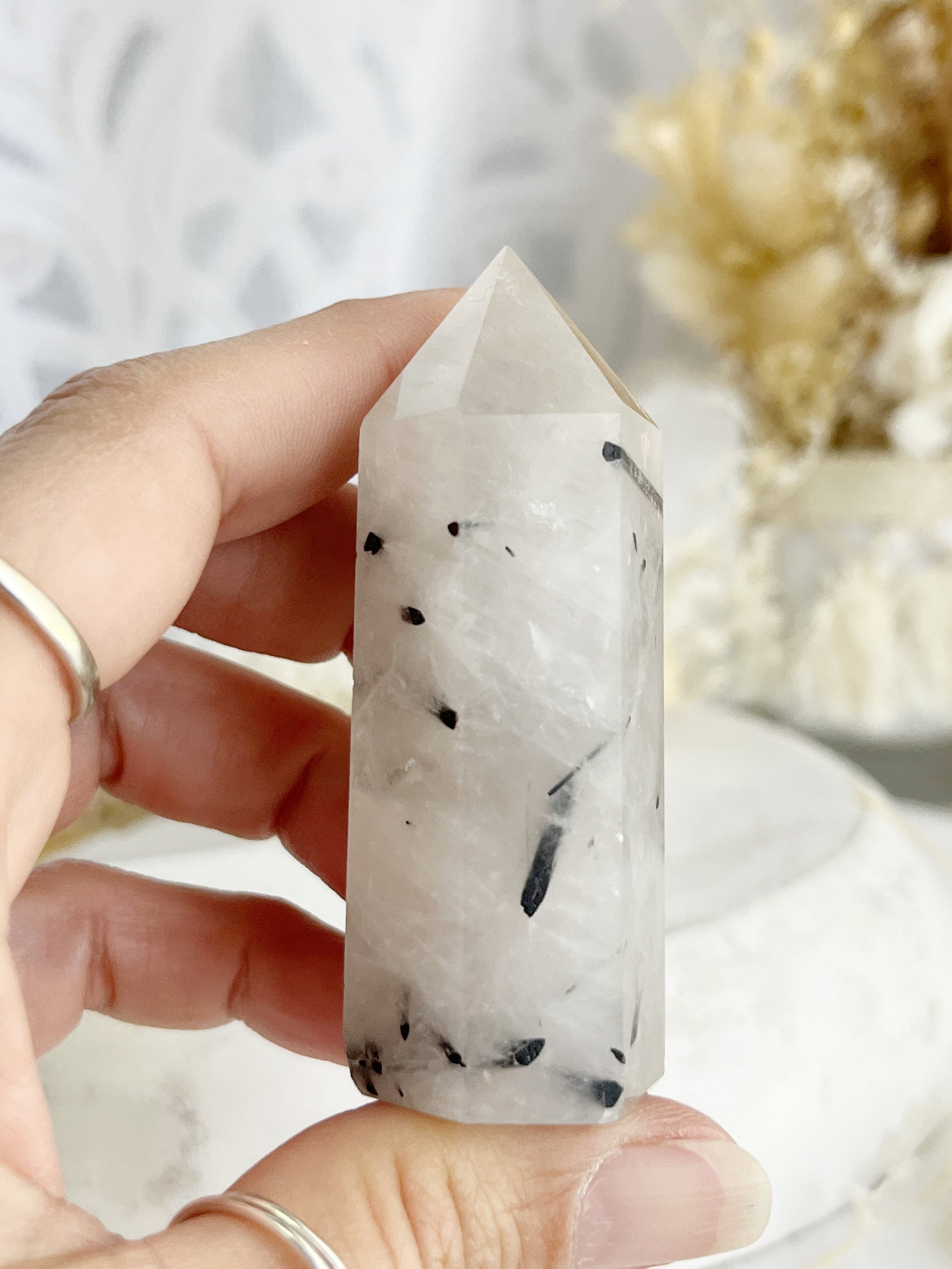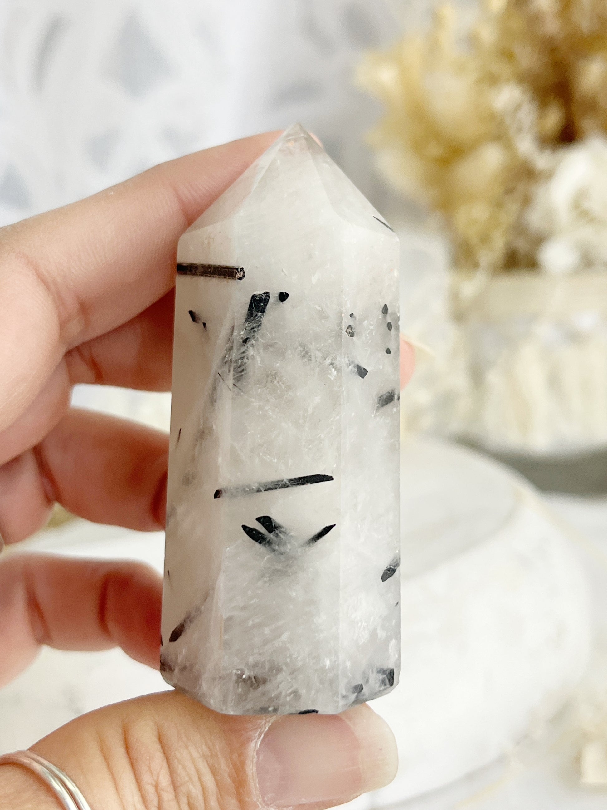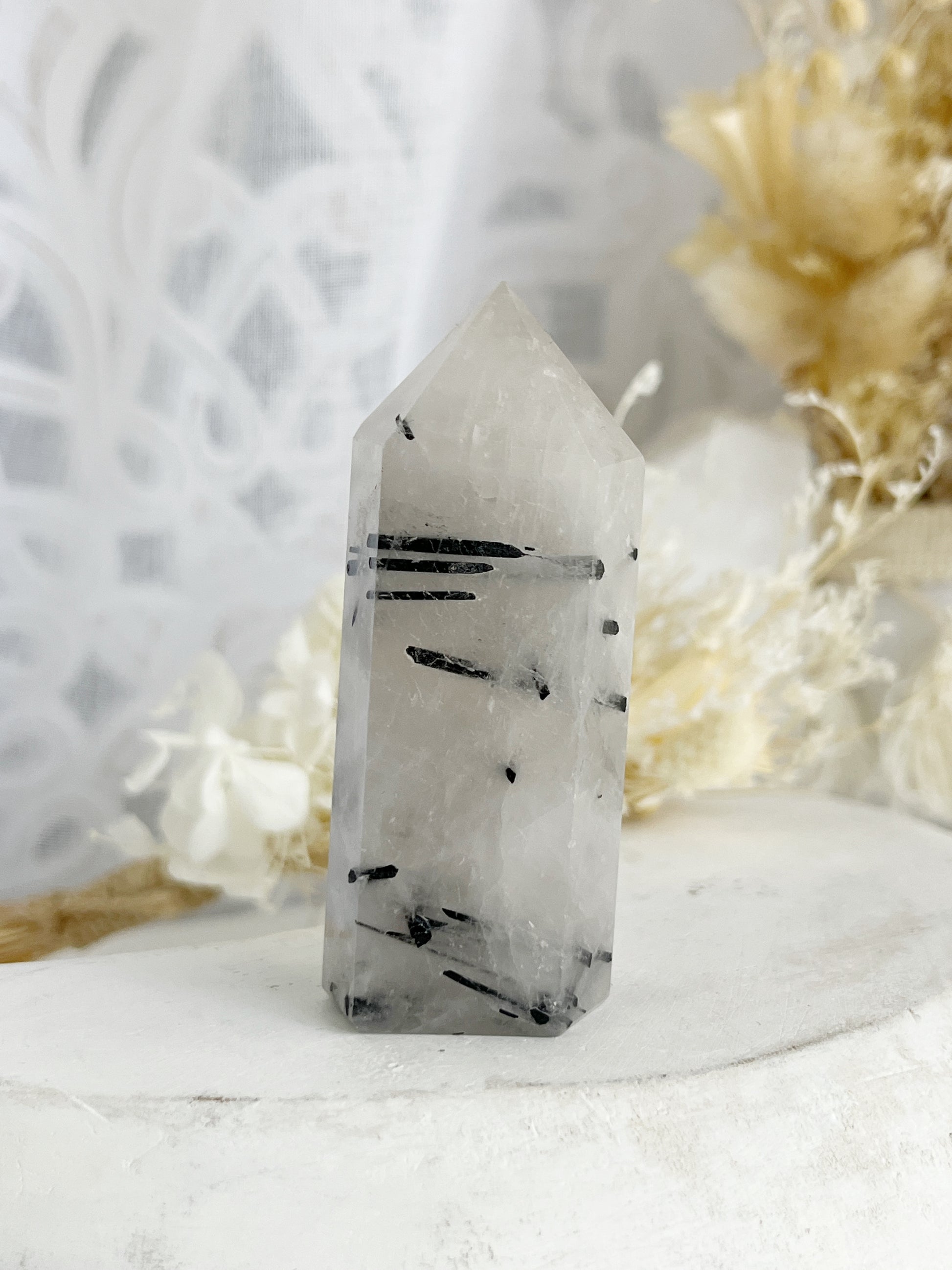 Tourmalinated Quartz is a powerful combination of Tourmaline + Clear Quartz offering protection + grounding while restoring harmony and tranquility. Purifying negative energy, Tourmalinated Quartz also helps to eliminate negative patterns and encourages detoxification of the body. It balances yin/yang energy, and assists in problem solving + releasing tension.
