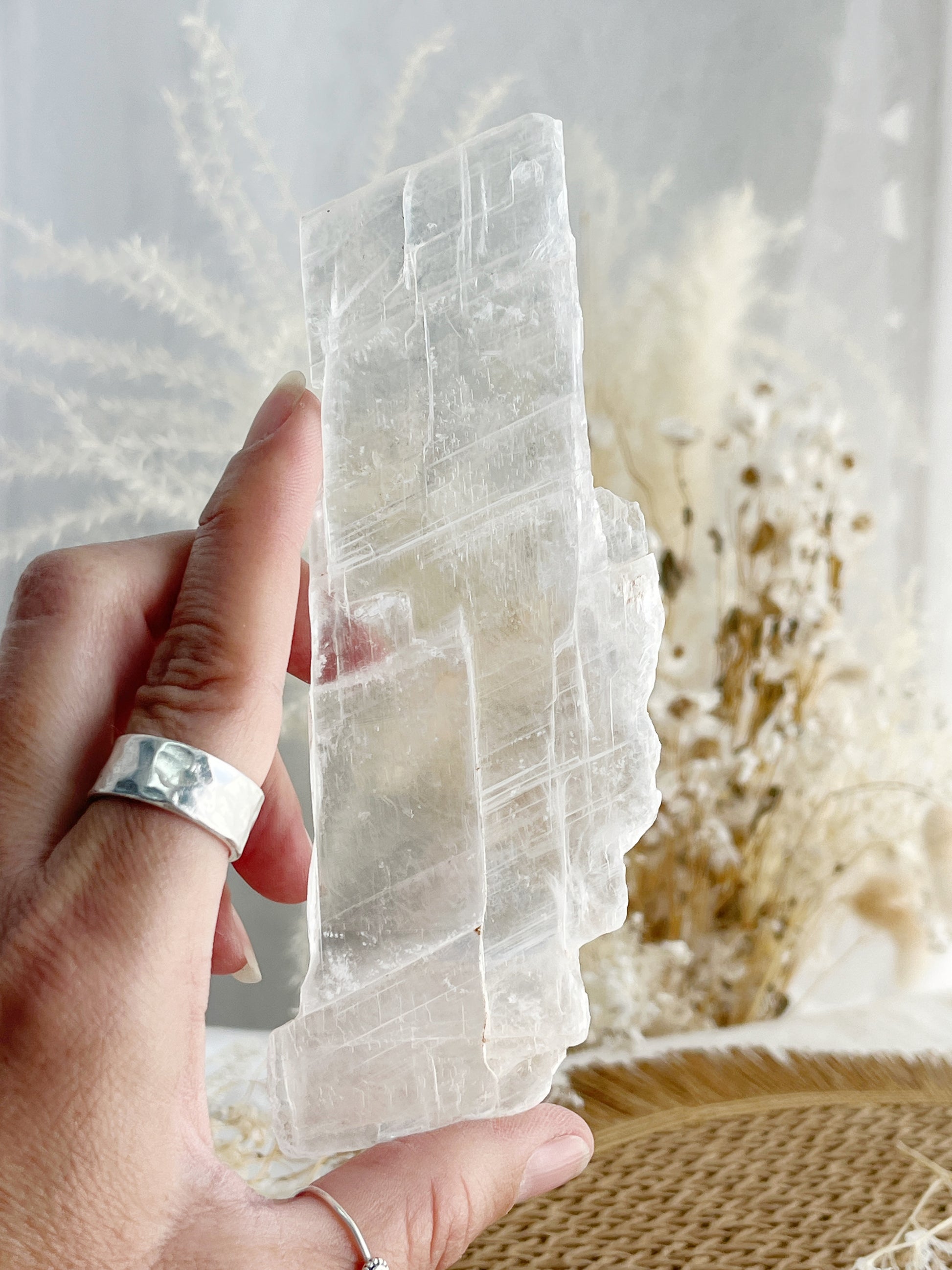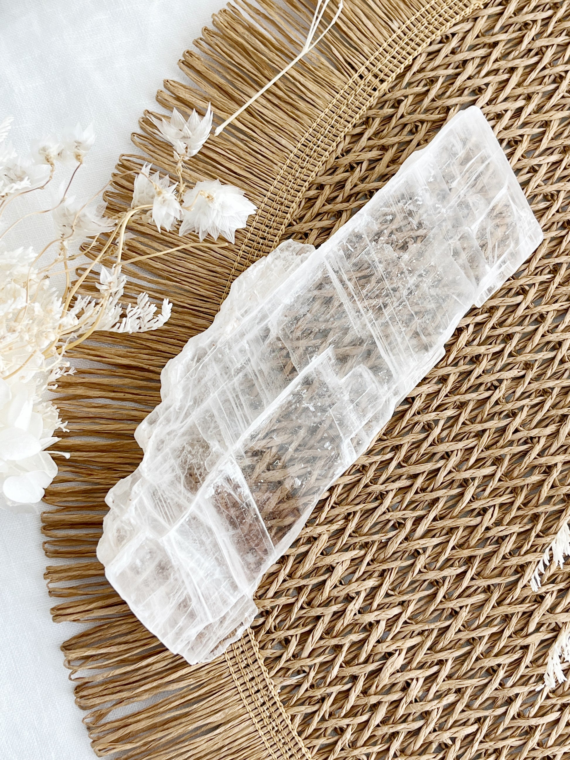Selenite is known for connecting to the third eye, crown, transpersonal and Etheric chakras. Through radiating light energy, it promotes purity and honesty. It forces the person holding it to be honest with themselves. Selenite clears negativity and blockages in the body, aura, its surroundings + other crystals. It can align the chakras and raise awareness to a higher plane while deepening psychic abilities. It can be used with other stones to amplify the stones energies while cleansing + charging them. Selenite raises your vibration + can assist in connection with the angelic realm.