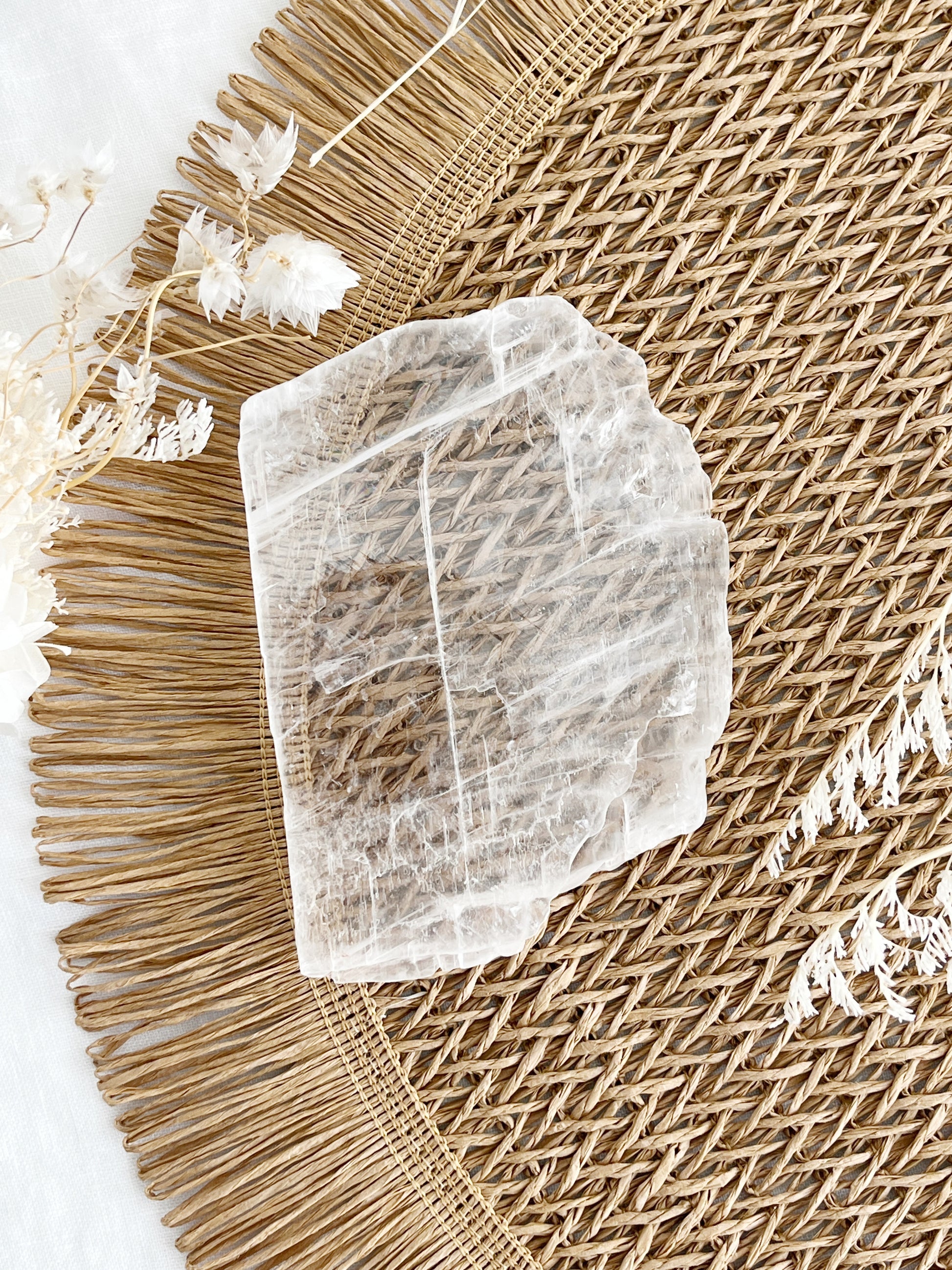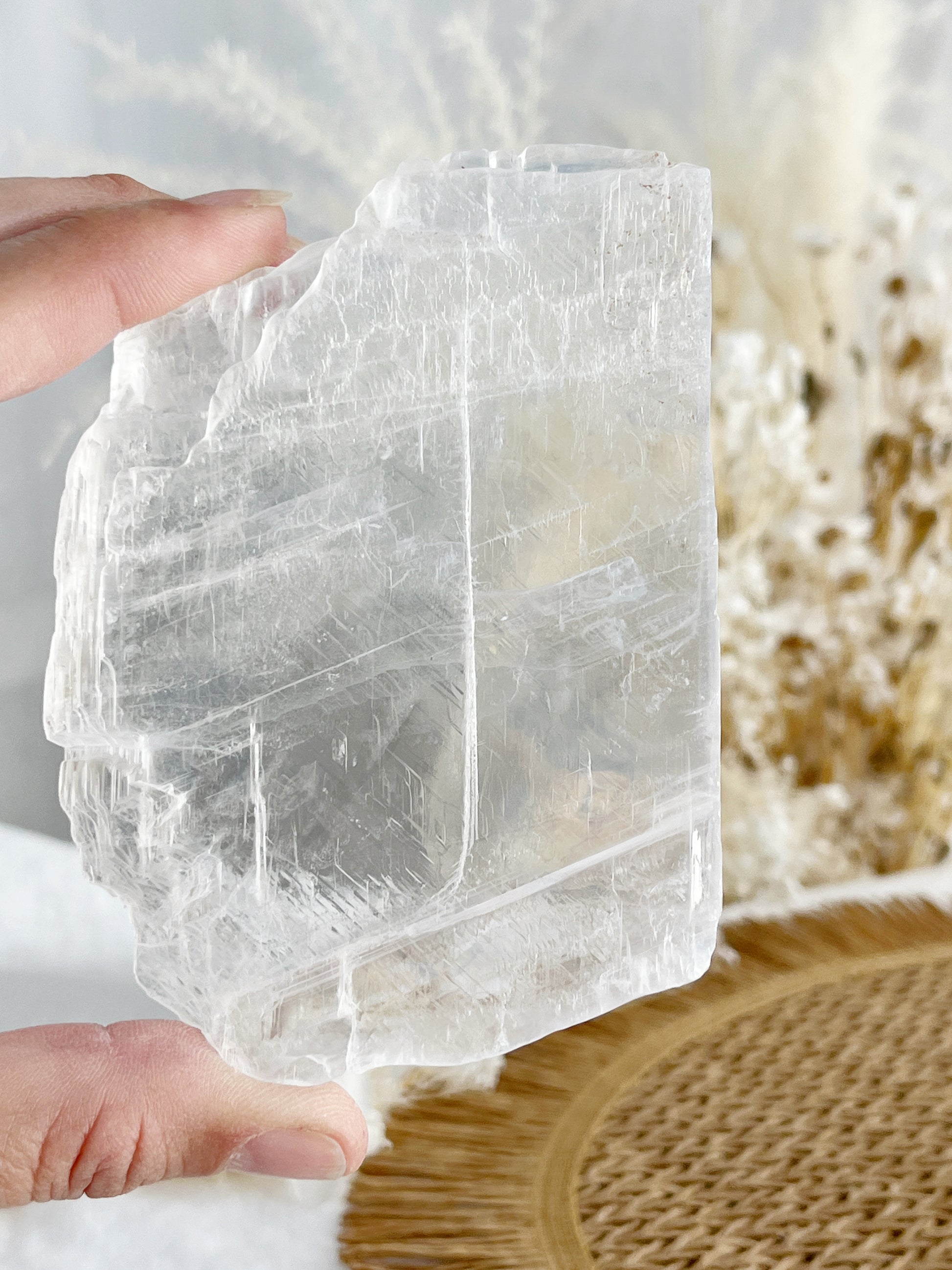 Selenite is known for connecting to the third eye, crown, transpersonal and Etheric chakras. Through radiating light energy, it promotes purity and honesty. It forces the person holding it to be honest with themselves. Selenite clears negativity and blockages in the body, aura, its surroundings + other crystals. It can align the chakras and raise awareness to a higher plane while deepening psychic abilities. It can be used with other stones to amplify the stones energies while cleansing + charging them. Selenite raises your vibration + can assist in connection with the angelic realm.