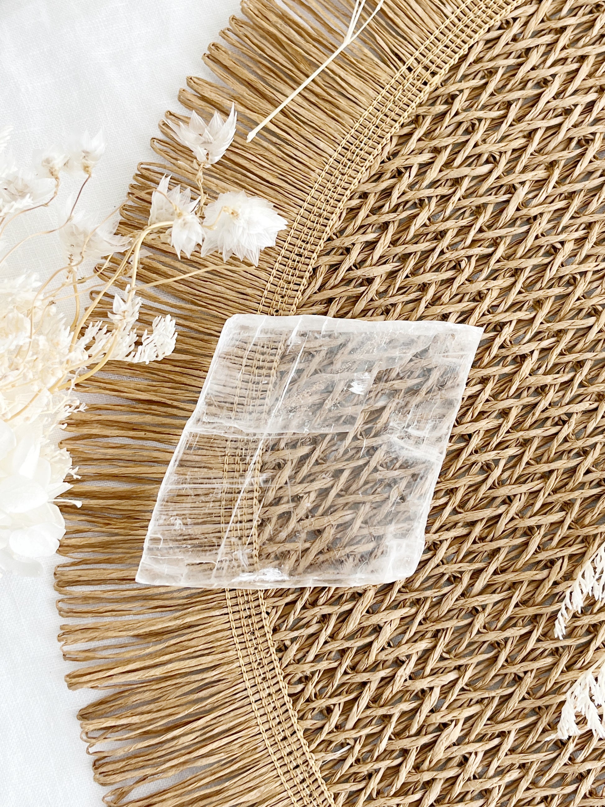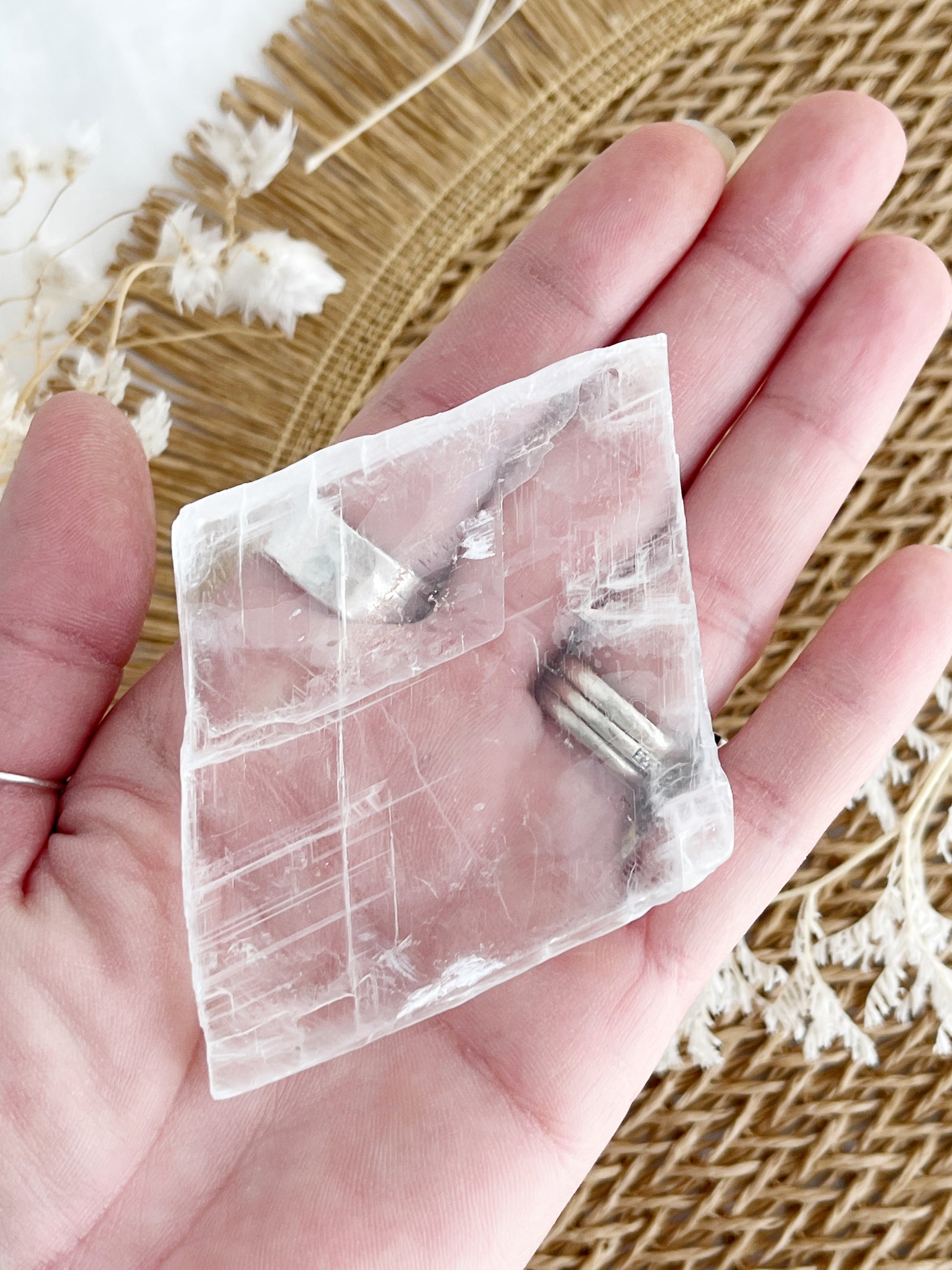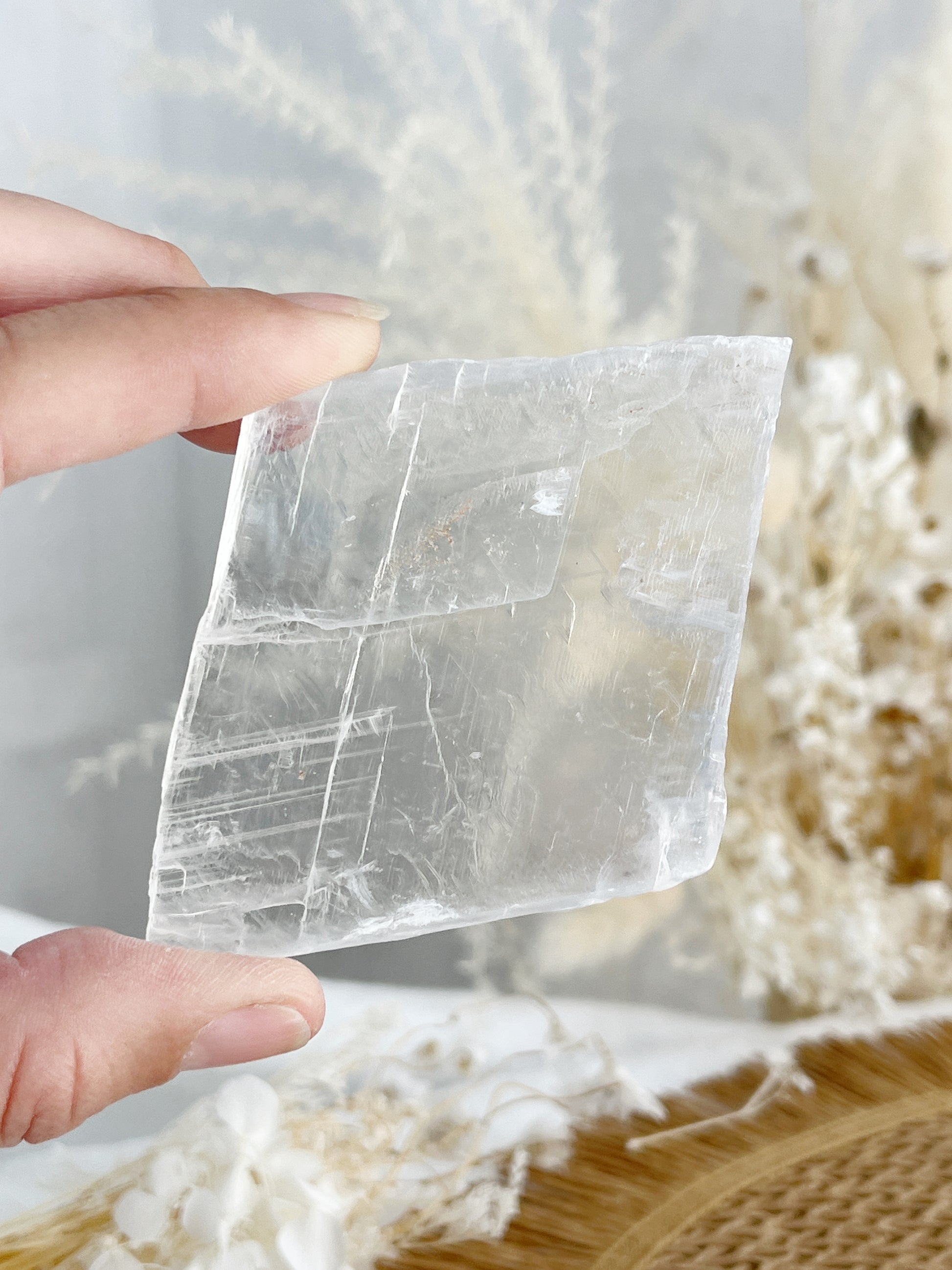 Selenite is known for connecting to the third eye, crown, transpersonal and Etheric chakras. Through radiating light energy, it promotes purity and honesty. It forces the person holding it to be honest with themselves. Selenite clears negativity and blockages in the body, aura, its surroundings + other crystals. It can align the chakras and raise awareness to a higher plane while deepening psychic abilities. It can be used with other stones to amplify the stones energies while cleansing + charging them. Selenite raises your vibration + can assist in connection with the angelic realm.
